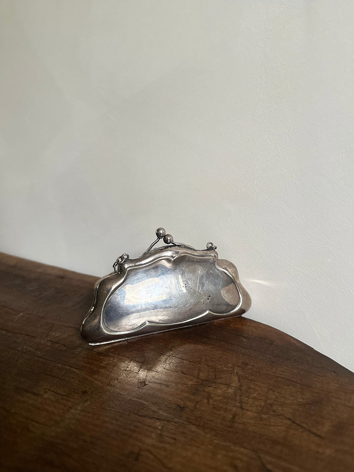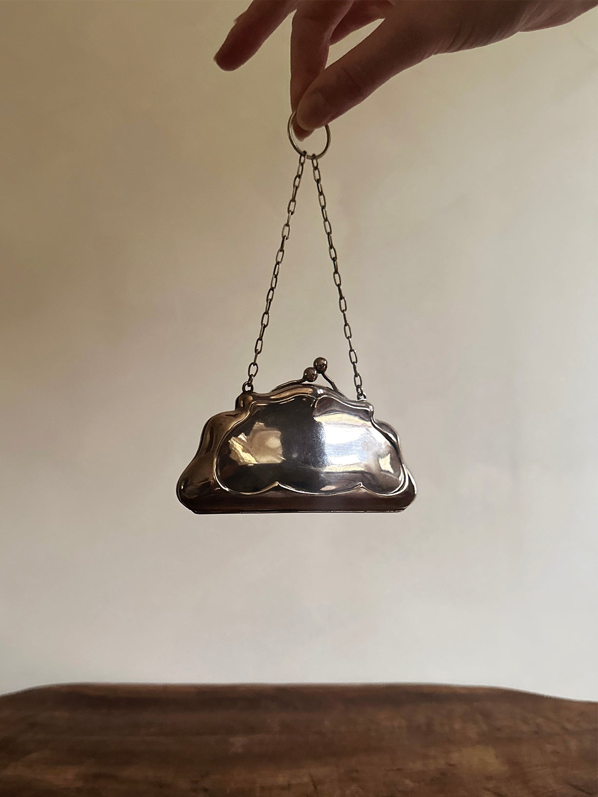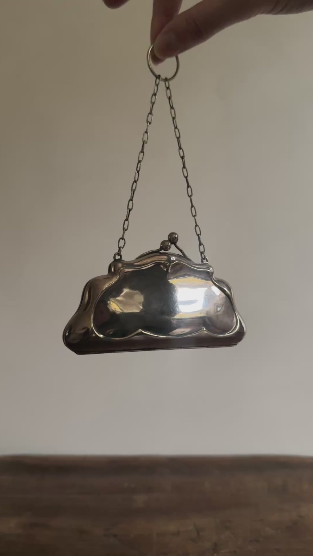 Origin: an antique silver concertina coin purse, circa 1918. Size: 2.75" high (7" w chain) x 5" wide x 0.75" deep
