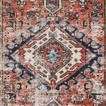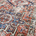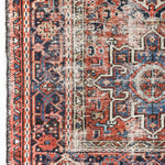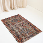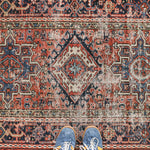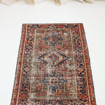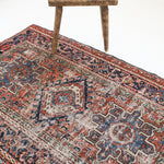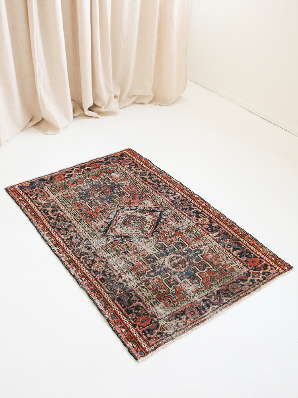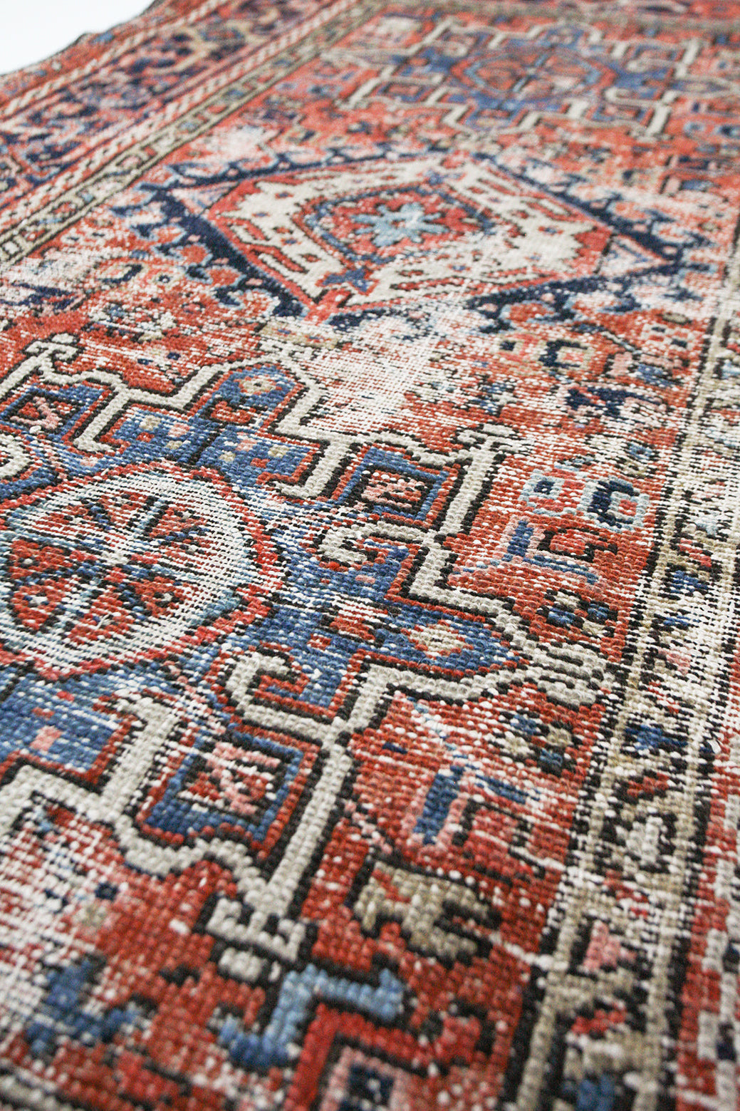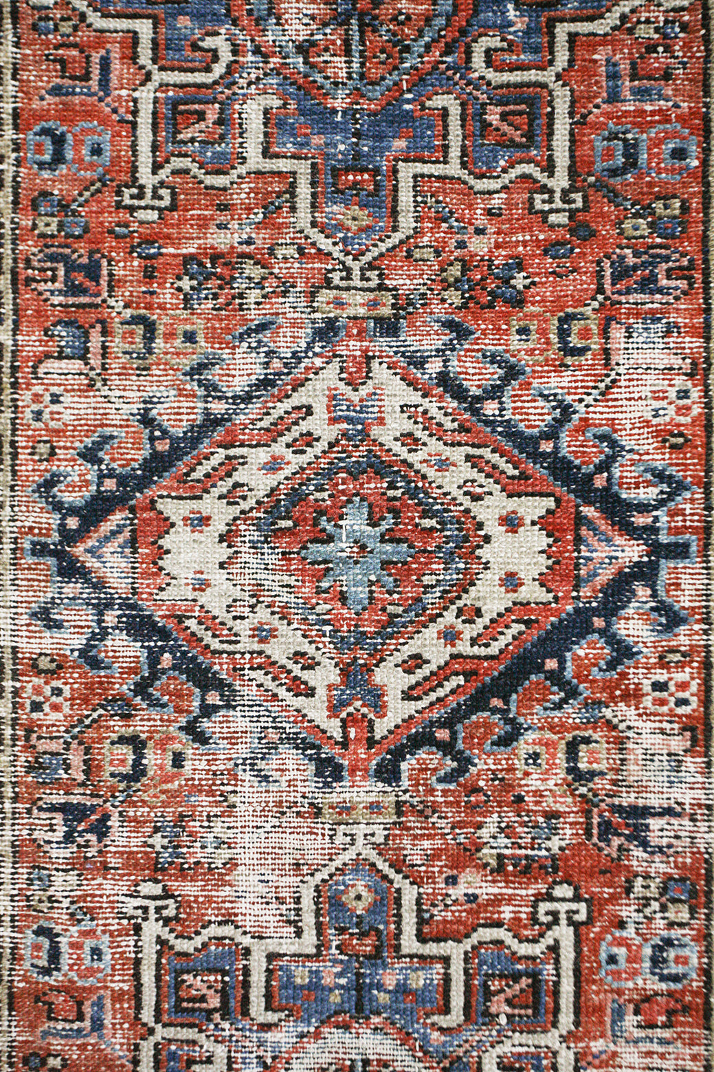 Karajah is a village just outside of Heriz, hence the visual similarities. It's said to be the oldest of all rug-weaving regions and is known for its hardwearing, all-wool carpets. Typically, the pattern comprises a coral-colored palette with three geometric medallions; two eight-pointed stars and a central medallion with latch-hooked contours (the white hooks surrounding navy blue in this case).