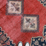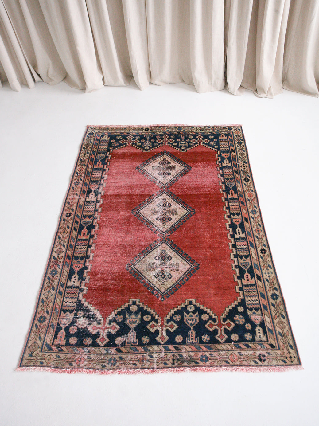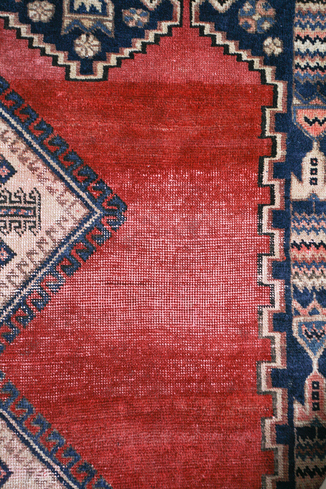 The Afshar tribe migrated to Iran in the 11th century, and settled in the southern regions. Their distinctive rug designs are known for geometric patterns characterised by a central medallion and oversized corner details. Nature-inspired elements like paisley (representing leaves) and stylised bird motifs can often be spotted in these rugs, and the palettes are typically warm and earthy, reflecting the surrounding landscape. The reds were achieved with madder root and the deep blues with indigo plants, while light brown accents are often undyed camel hair.
