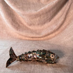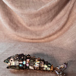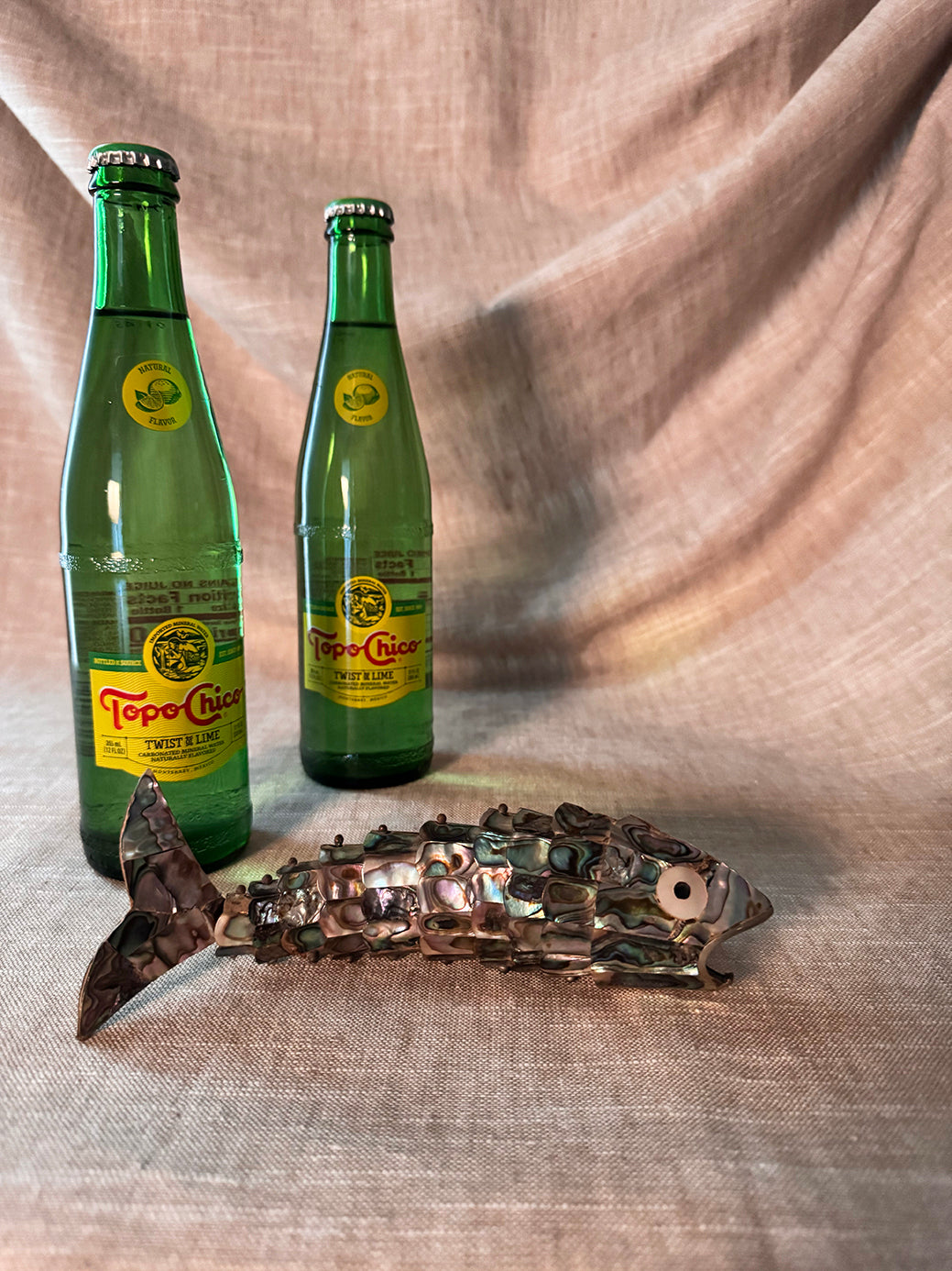 Origin: a vintage abalone shell and brass bottle opener by Los Castillo. Made in Taxco, Mexico, circa 1960. Please note the few missing pieces around the tail end; it does not affect the overall beauty, nor the function of the piece. Size: 7.5" long x 3" wide