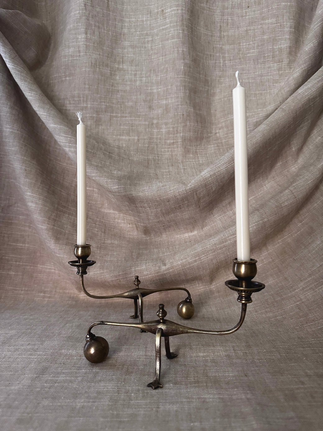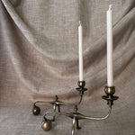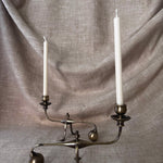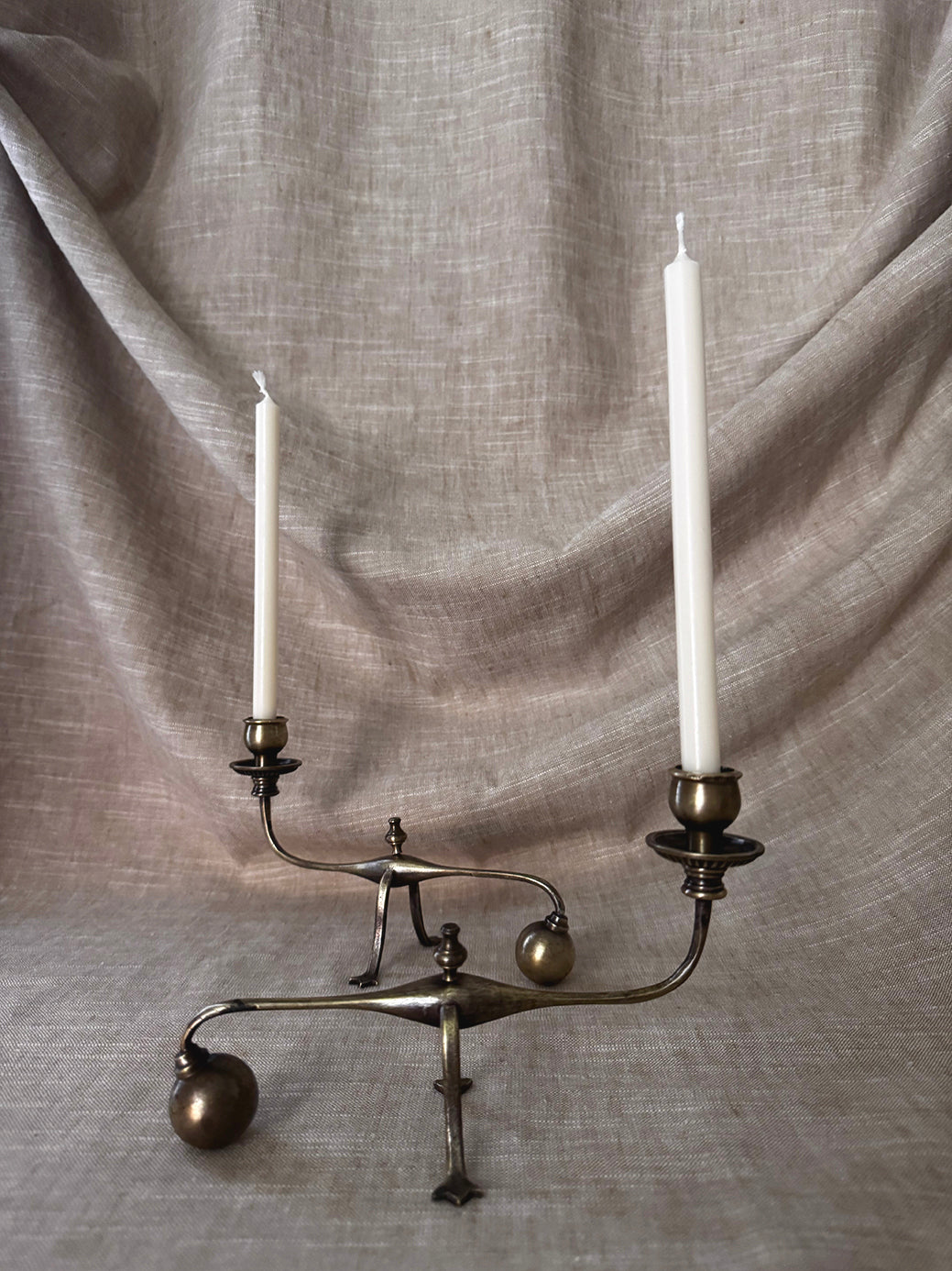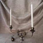 Origin: pair of William Arthur Benson Piano Cannon Ball brass cantilever candlestick holders Size: 5" tall x 8" wide