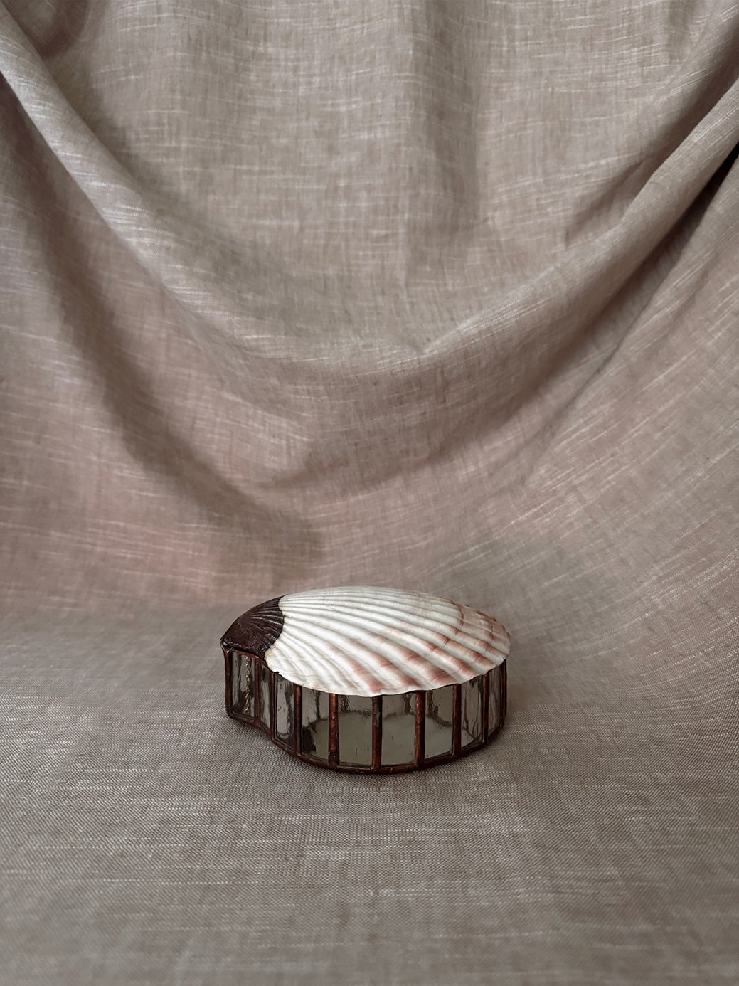 Origin: a decorative trinket box with a clamshell lid and glass base