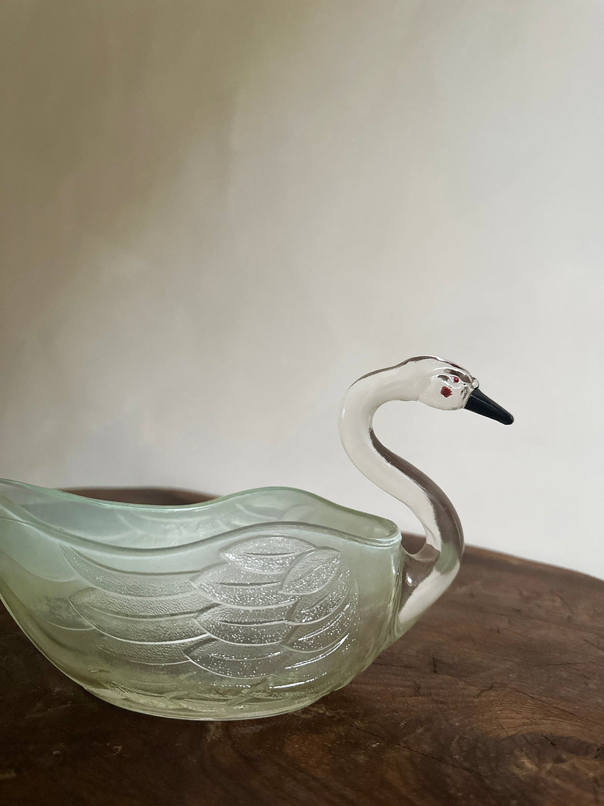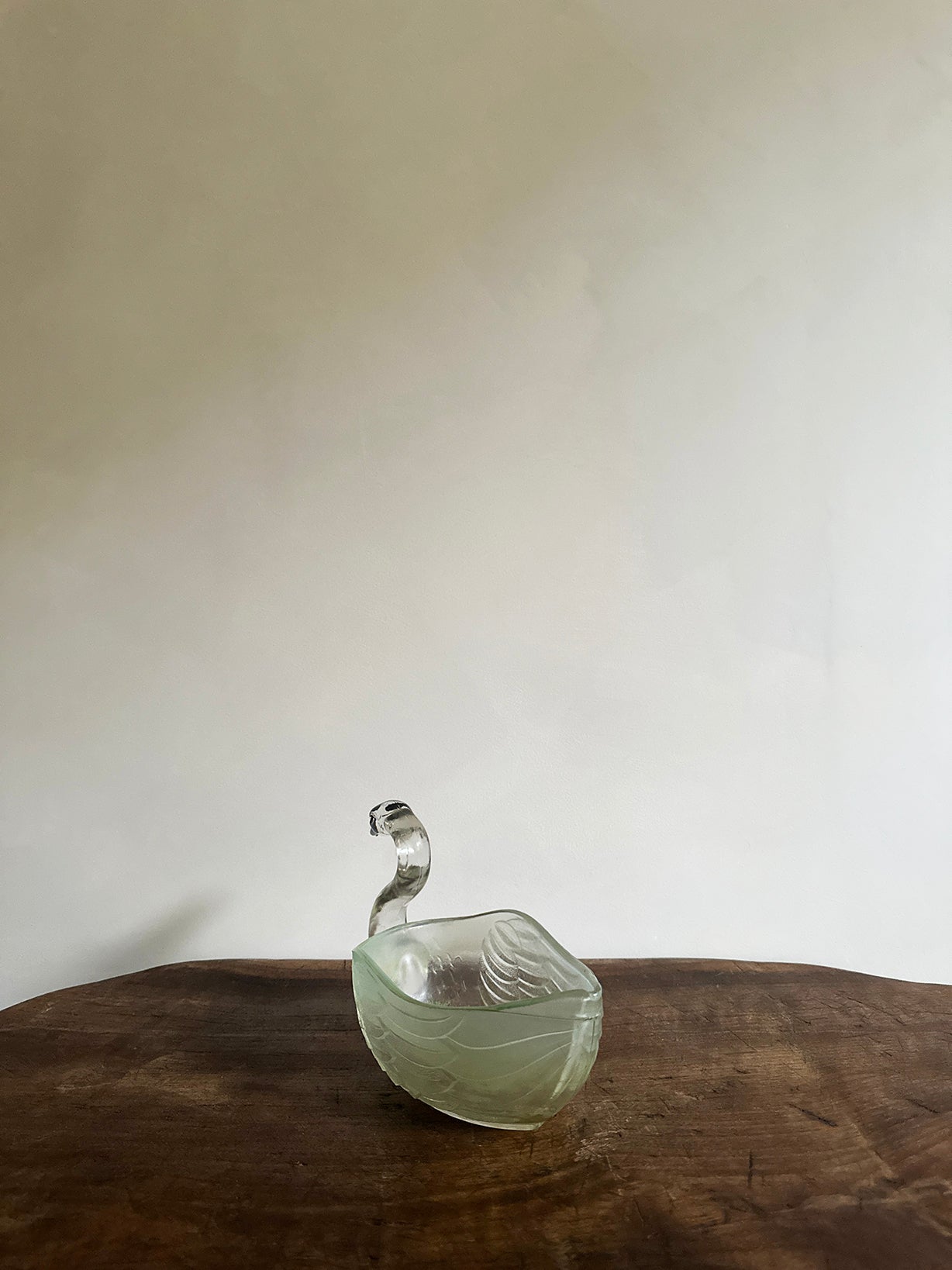 Origin: a vintage candy dish, circa 1930, in engraved frosted glass. Size: 5.25" high x 8.5" wide x 4" deep