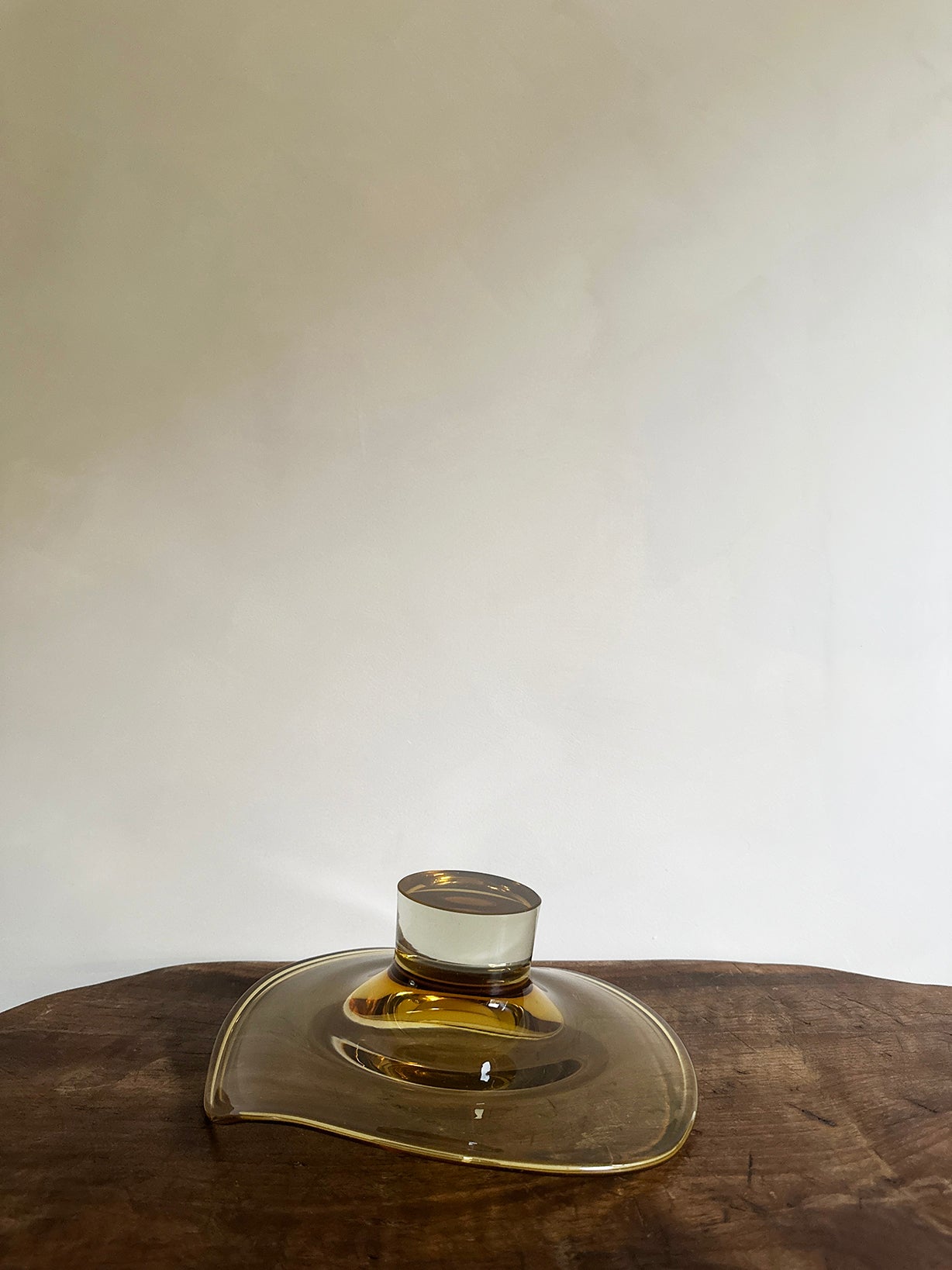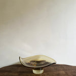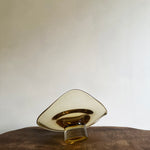 Origin: An amber glass dish with an organic, softly curved bowl on a cylindrical foot. Size: 4.75" high x 10" wide