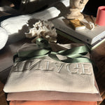 In an effort to make getting dressed easier (anyone else?) I’ve been thinking about a capsule wardrobe and my “3 words” a la Allison Bornstein. One of my words is “undone,” which basically means I love a sweatshirt with lots of OTT jewelry. My fav sweatshirts feel old and are drapey. So we made a fun one and I love how it’s come out. We’ve snuck a small FL logo on the back, under the arm, just to remind you who loves you, baby!
