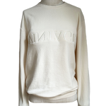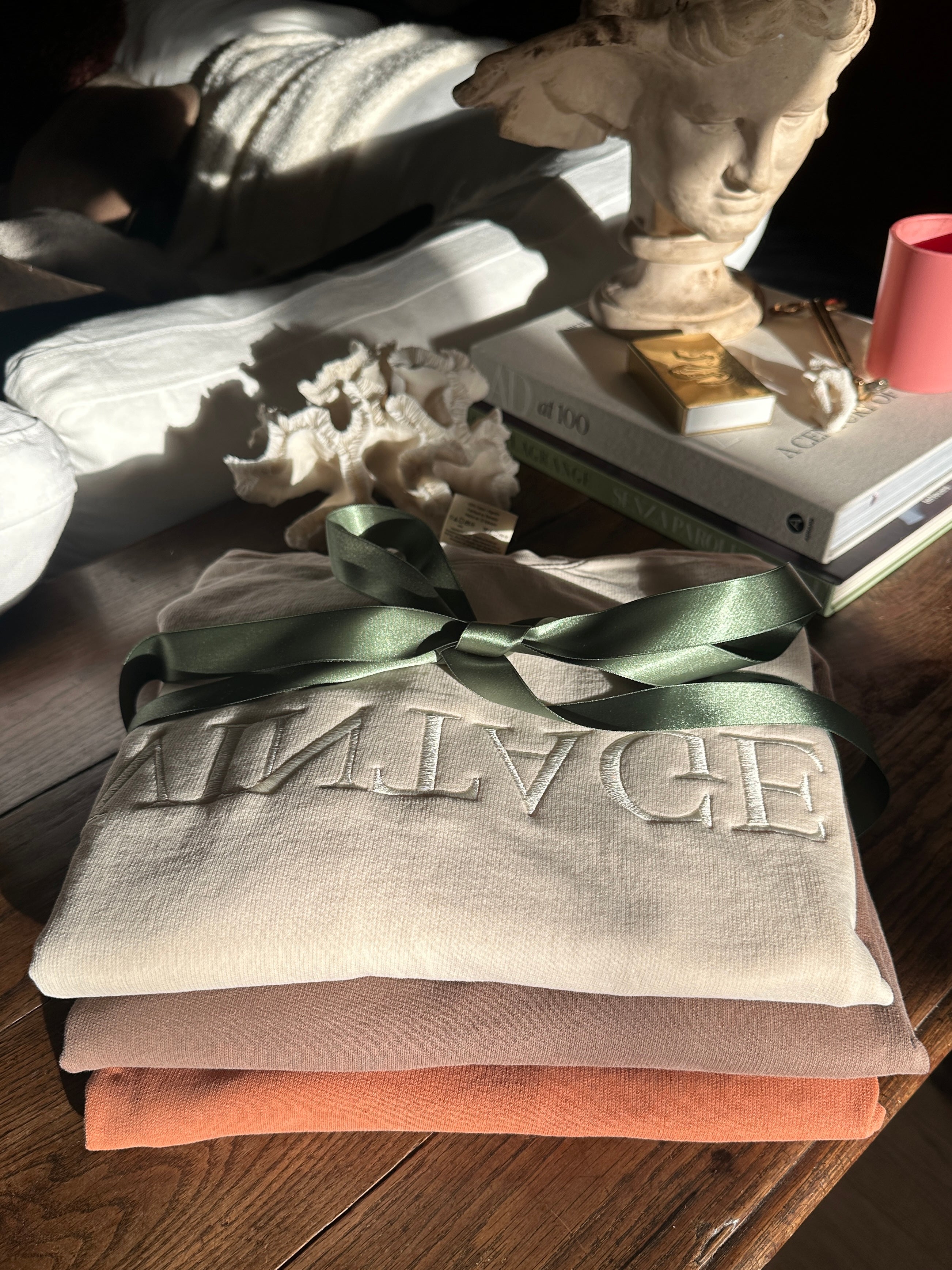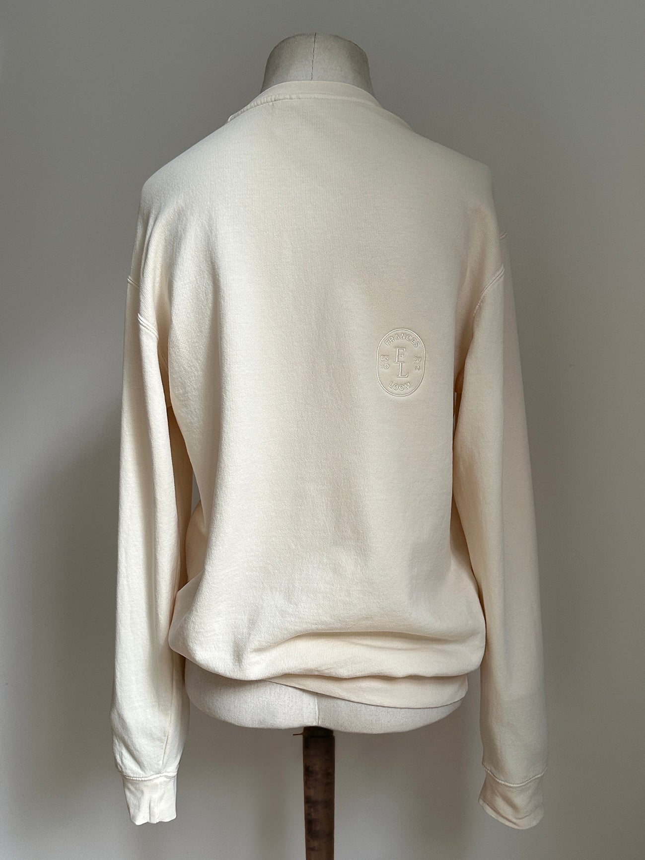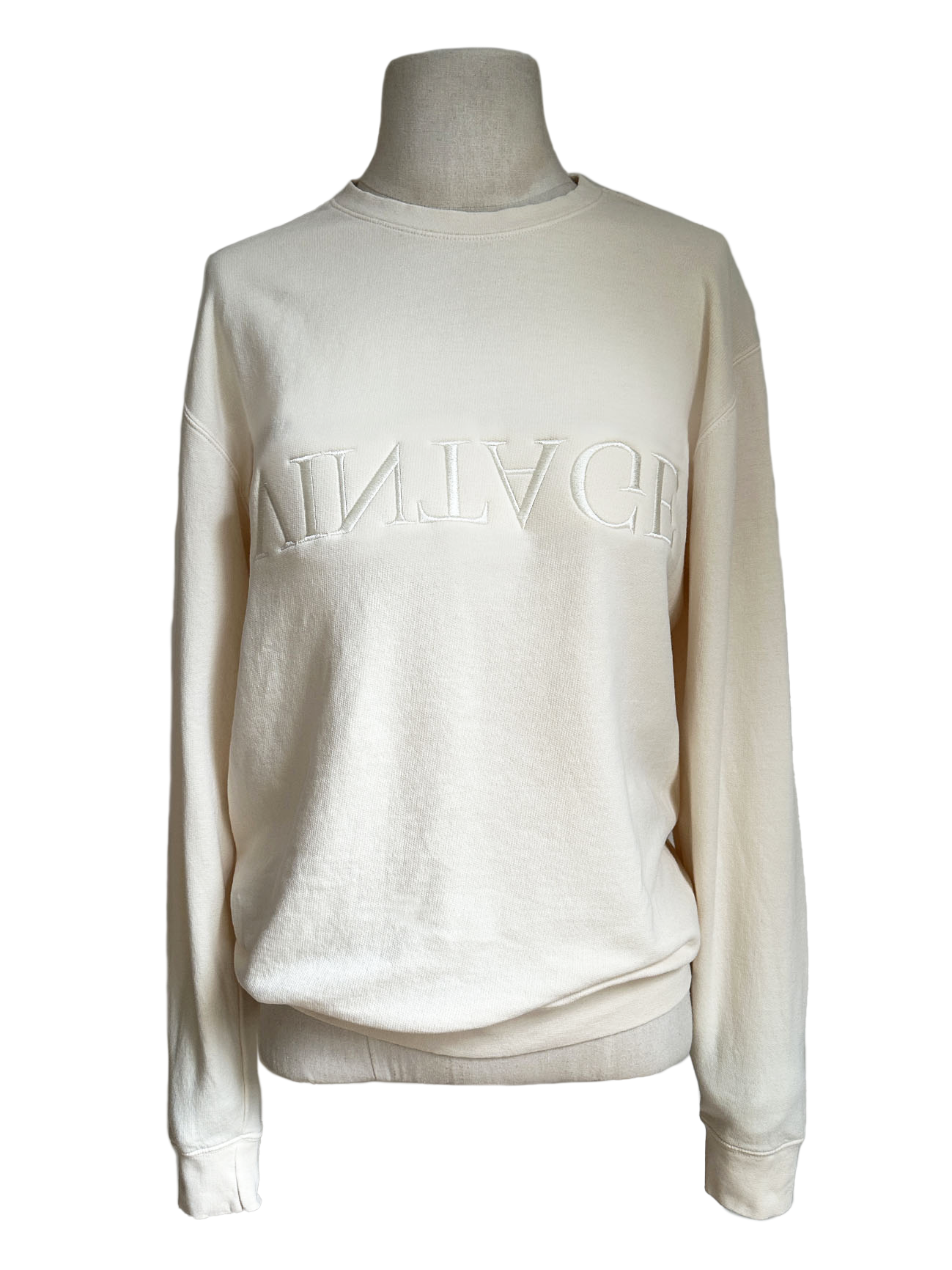 a comfy easy to wear sweatshirt in cream ivory with 'vintage' embroidered upside down for an abstract look