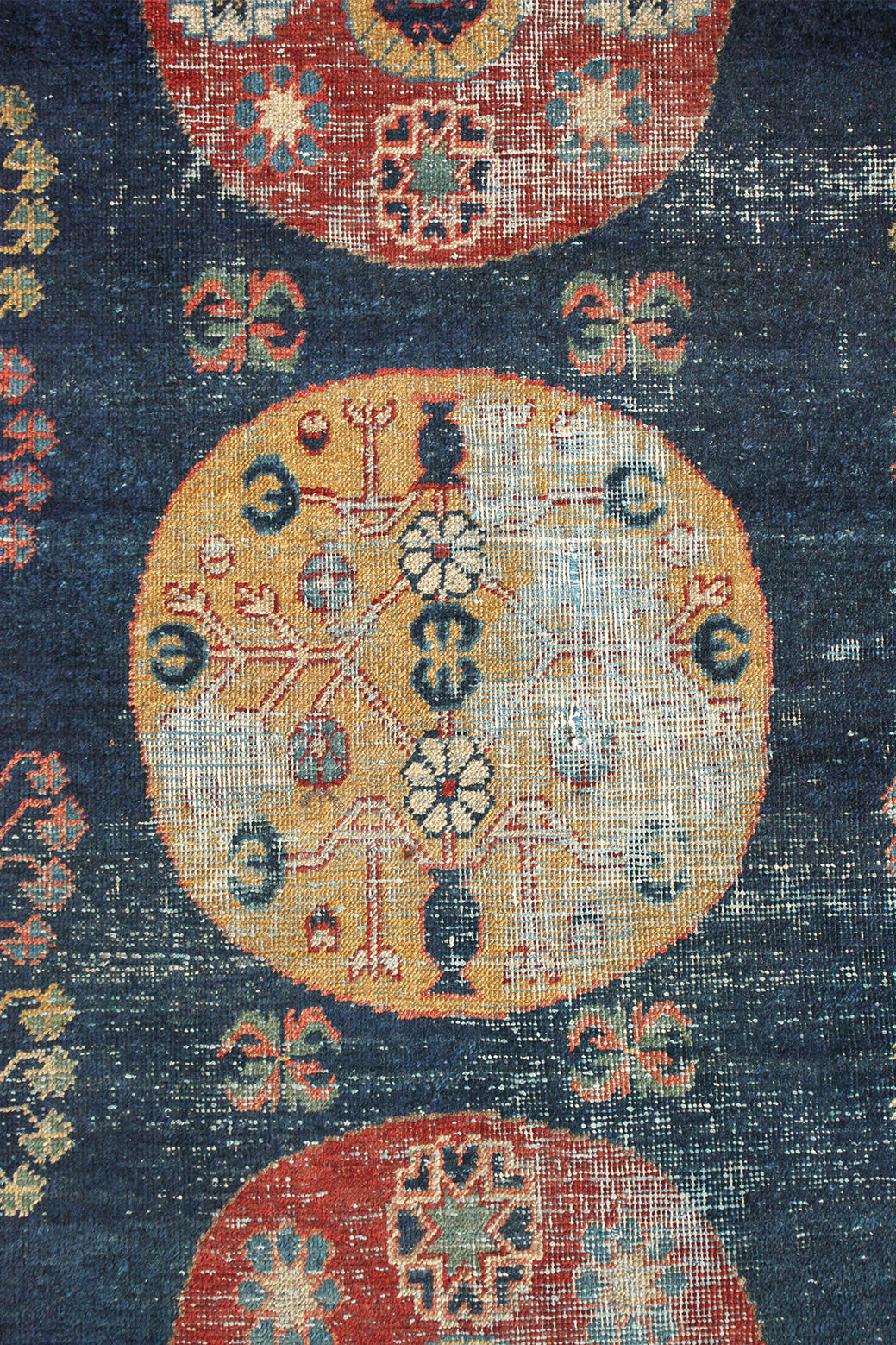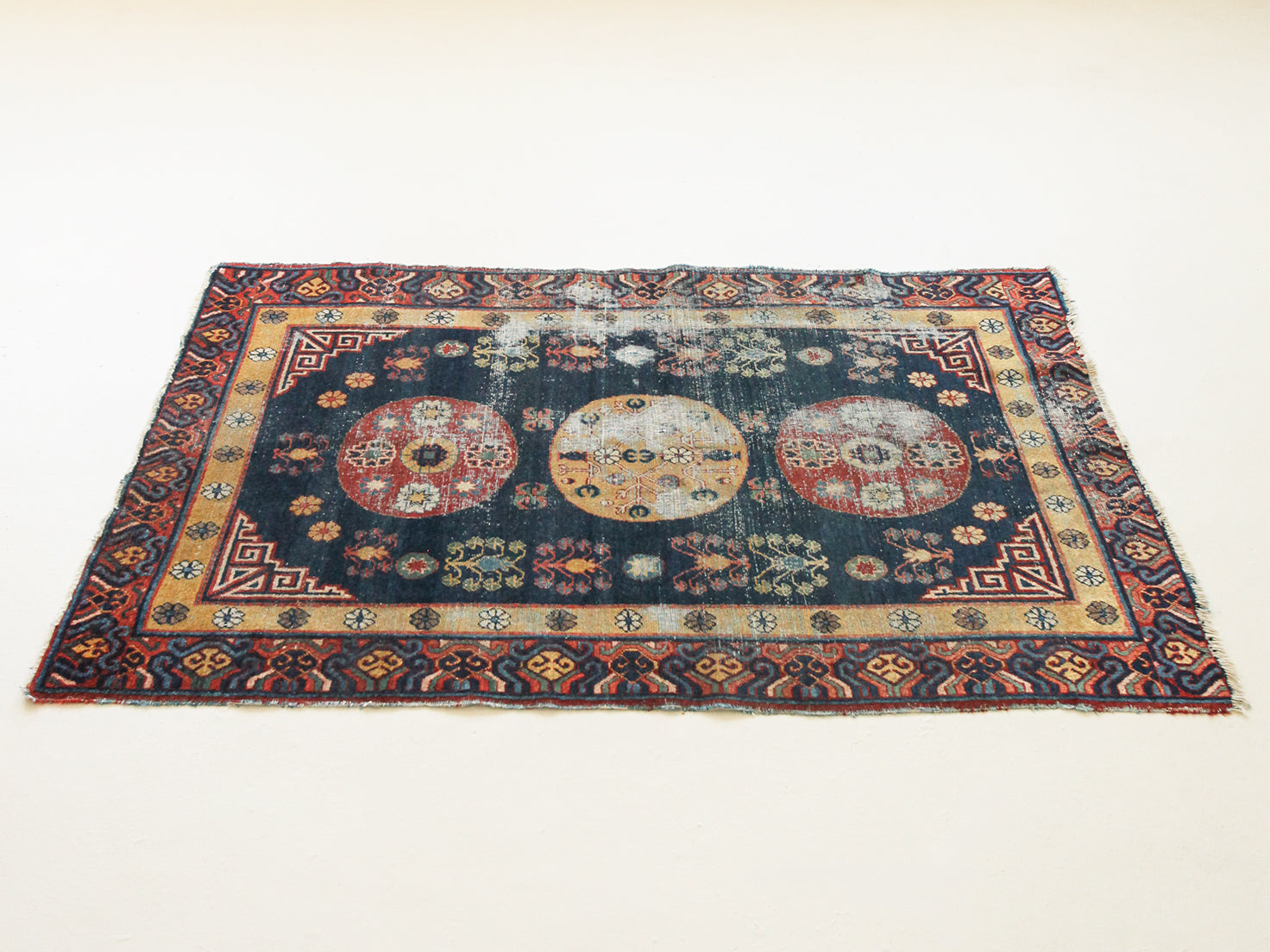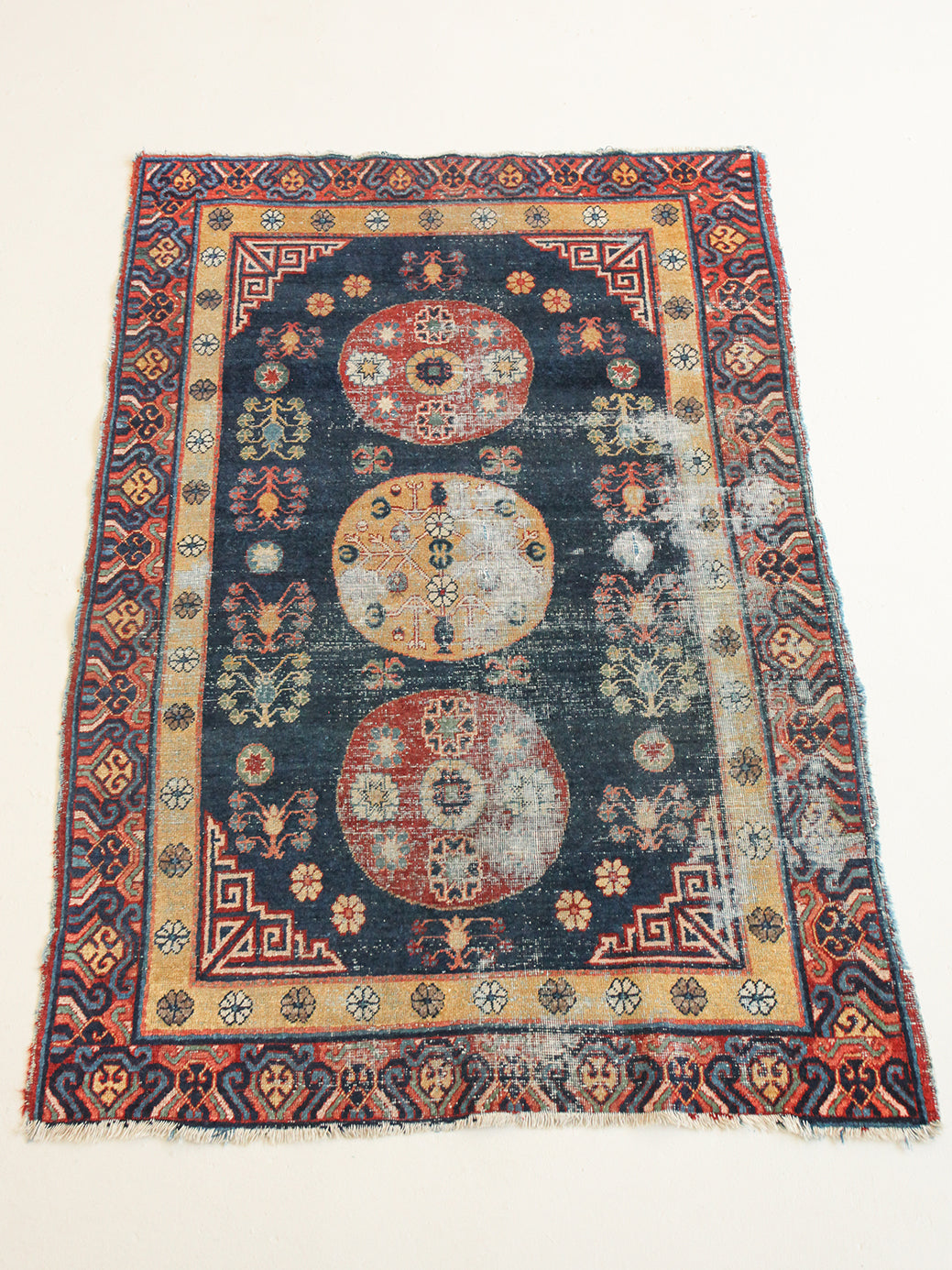 Antique Khotan rugs have a distinct charm that reflects their Silk Road heritage. Handwoven in the town of Khotan, in what is now western China, they blend Chinese, Persian, and Central Asian influences into one beautifully cohesive style. You’ll often see soft, faded palettes of peach and taupe paired with elegant medallions, pomegranate motifs, or repeating lattice patterns.