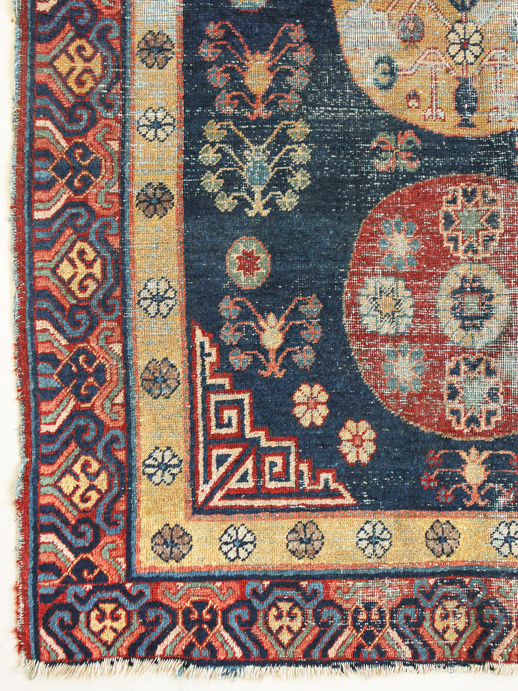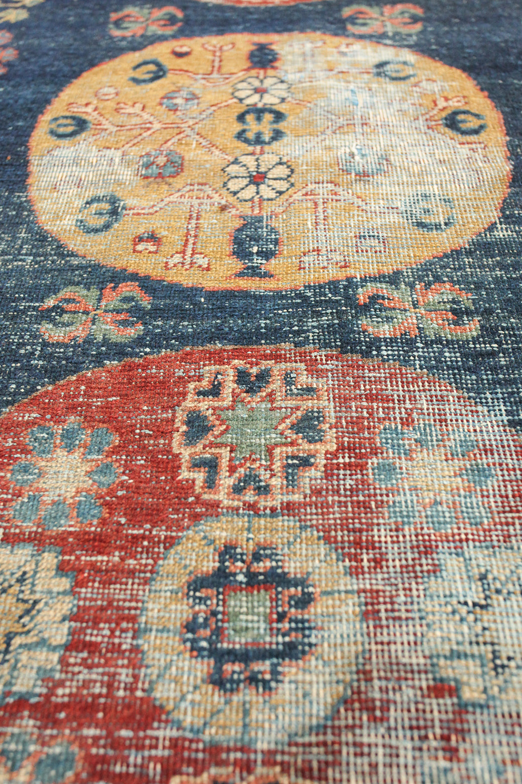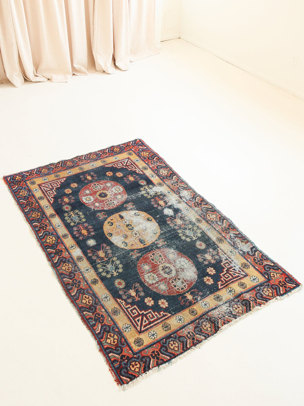 Antique Khotan rugs have a distinct charm that reflects their Silk Road heritage. Handwoven in the town of Khotan, in what is now western China, they blend Chinese, Persian, and Central Asian influences into one beautifully cohesive style. You’ll often see soft, faded palettes of peach and taupe paired with elegant medallions, pomegranate motifs, or repeating lattice patterns.