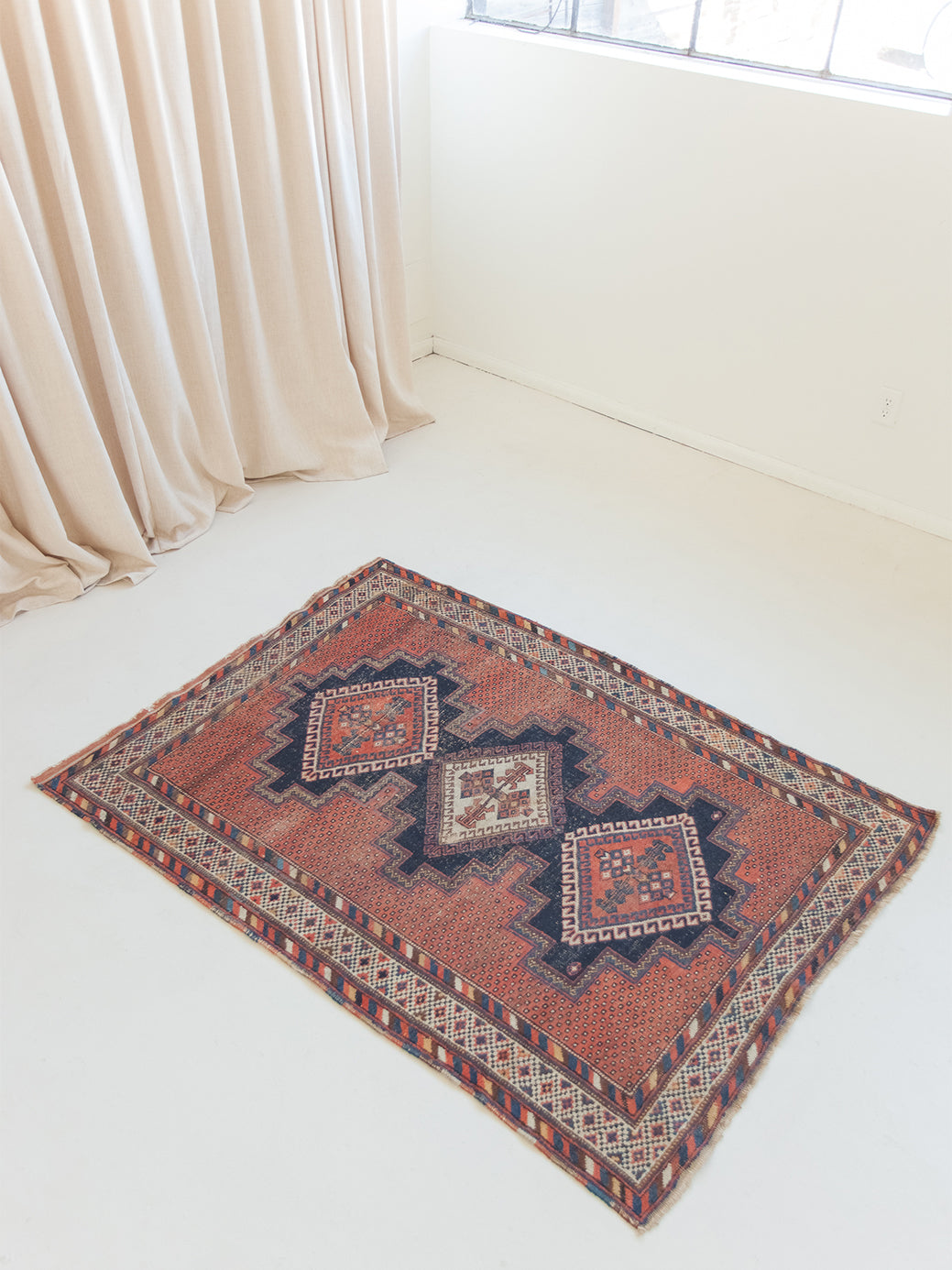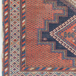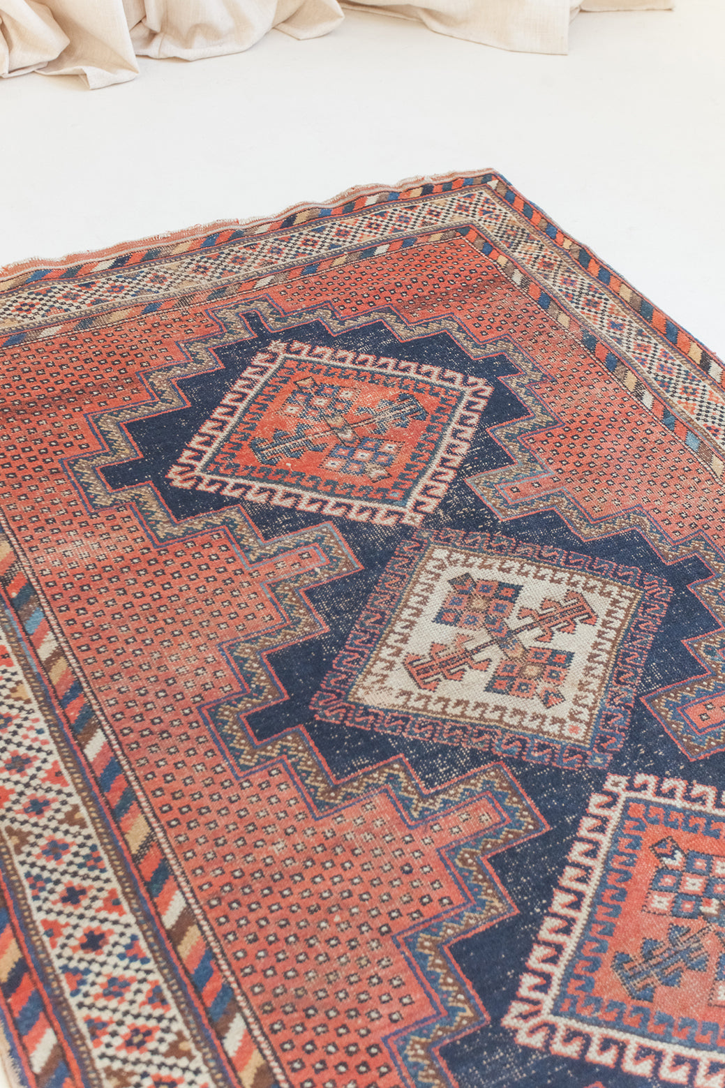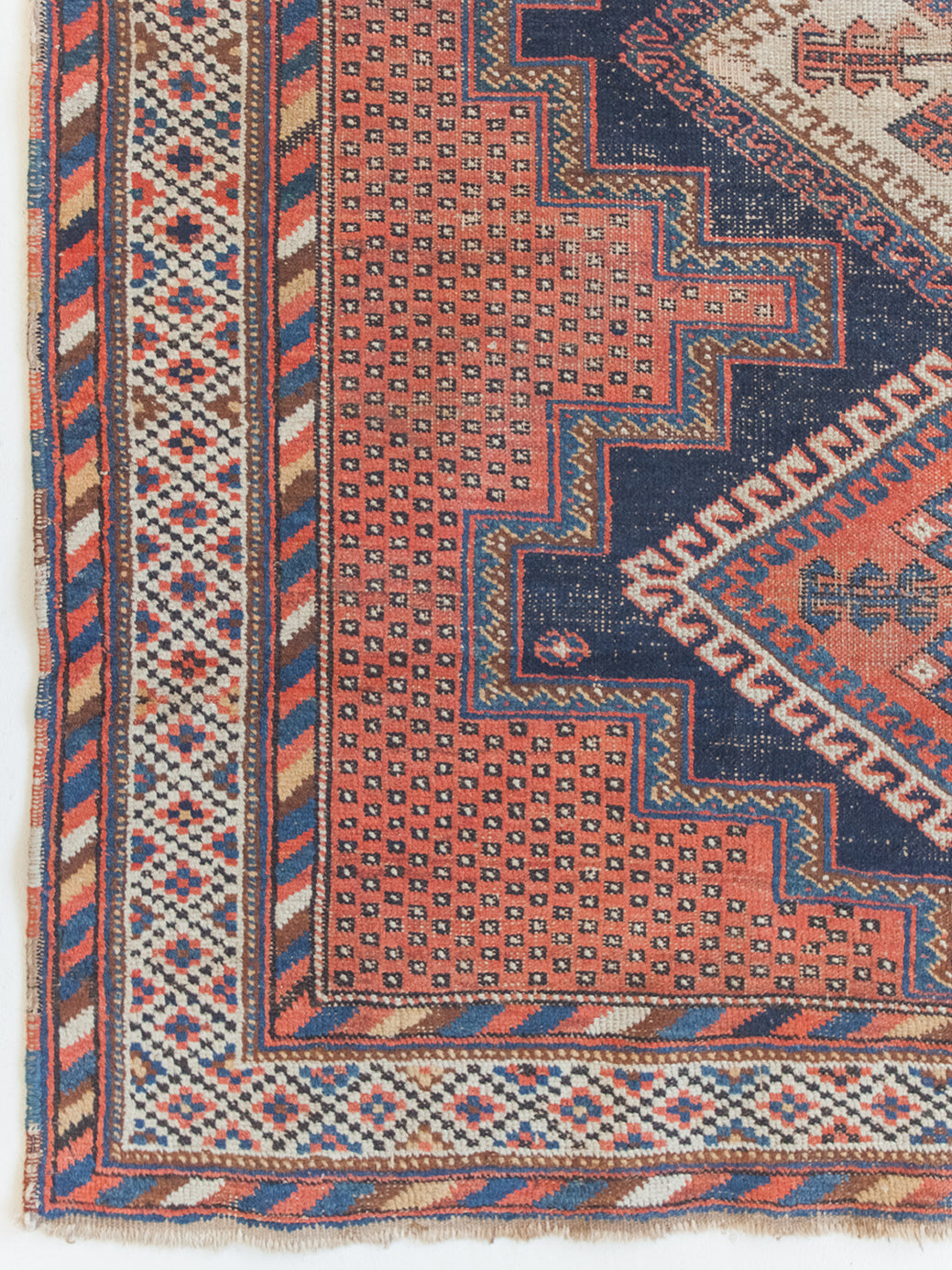 The Afshar tribe migrated to Iran in the 11th century and settled in the southern regions. Their distinctive rug designs are known for geometric patterns characterised by a central medallion and oversized corner details. Nature-inspired elements like paisley (representing leaves) and stylised bird motifs can often be spotted in these rugs, and the palettes are typically warm and earthy, reflecting the surrounding landscape. The reds were achieved with madder root, and the deep blues with indigo plants, while light brown accents are often undyed camel hair.