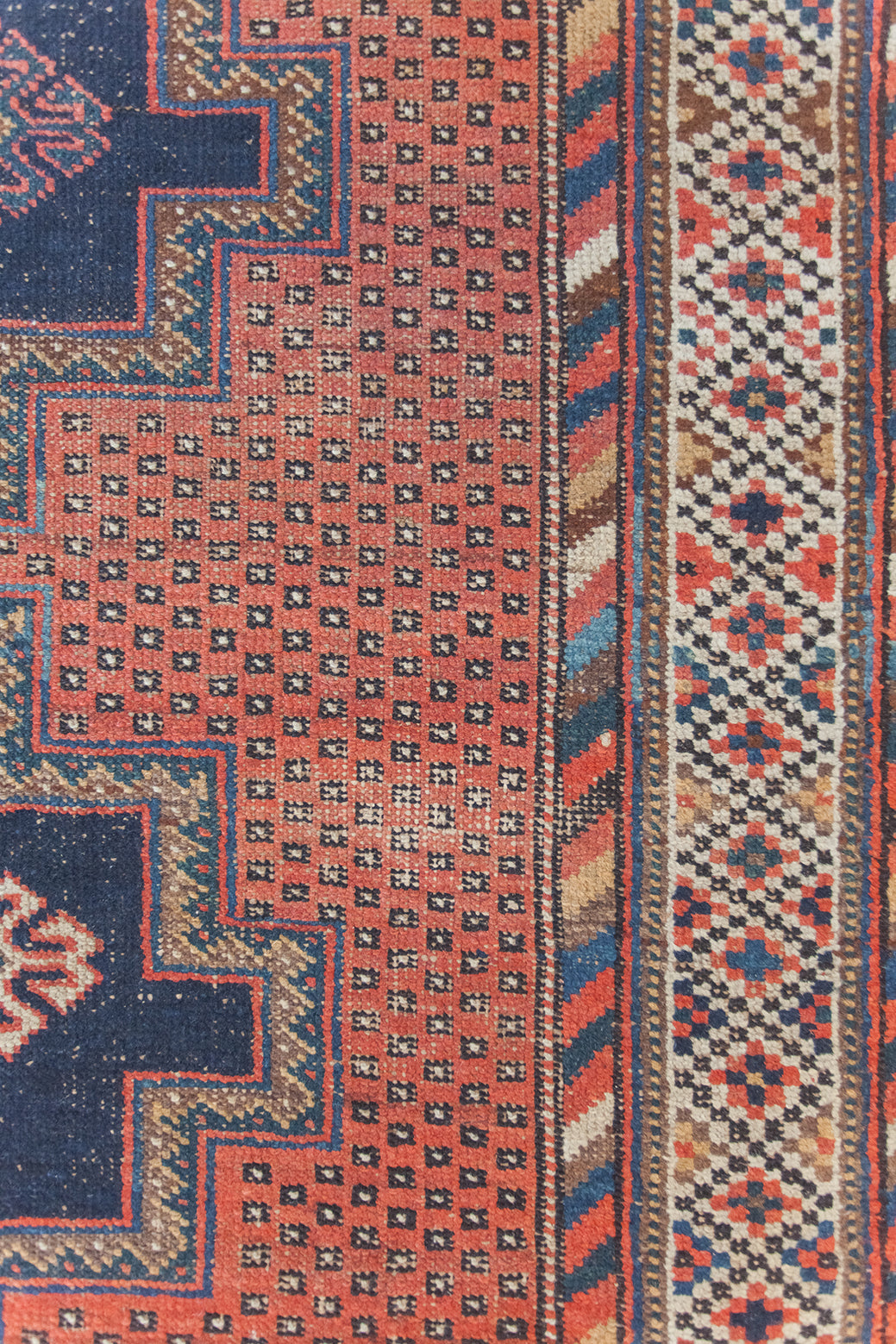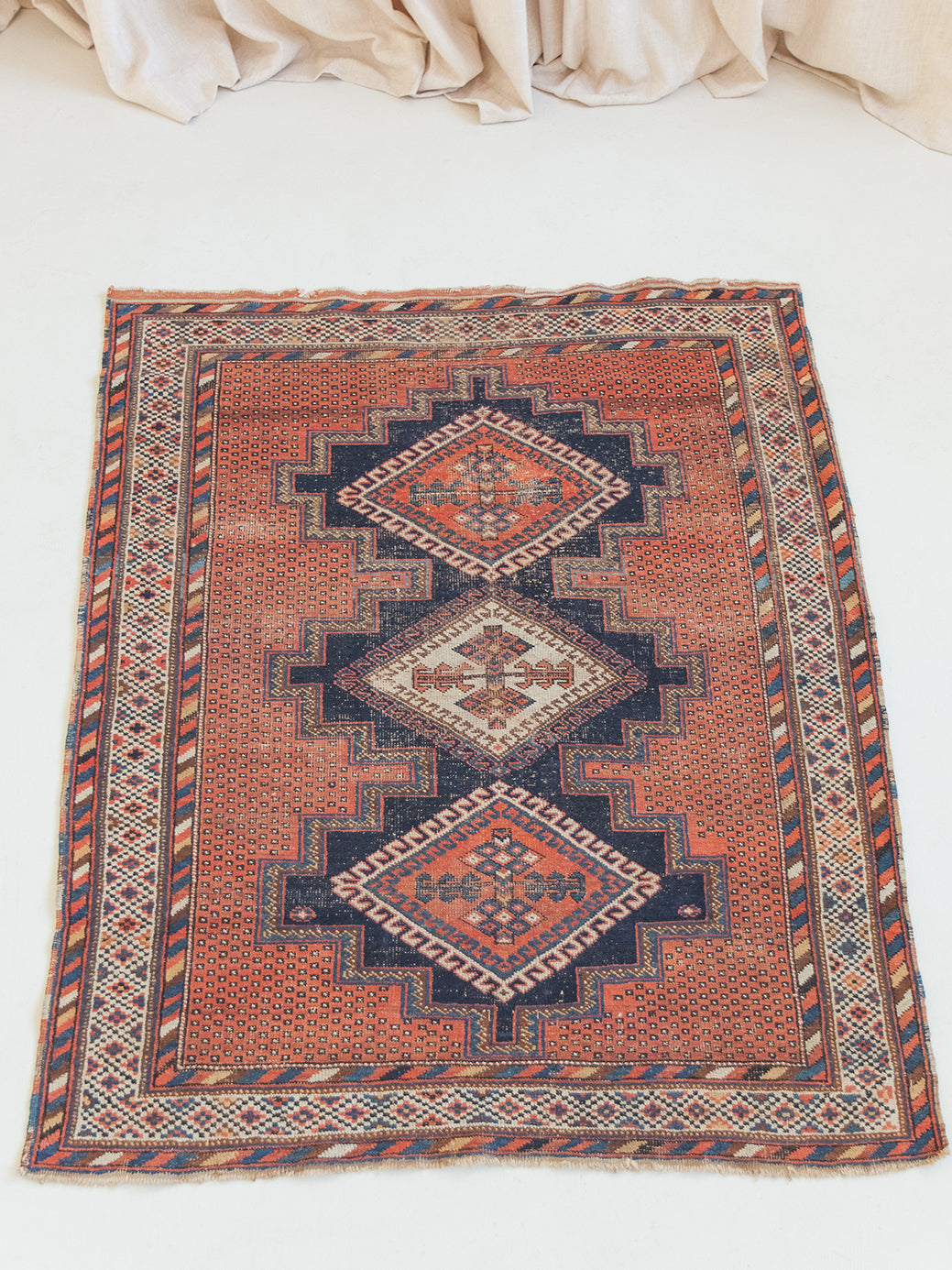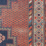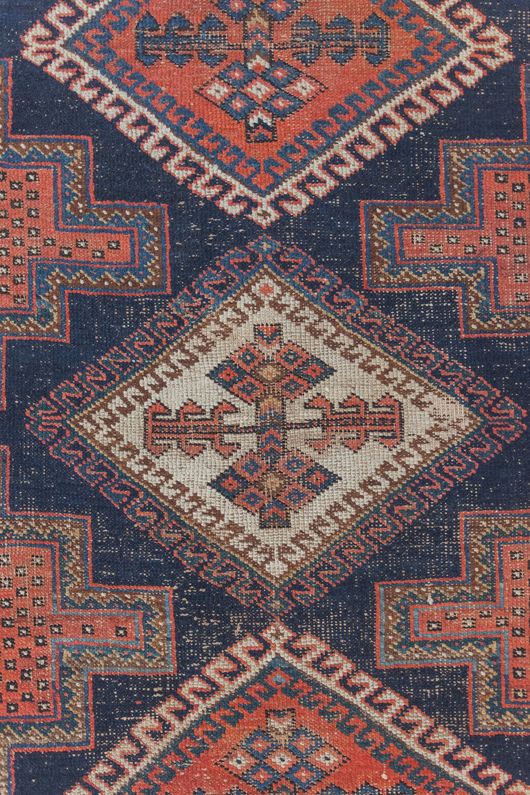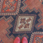 The Afshar tribe migrated to Iran in the 11th century and settled in the southern regions. Their distinctive rug designs are known for geometric patterns characterised by a central medallion and oversized corner details. Nature-inspired elements like paisley (representing leaves) and stylised bird motifs can often be spotted in these rugs, and the palettes are typically warm and earthy, reflecting the surrounding landscape. The reds were achieved with madder root, and the deep blues with indigo plants, while light brown accents are often undyed camel hair.