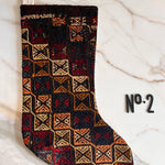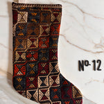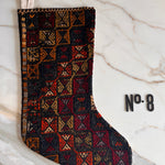 Each stocking group is cut from the same rug; patterns and colors will vary from stocking to stocking. The front of the stocking is made of 100% wool antique rug, and the back is pure cotton canvas.