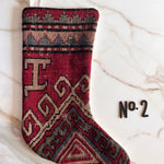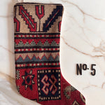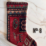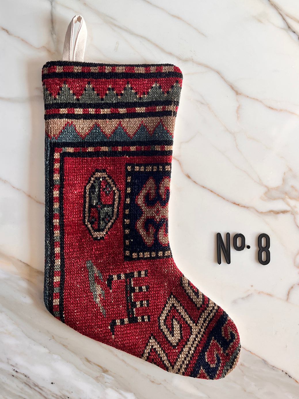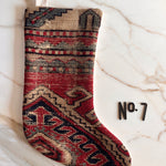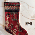 Each stocking group is cut from the same rug; patterns and colors will vary from stocking to stocking. The front of the stocking is made of 100% wool antique rug, and the back is pure cotton canvas.