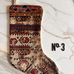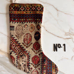 Each stocking group is cut from the same rug; patterns and colors will vary from stocking to stocking. The front of the stocking is made of 100% wool antique rug, and the back is pure cotton canvas.