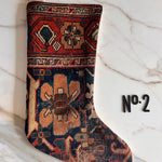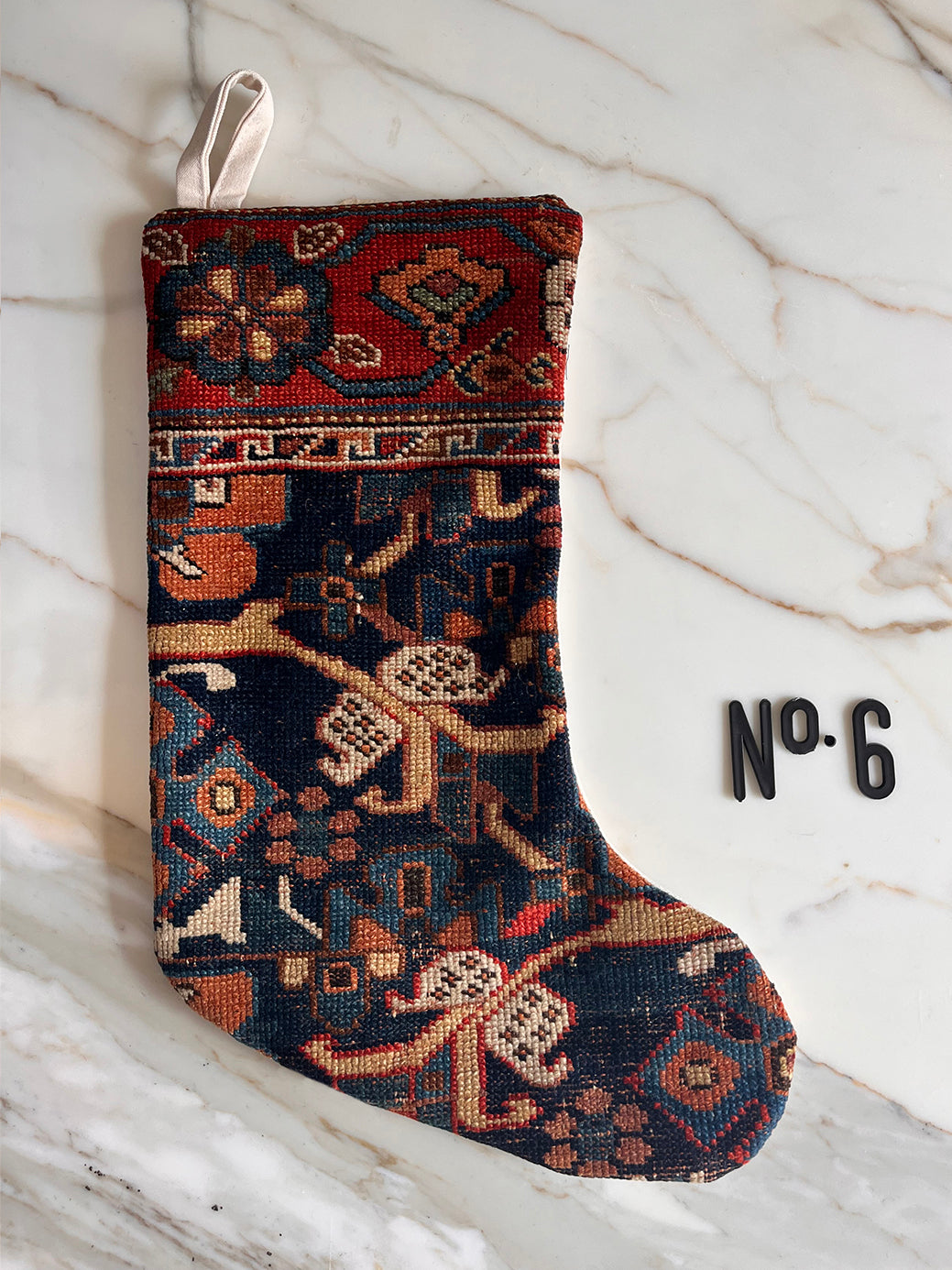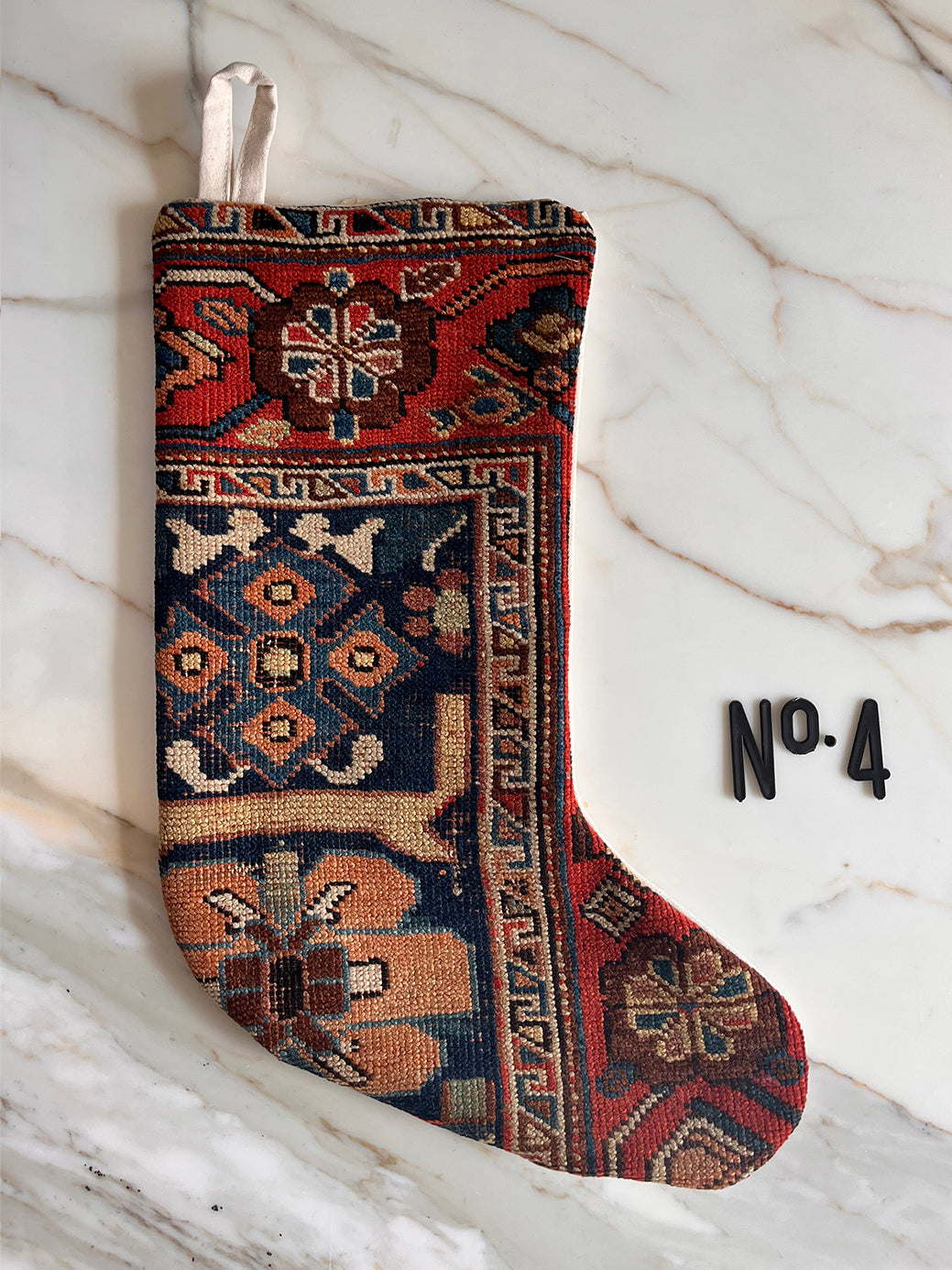 Each stocking group is cut from the same rug; patterns and colors will vary from stocking to stocking. The front of the stocking is made of 100% wool antique rug, and the back is pure cotton canvas.