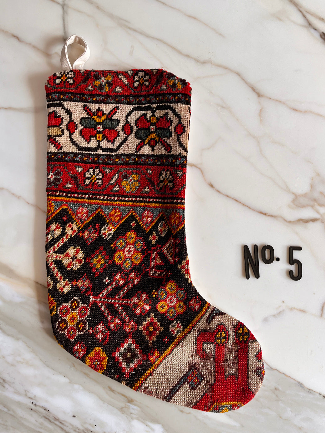 Each stocking group is cut from the same rug; patterns and colors will vary from stocking to stocking. The front of the stocking is made of 100% wool antique rug, and the back is pure cotton canvas.