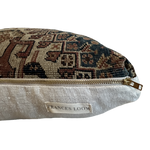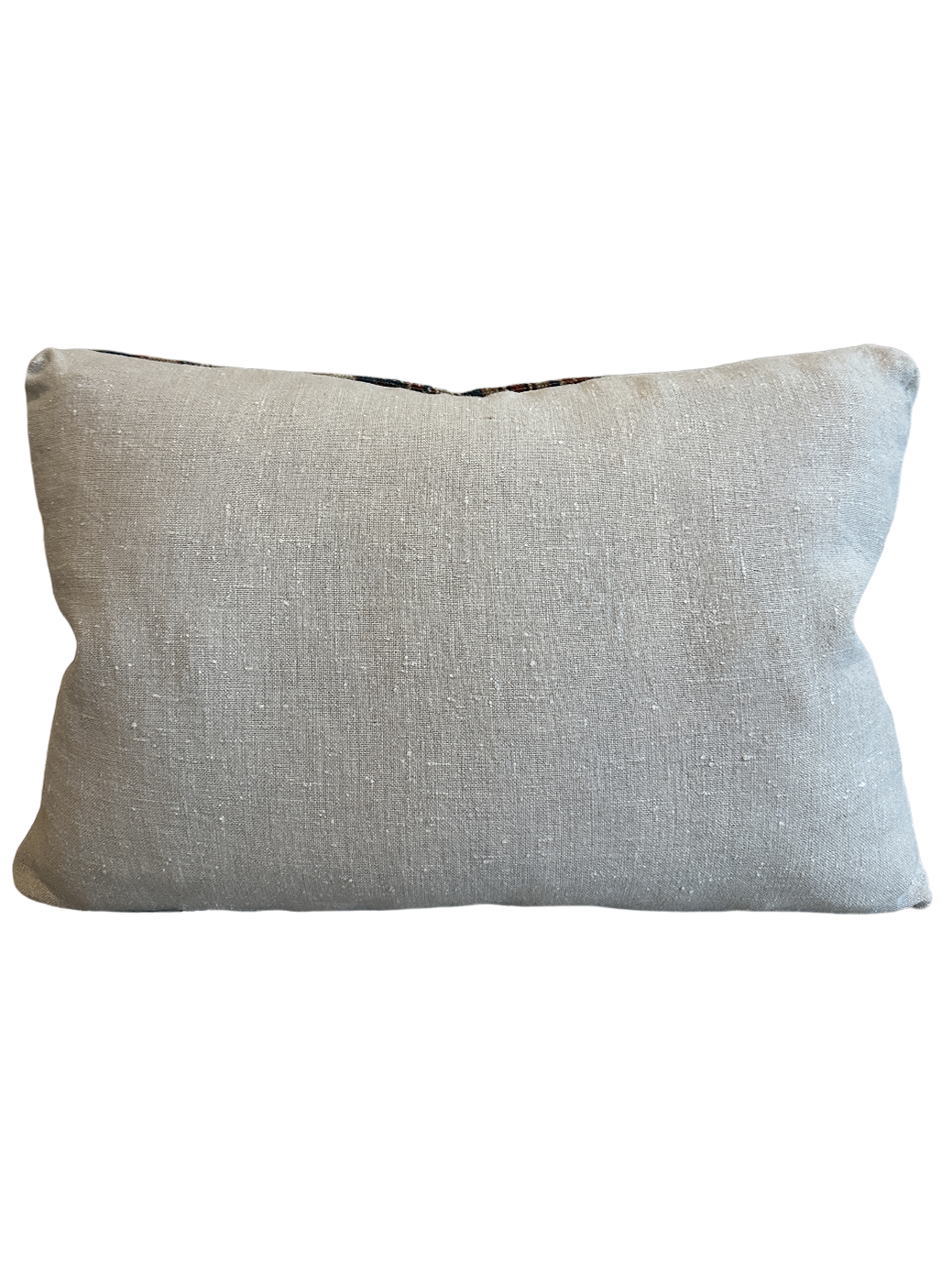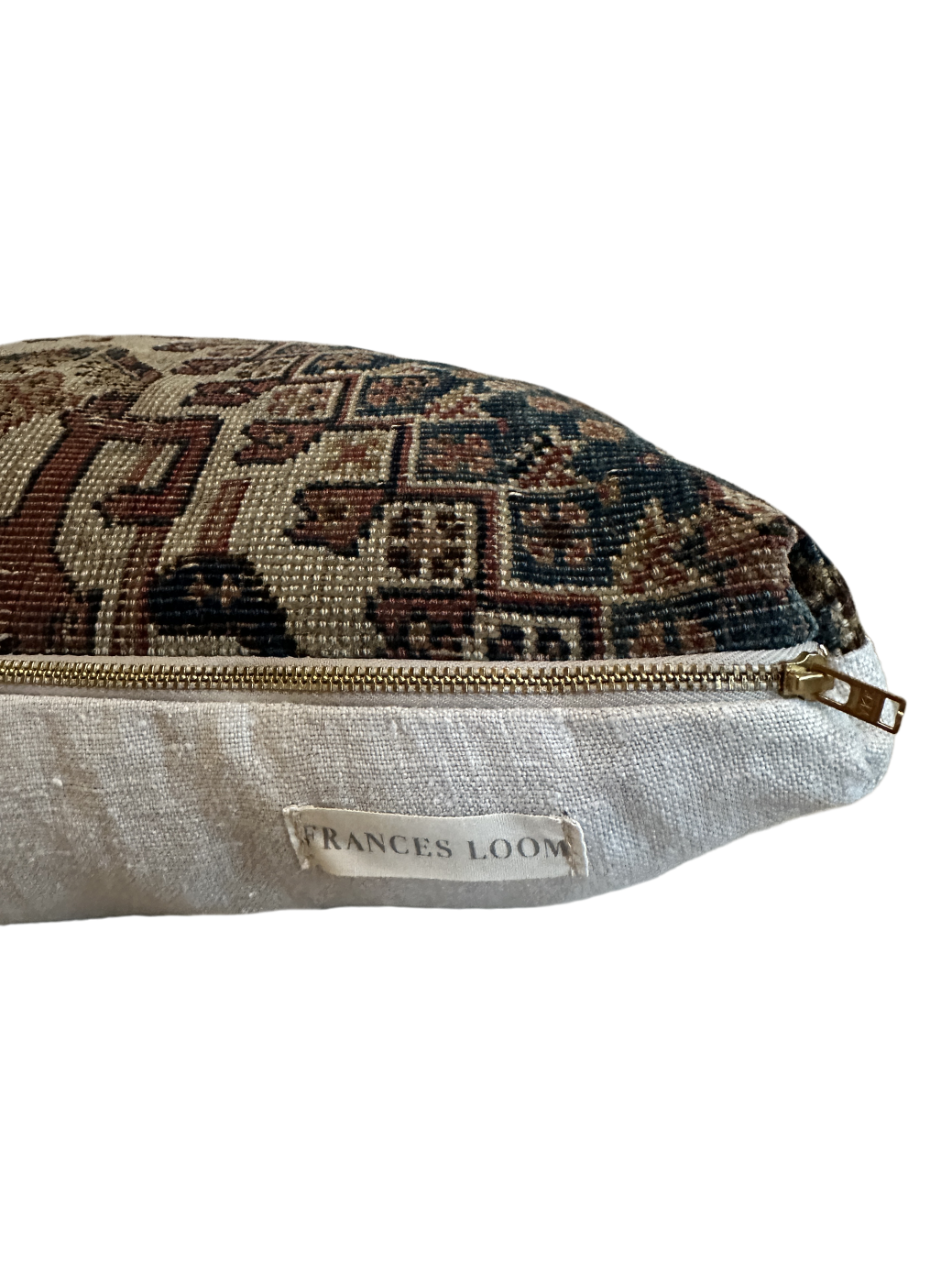 Entirely antique, this pillow pairs a handwoven rug fragment with antique French linen for a textured, timeless feel. It’s finished with a sturdy unlacquered brass zipper.