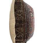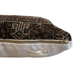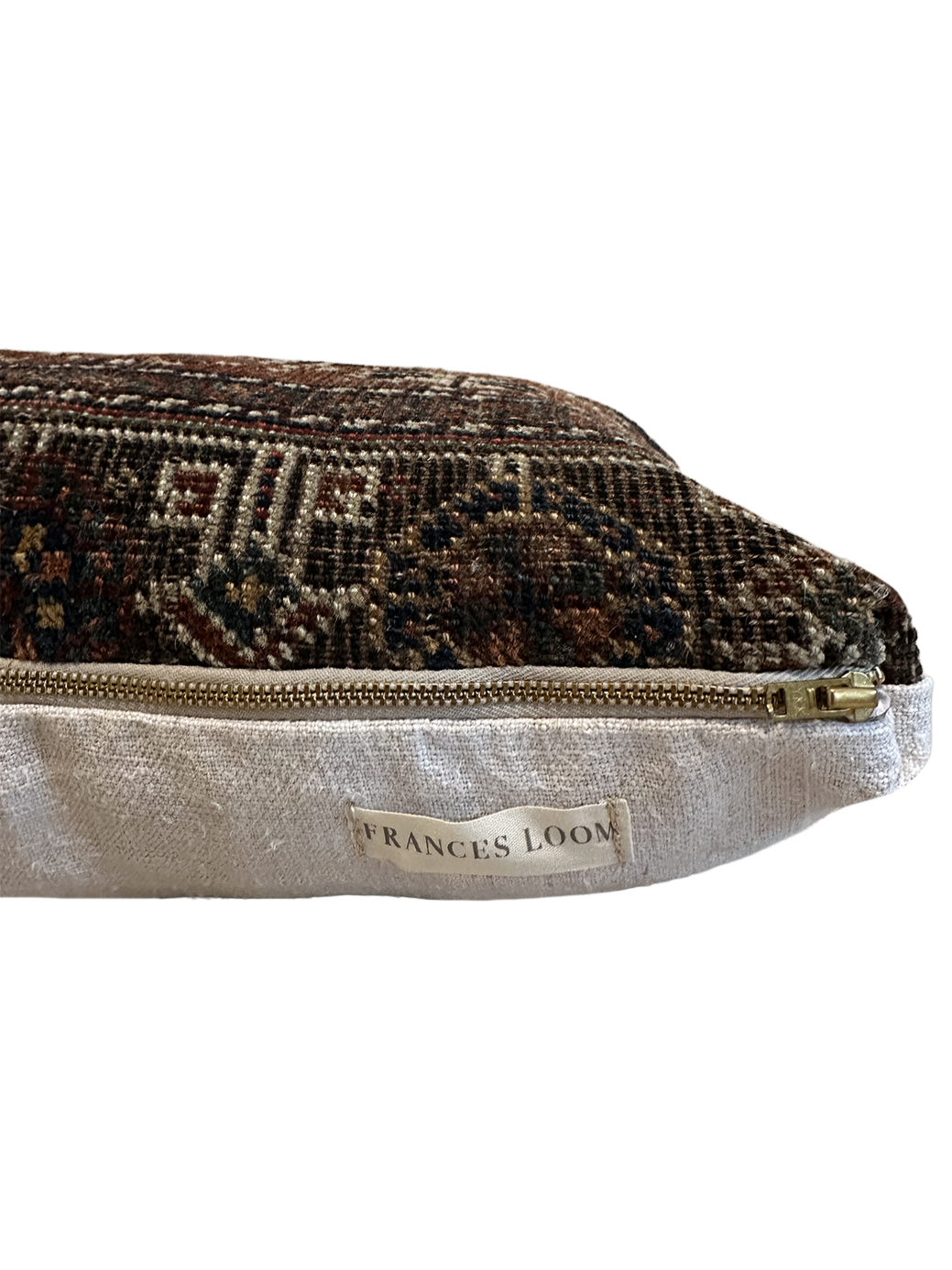 Entirely antique, this pillow pairs a handwoven rug fragment with antique French linen for a textured, timeless feel. It’s finished with a sturdy unlacquered brass zipper.