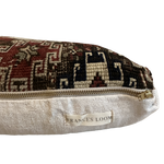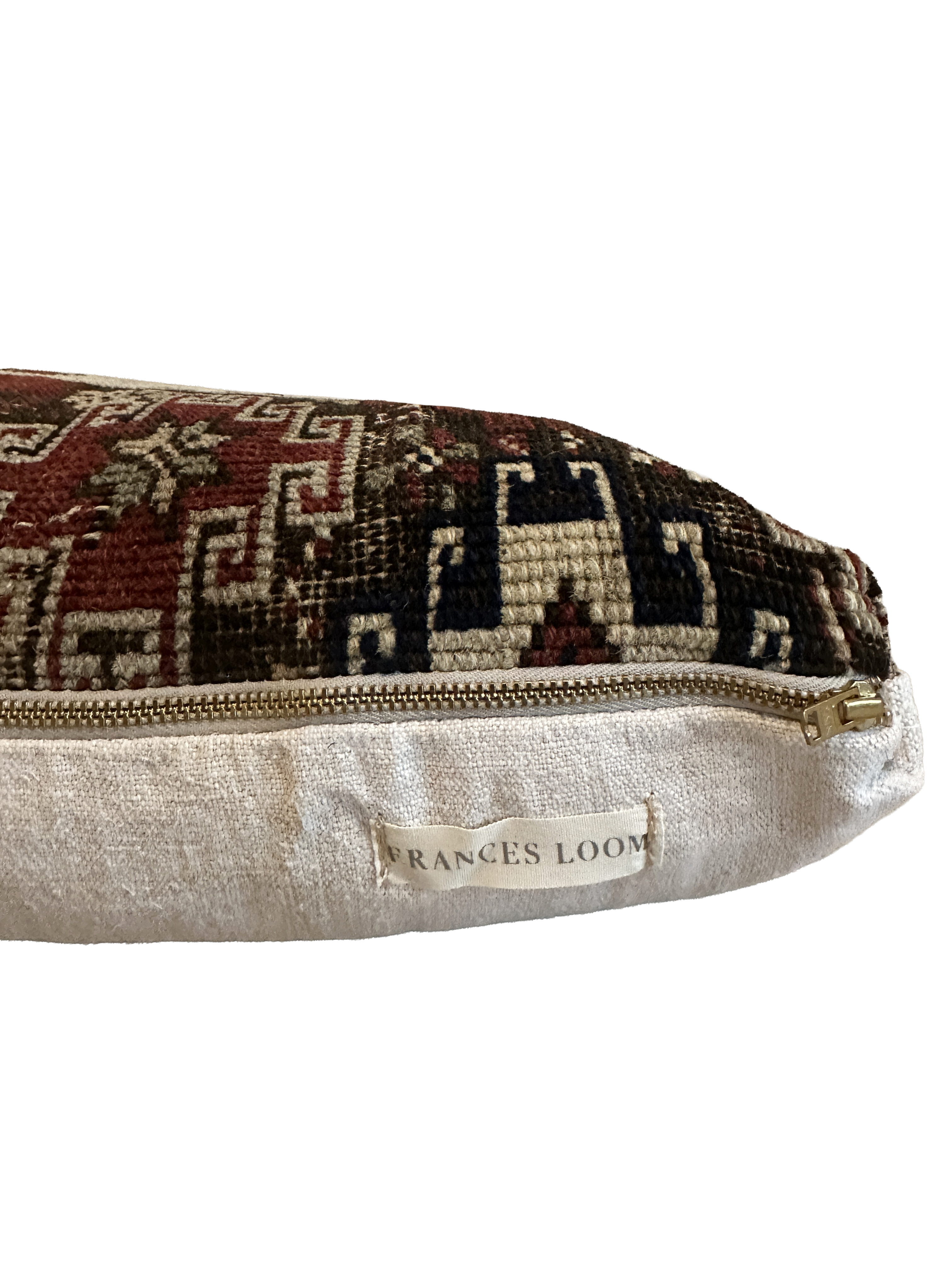 Entirely antique, this pillow pairs a handwoven rug fragment with antique French linen for a textured, timeless feel. It’s finished with a sturdy unlacquered brass zipper.