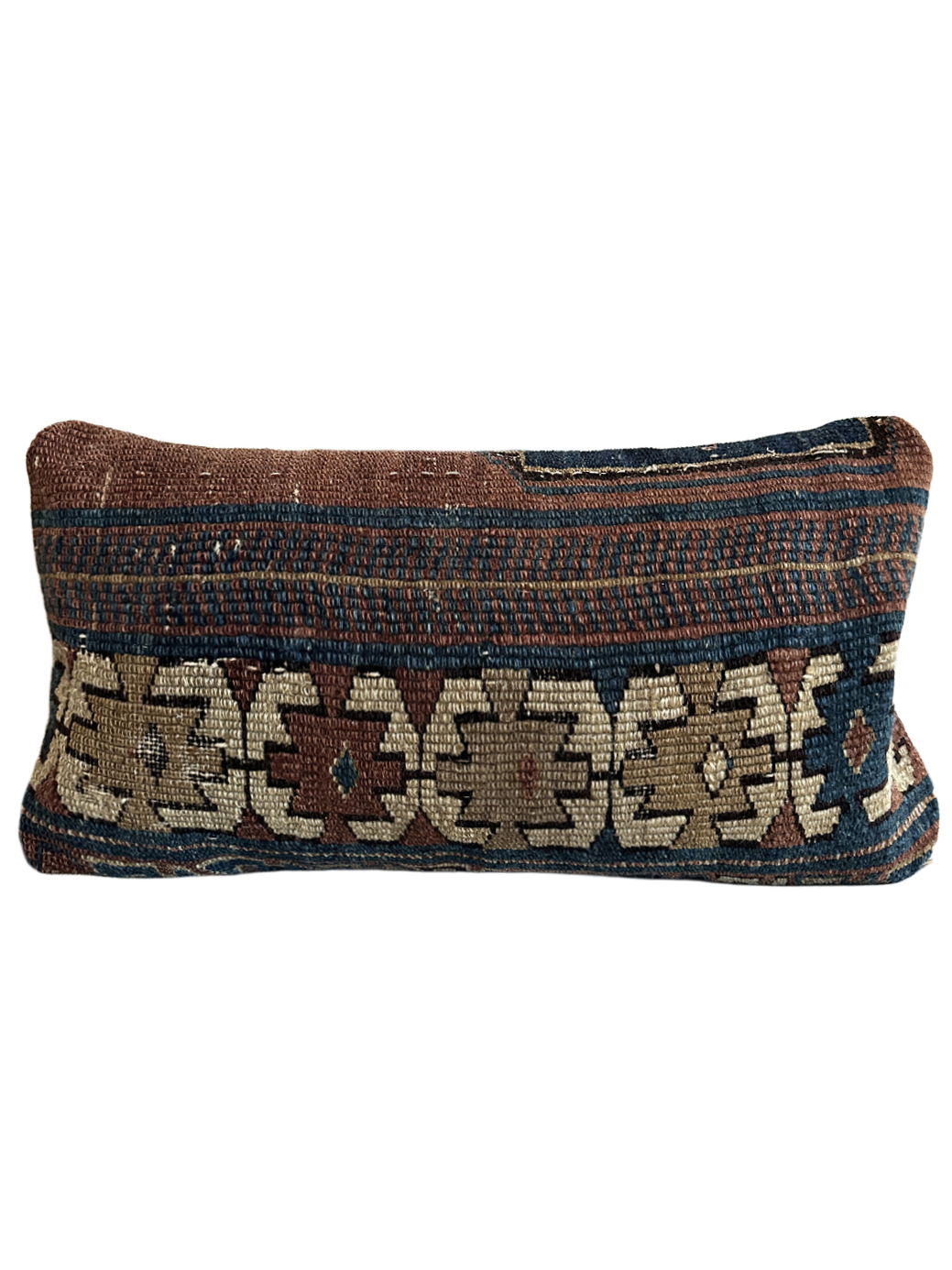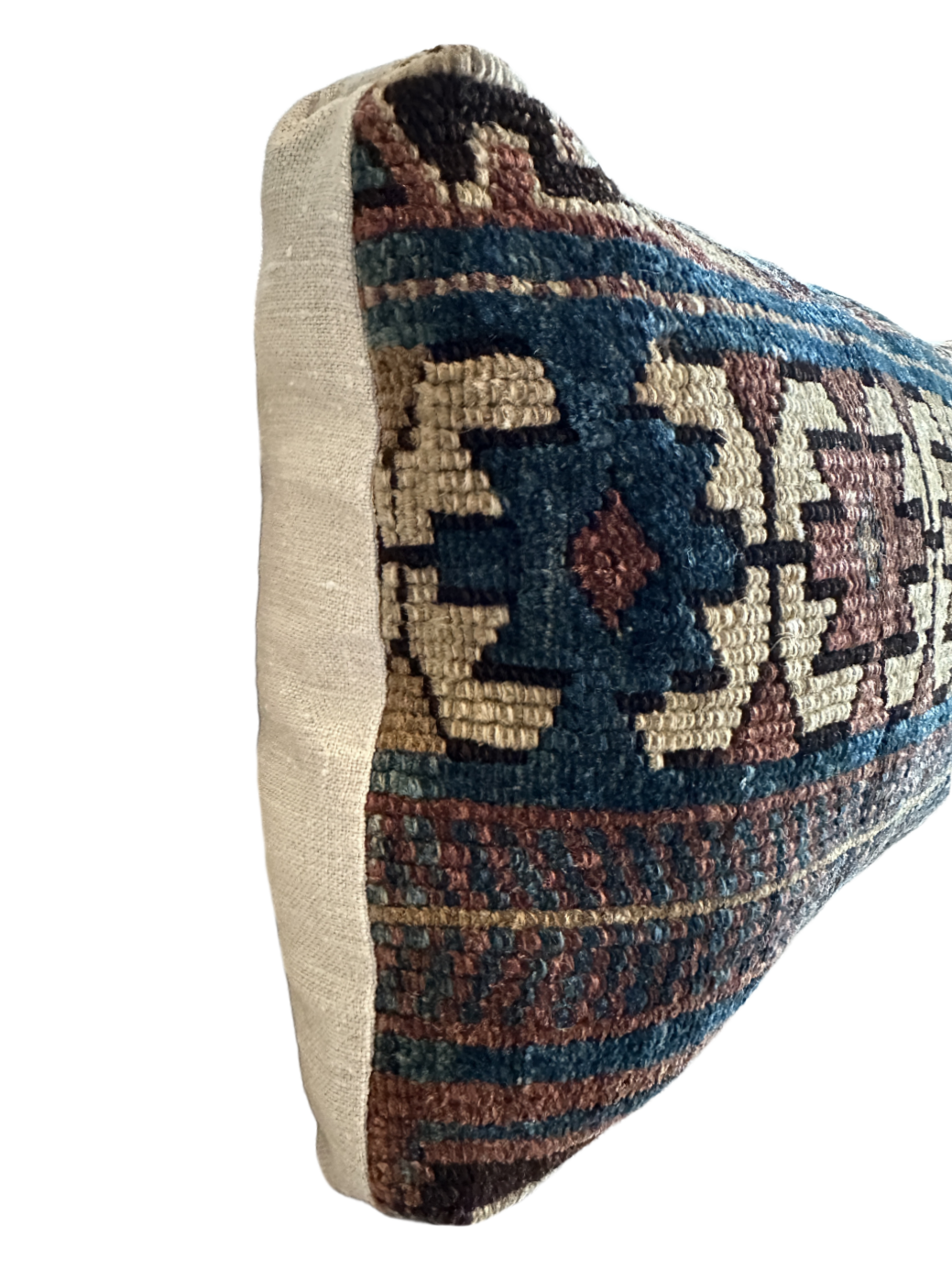 Entirely antique, this pillow pairs a handwoven rug fragment with antique French linen for a textured, timeless feel. It’s finished with a sturdy unlacquered brass zipper.