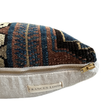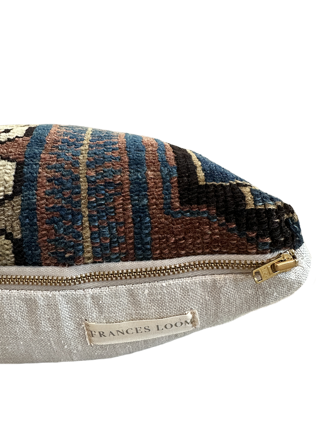 Entirely antique, this pillow pairs a handwoven rug fragment with antique French linen for a textured, timeless feel. It’s finished with a sturdy unlacquered brass zipper.