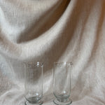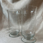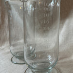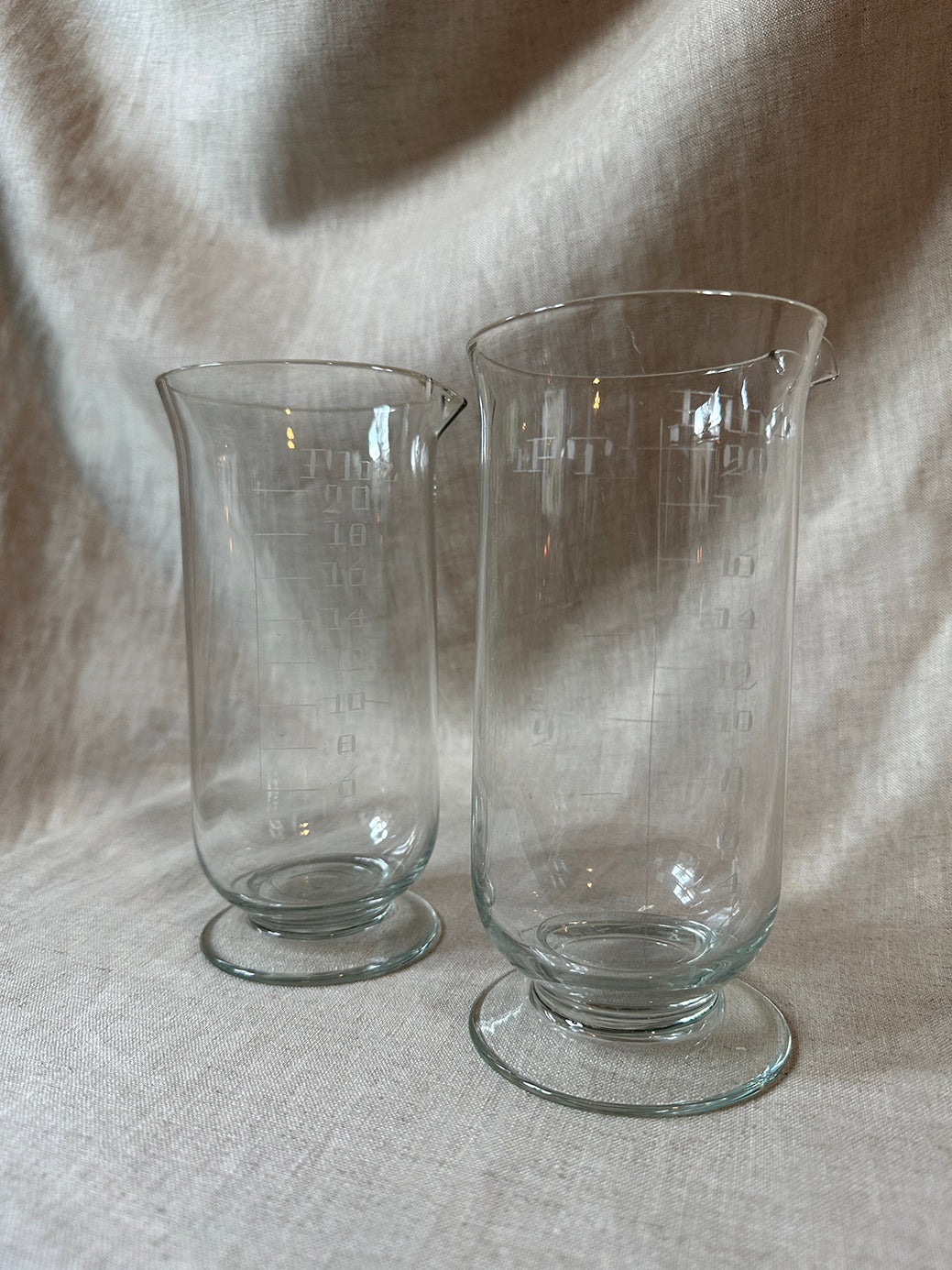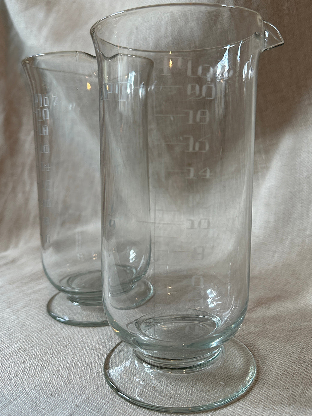 Size: both 3.5" wide x 7" high Origin: a pair of antique glass measuring beakers with hand-engraved graduations