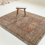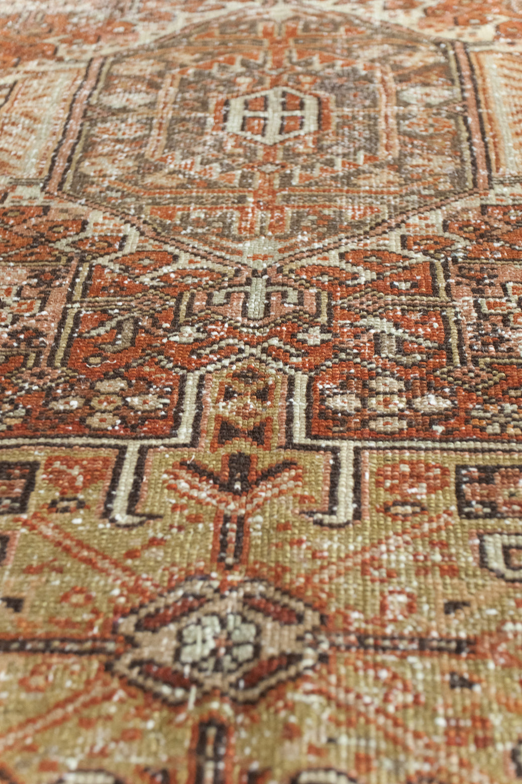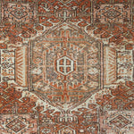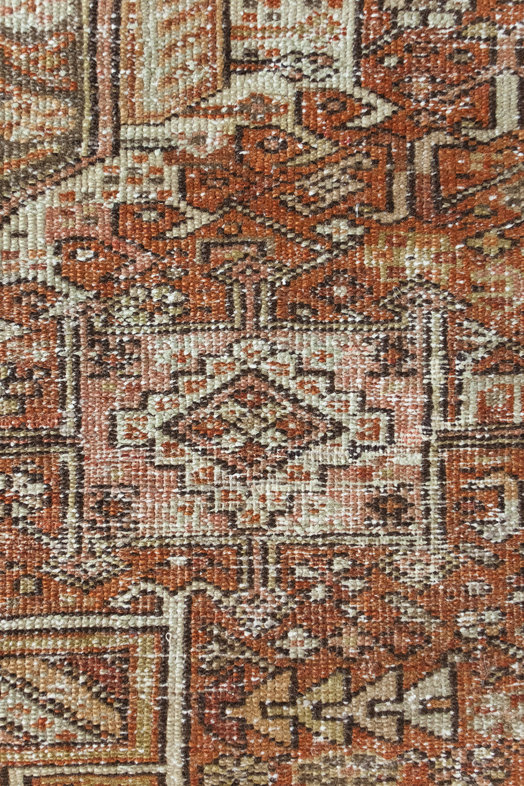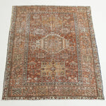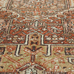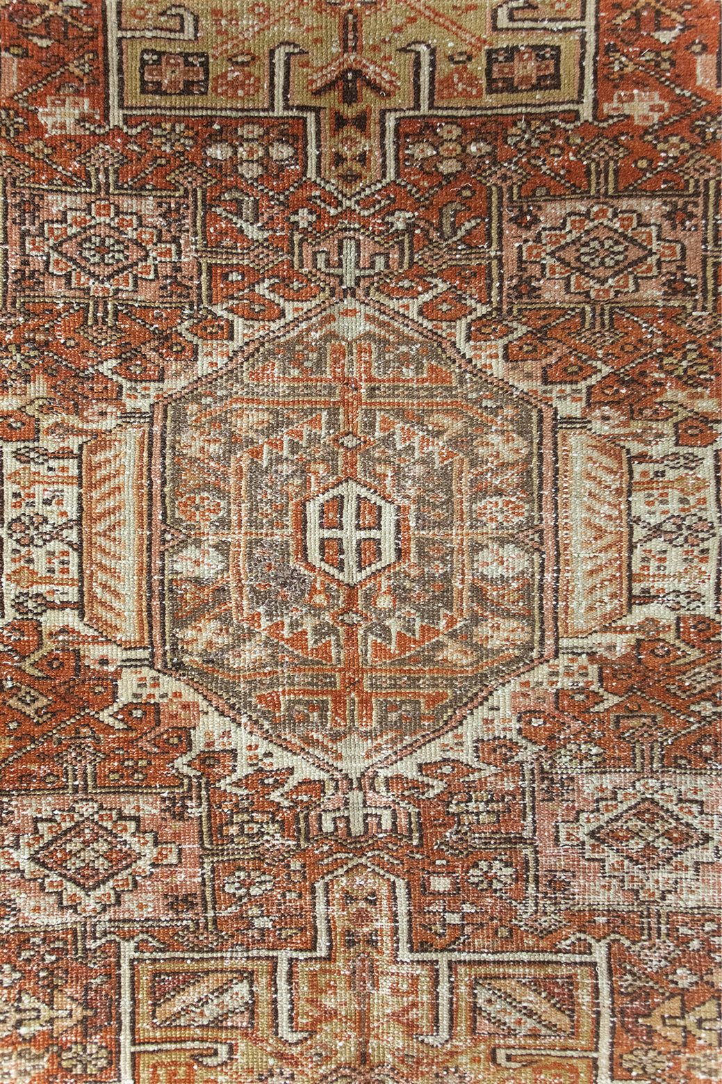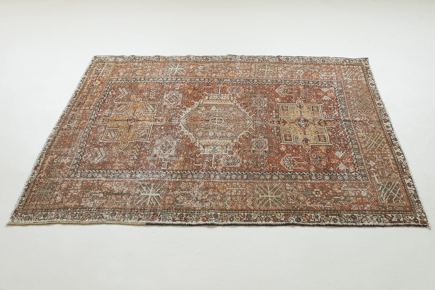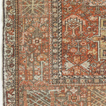 Karajah is a village just outside of Heriz, hence the visual similarities. It's said to be the oldest of all rug-weaving regions and is known for its hardwearing, all-wool carpets. Typically, the pattern comprises a coral-colored palette with three geometric medallions; two eight-pointed stars and a central medallion with latch-hooked contours (the white hooks surrounding navy blue in this case).