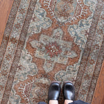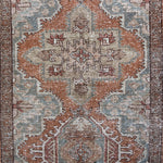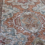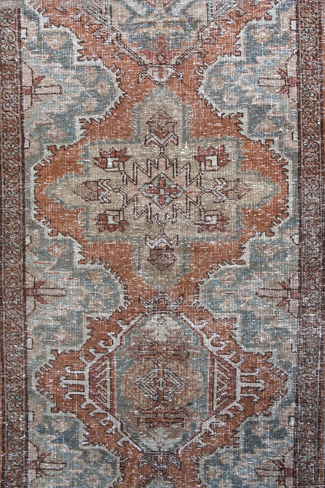 Karajah is a village just outside of Heriz, hence the visual similarities. It's said to be the oldest of all rug-weaving regions and is known for its hardwearing, all-wool carpets. Typically, the pattern comprises a coral-colored palette with three geometric medallions; two eight-pointed stars and a central medallion with latch-hooked contours (the white hooks surrounding navy blue in this case).