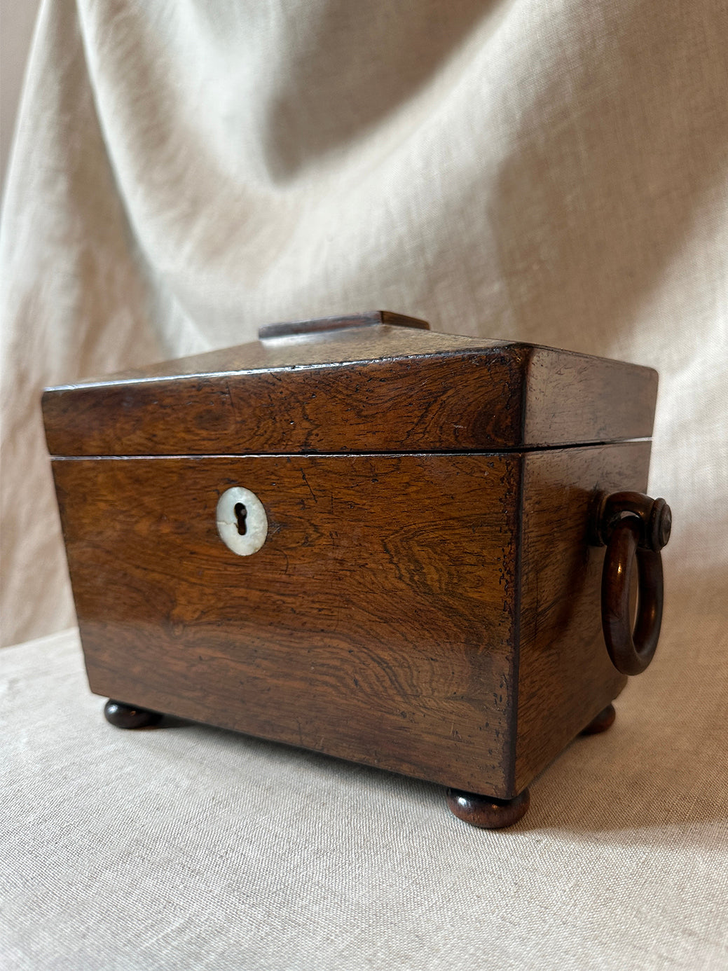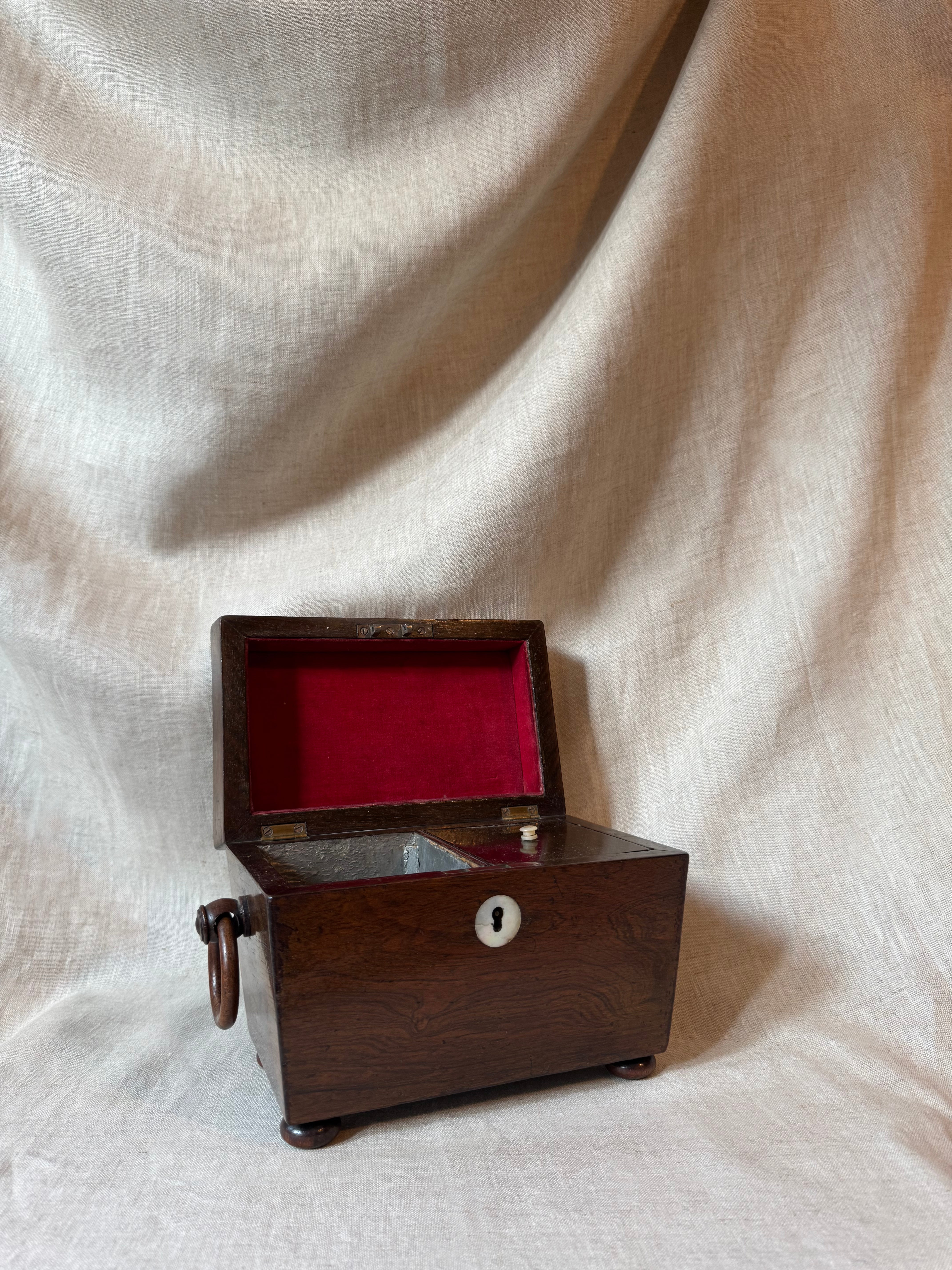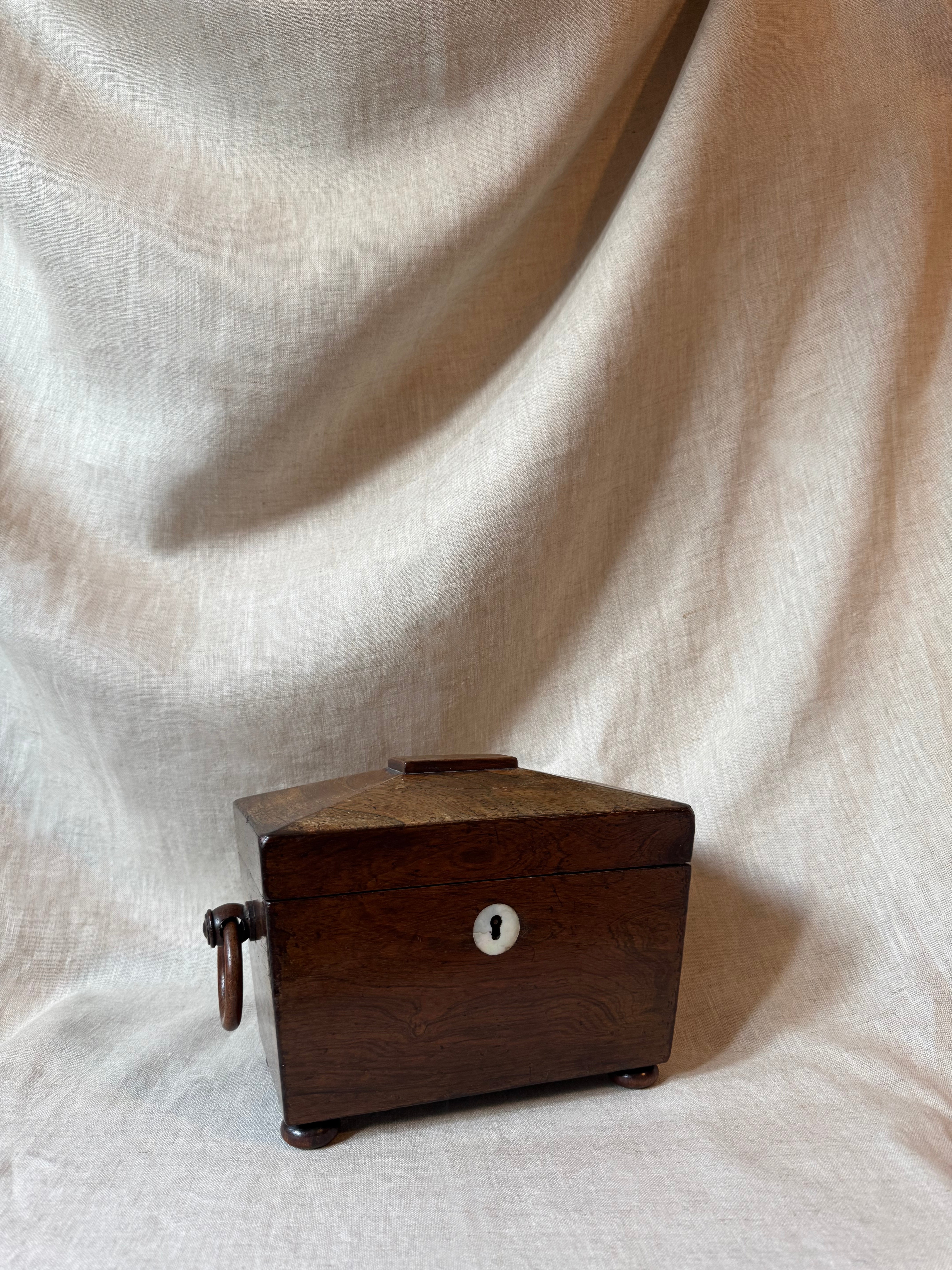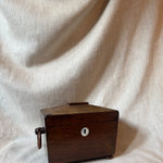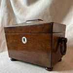 Size: 8.5" wide x 5.25" deep x 6" high (internal compartments 3.5” wide x 4” deep) Origin: an antique Victorian tea caddy (circa 1860) with two internal compartments, bun feet, and carved wood handles. Please note, one of the compartment lids is missing.