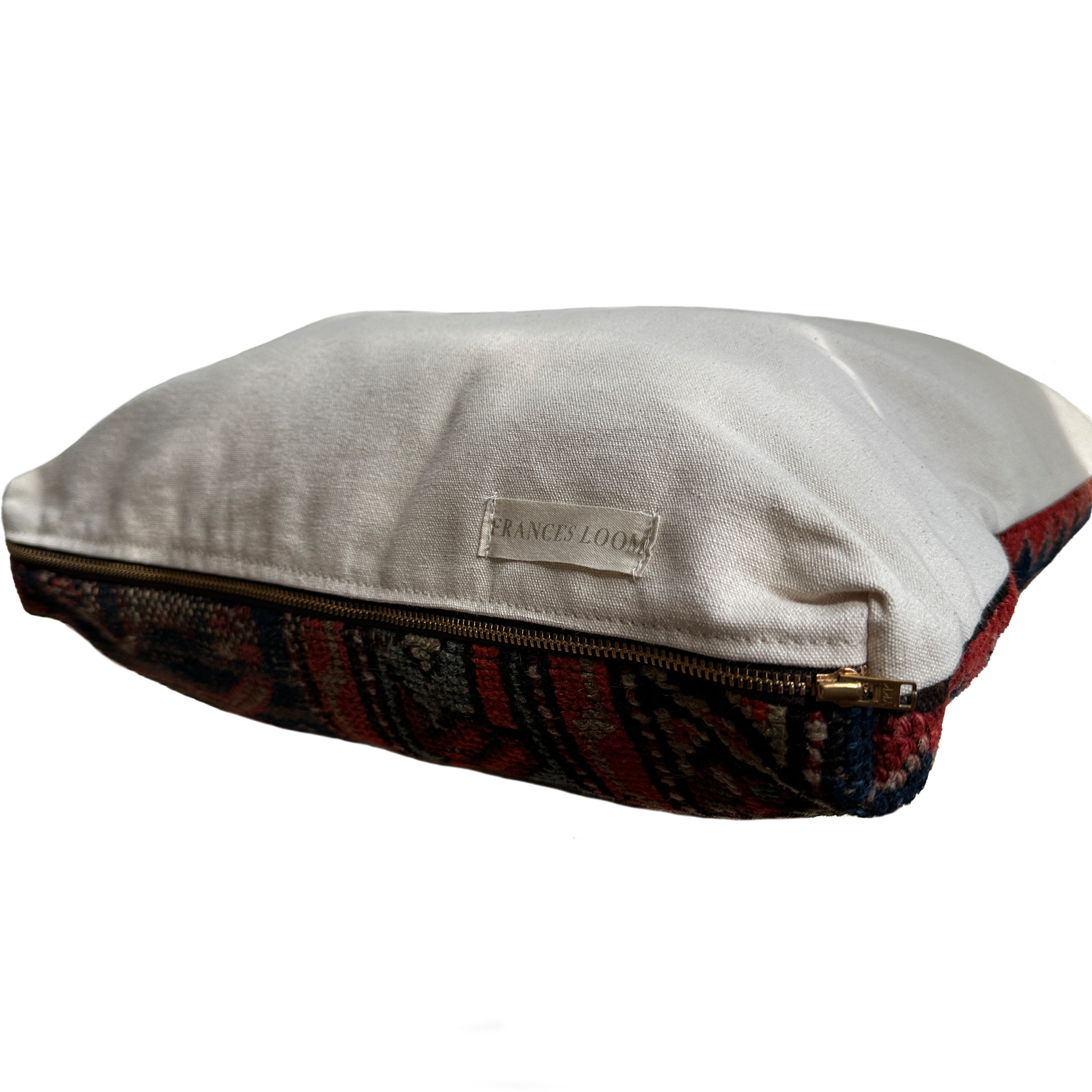 Antique rug and pure cotton canvas with an exposed brass zipper.