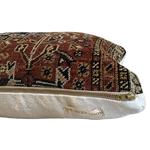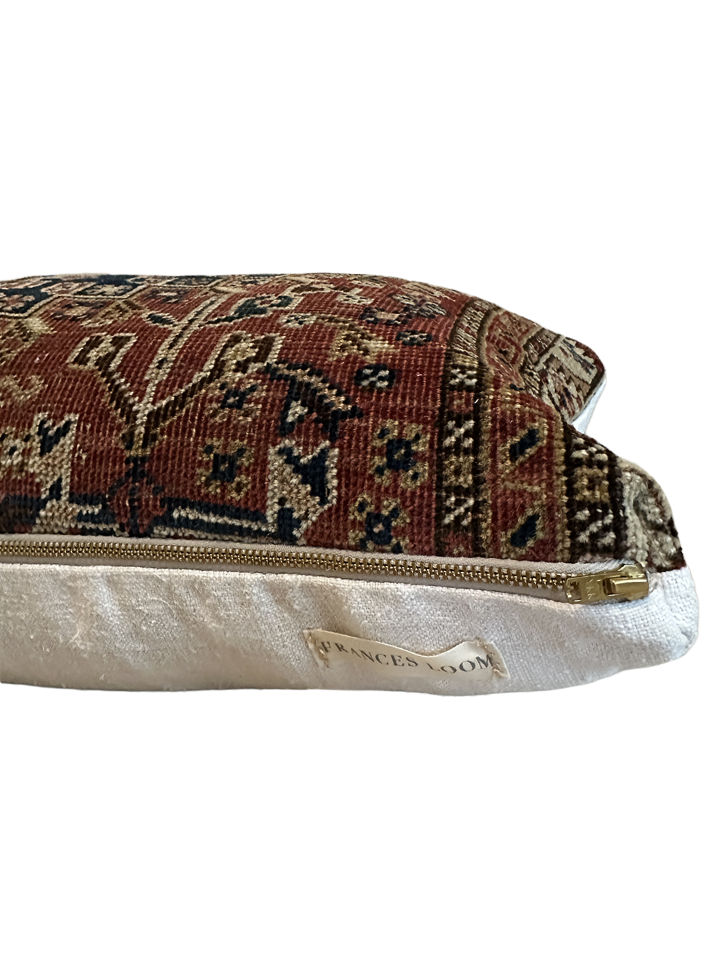 Entirely antique, this pillow pairs a handwoven rug fragment with antique French linen for a textured, timeless feel. It’s finished with a sturdy unlacquered brass zipper.
