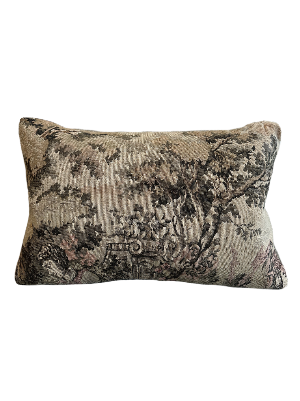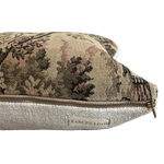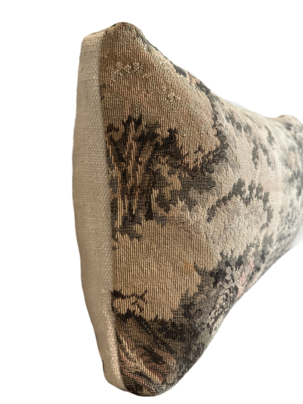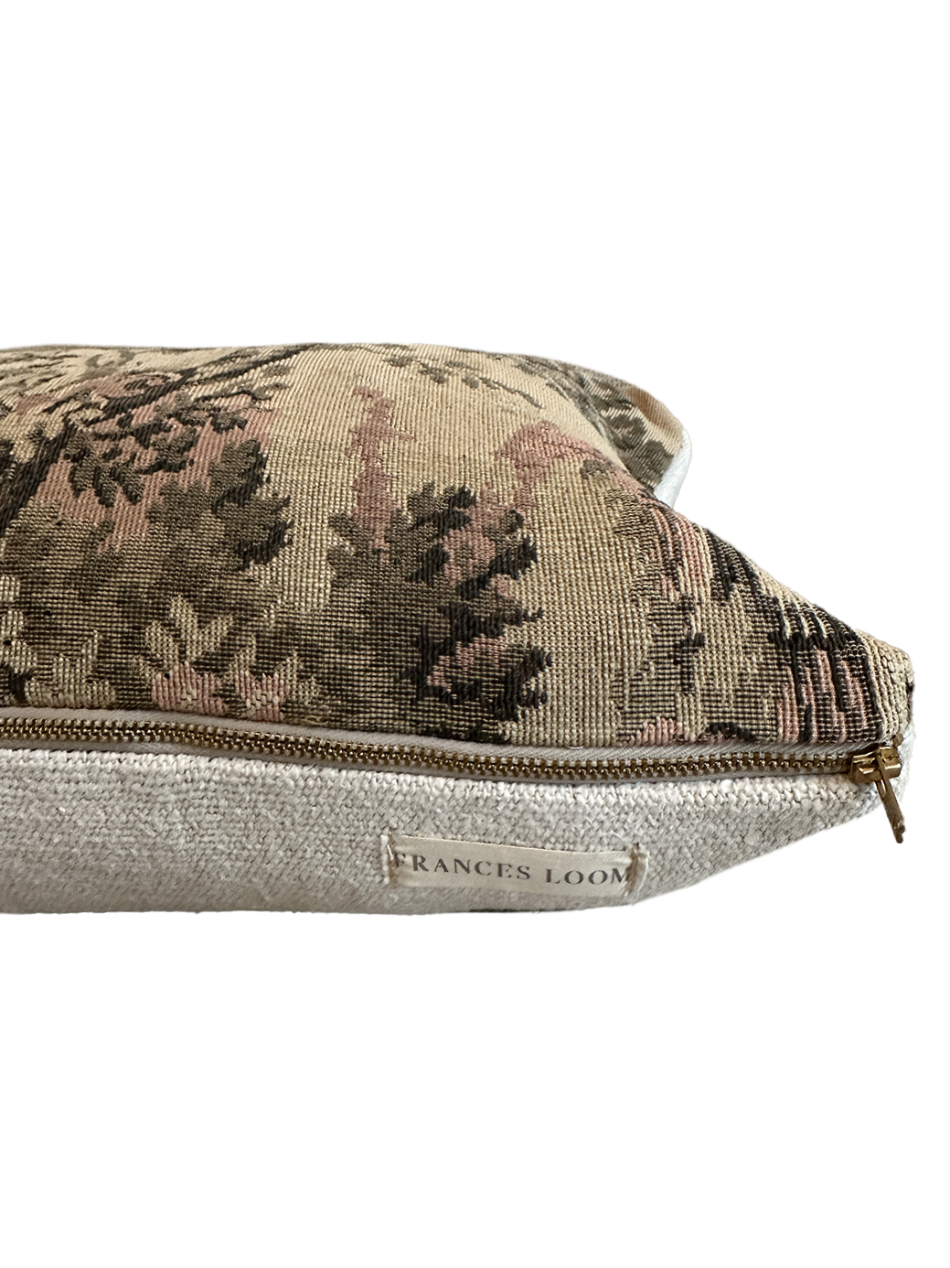 Composition: antique tapestry and linen with an exposed brass zipper.