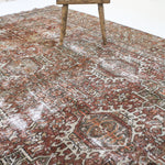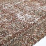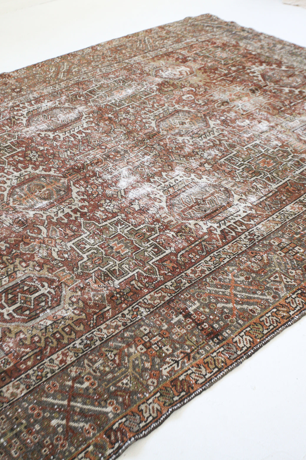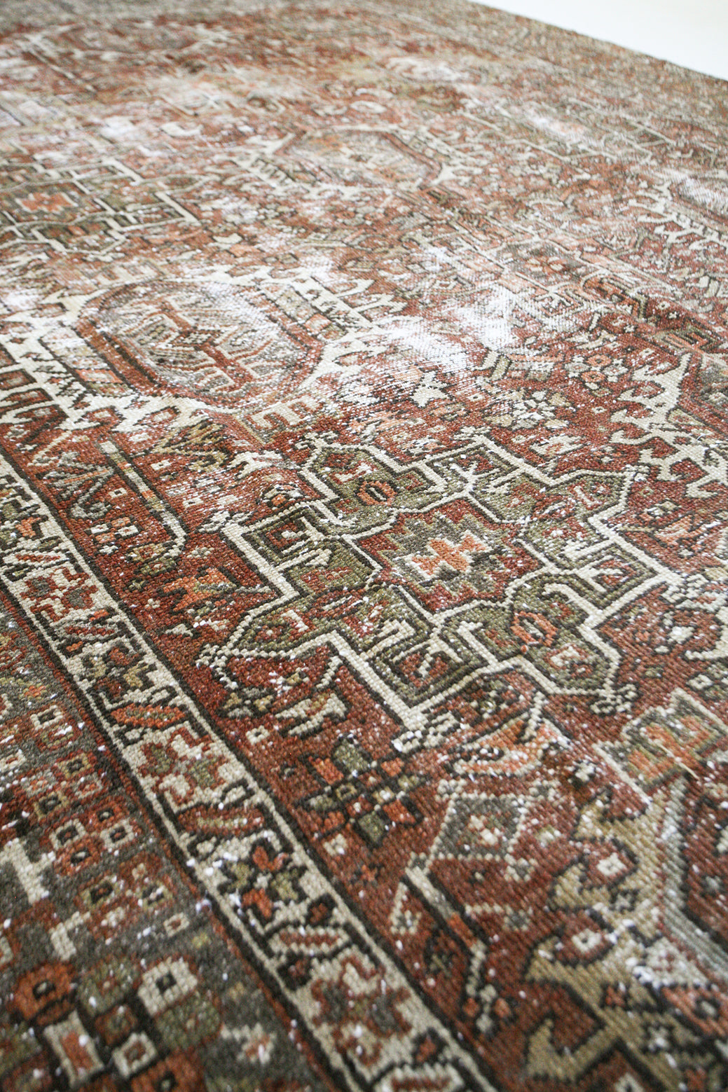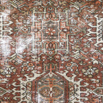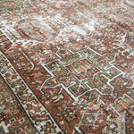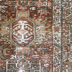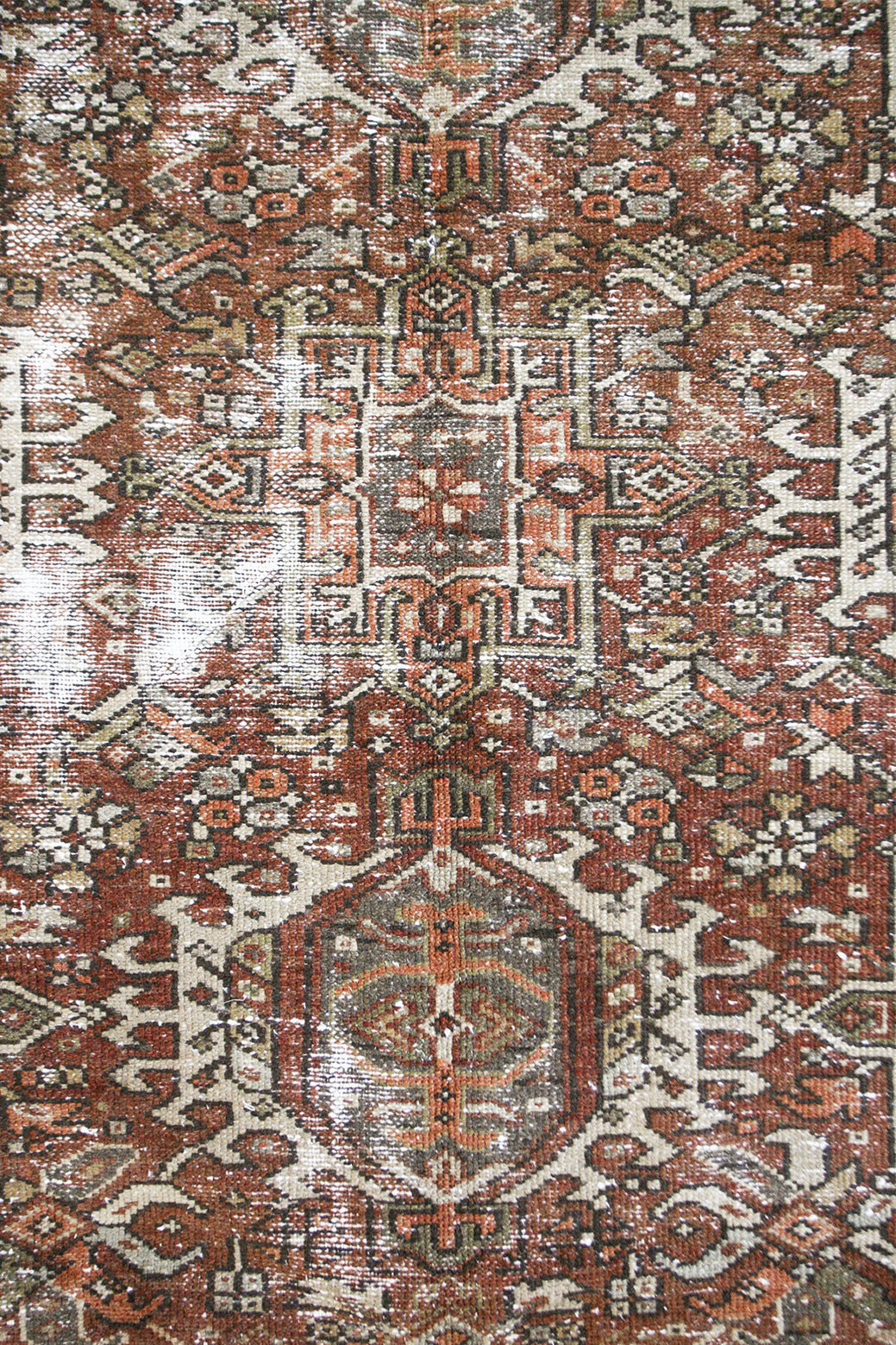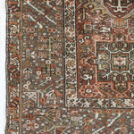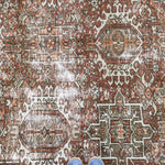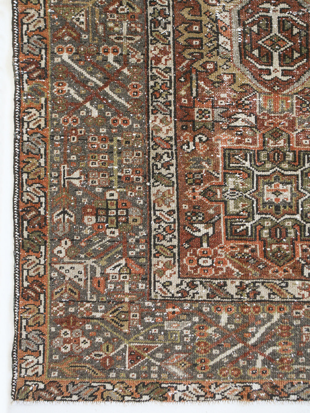 Karajah is a village just outside of Heriz, hence the visual similarities. It's said to be the oldest of all rug-weaving regions and is known for its hardwearing, all-wool carpets. Typically, the pattern comprises a coral-colored palette with three geometric medallions; two eight-pointed stars and a central medallion with latch-hooked contours (the white hooks surrounding navy blue in this case).
