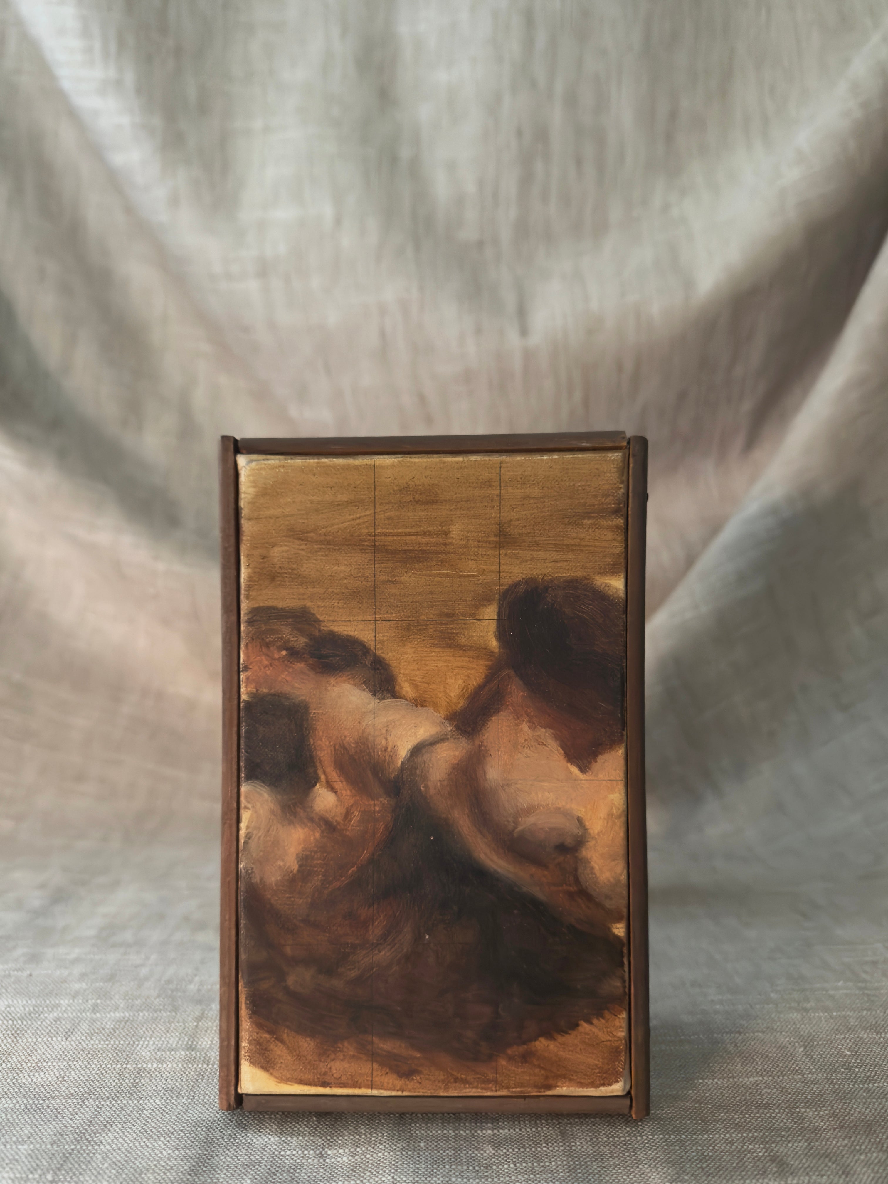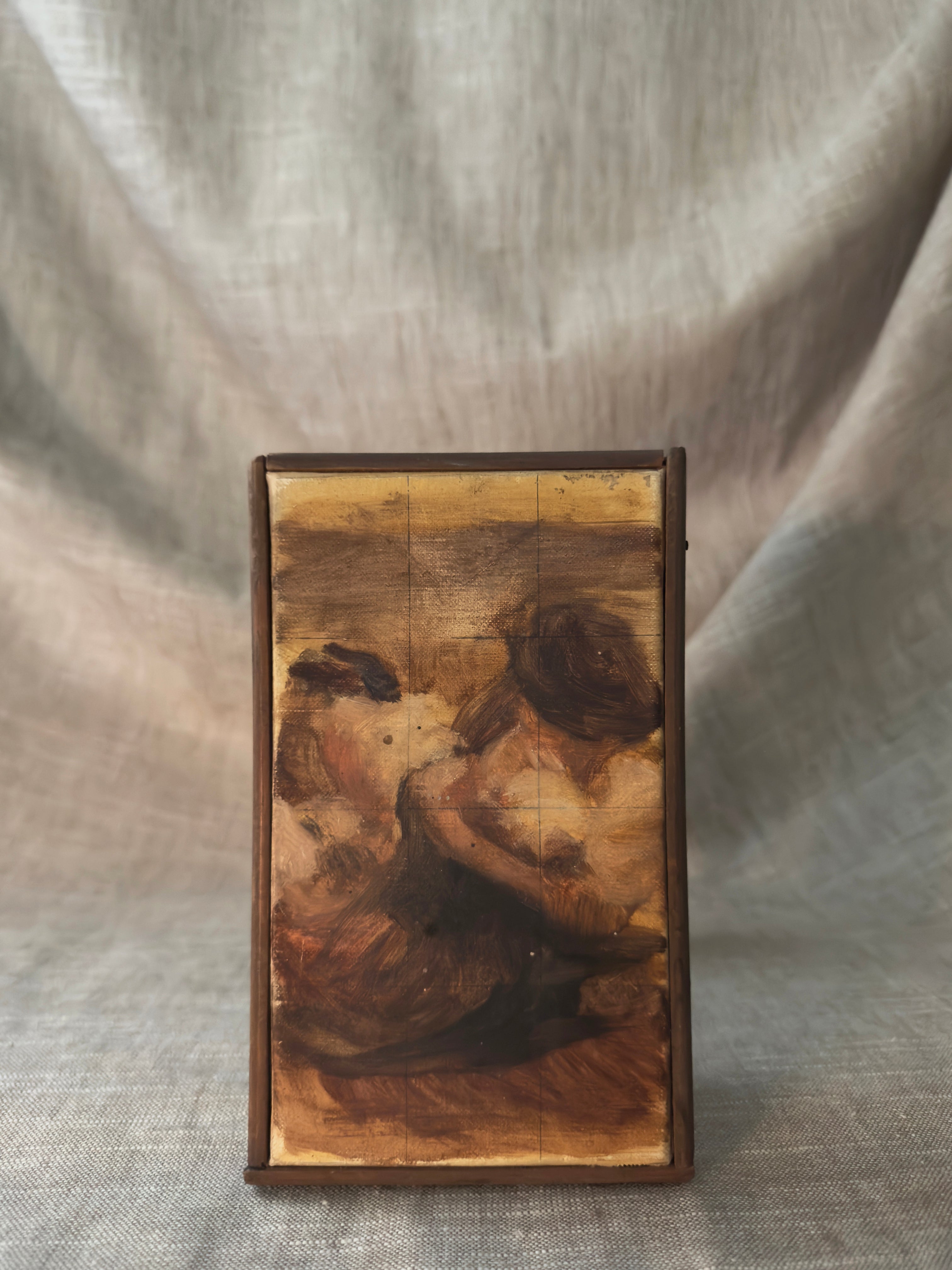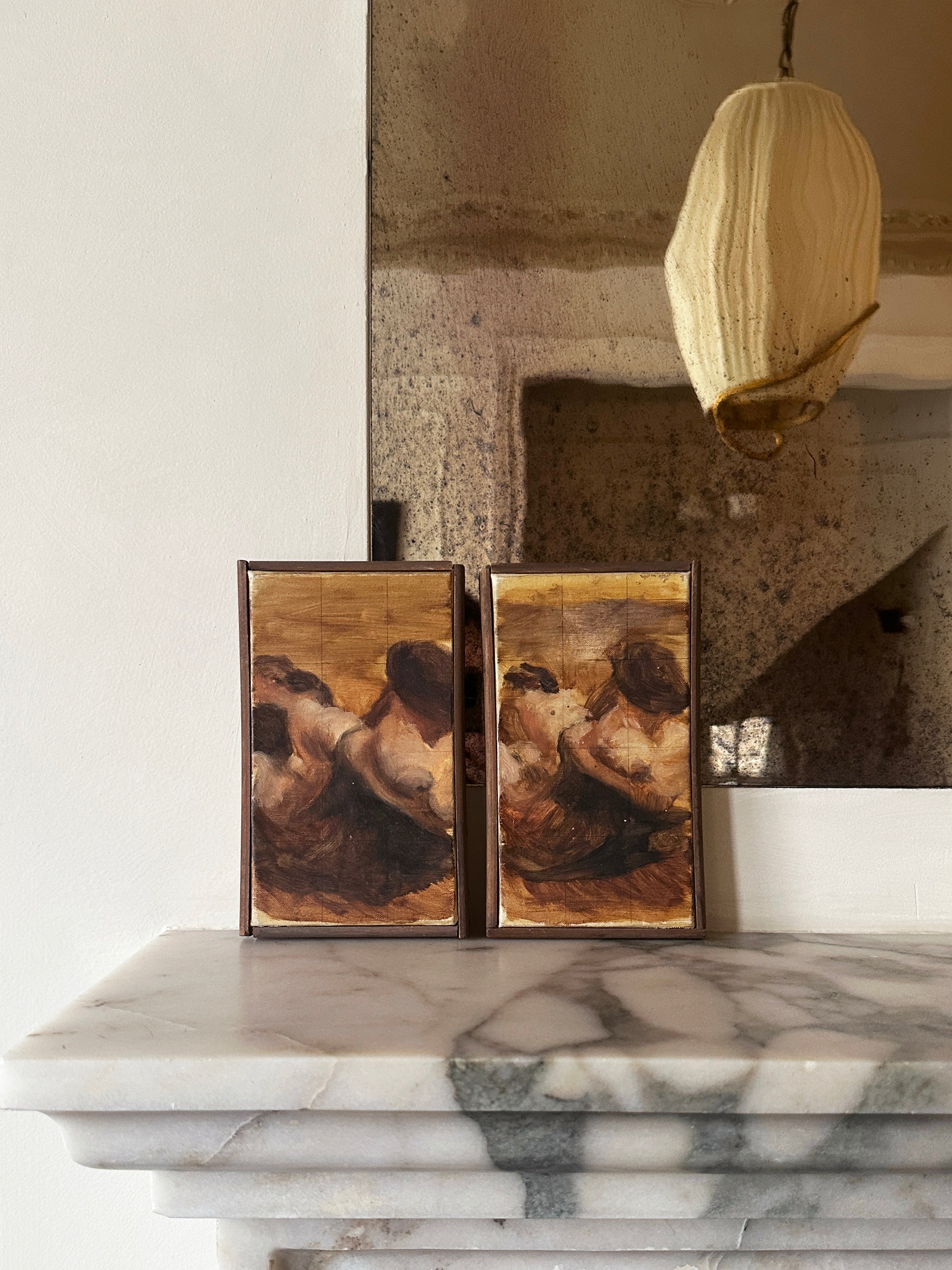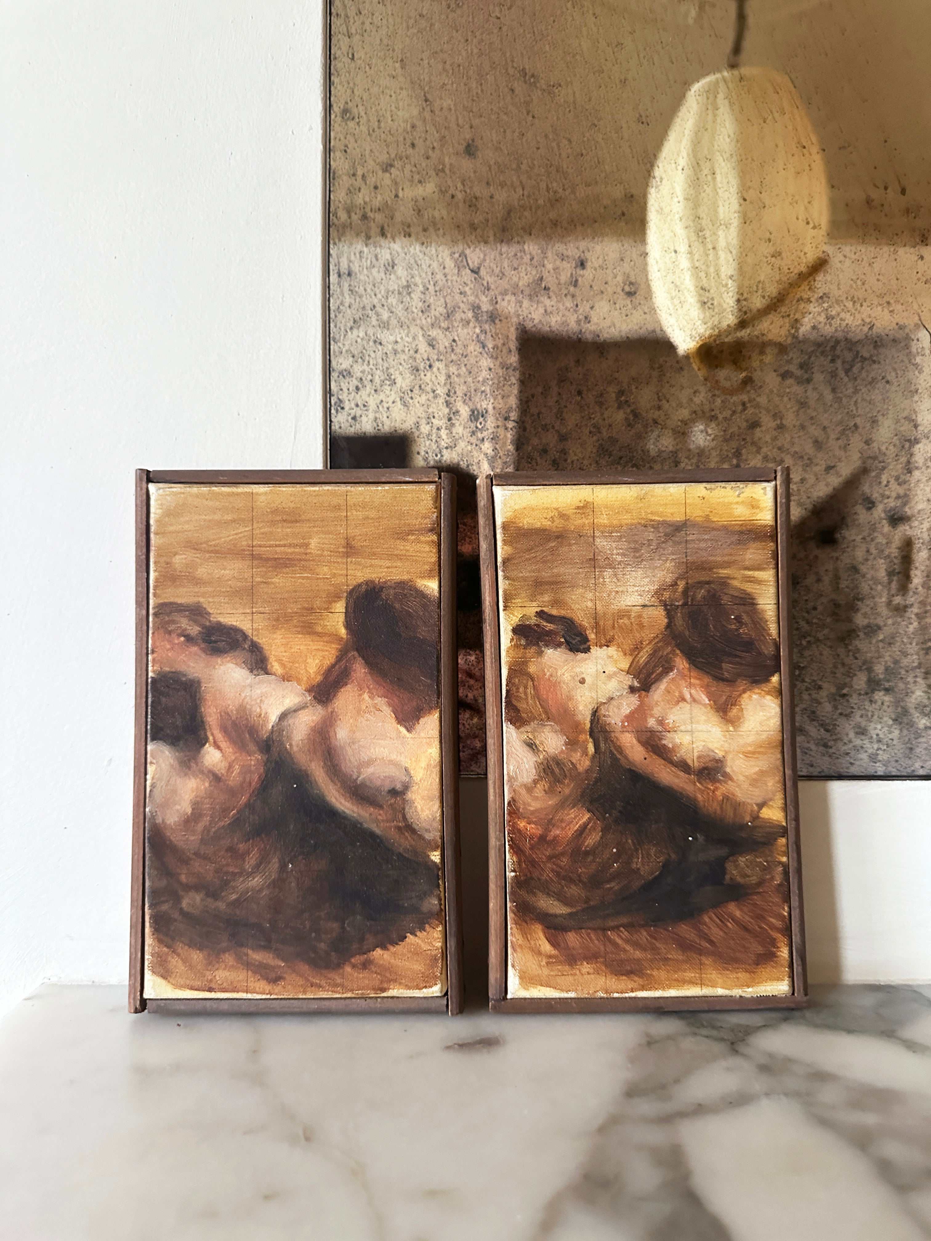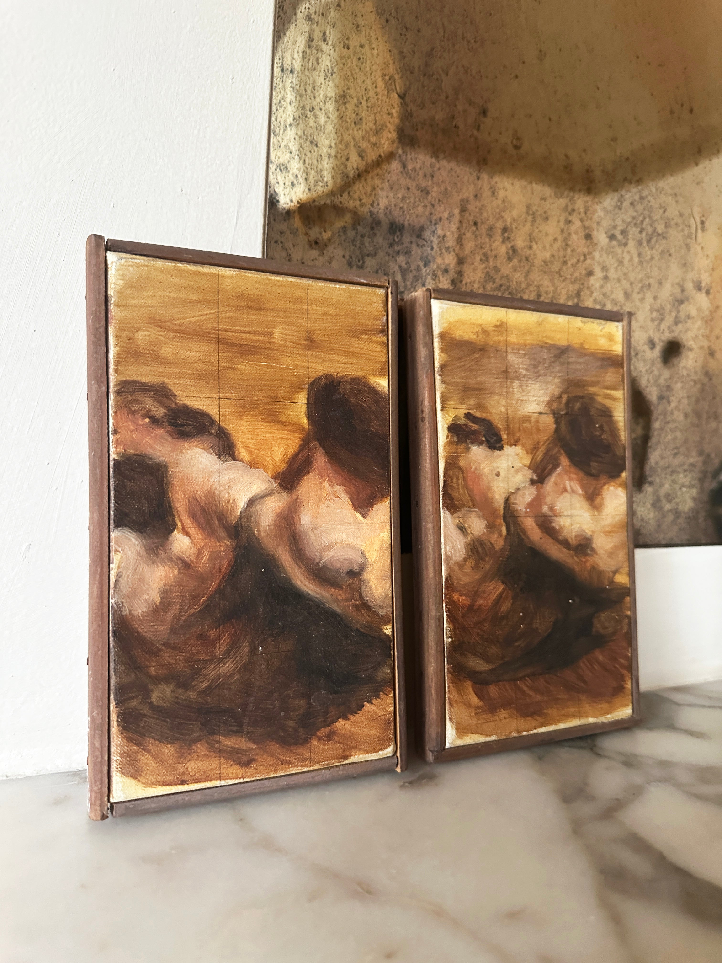 Size: 4.5" wide x 7.5" high x 0.75" deep / 11cm wide x 19cm deep x 2cm deep Origin: a pair of small vintage paintings by an unknown artist Material: oil on canvas in wood frames