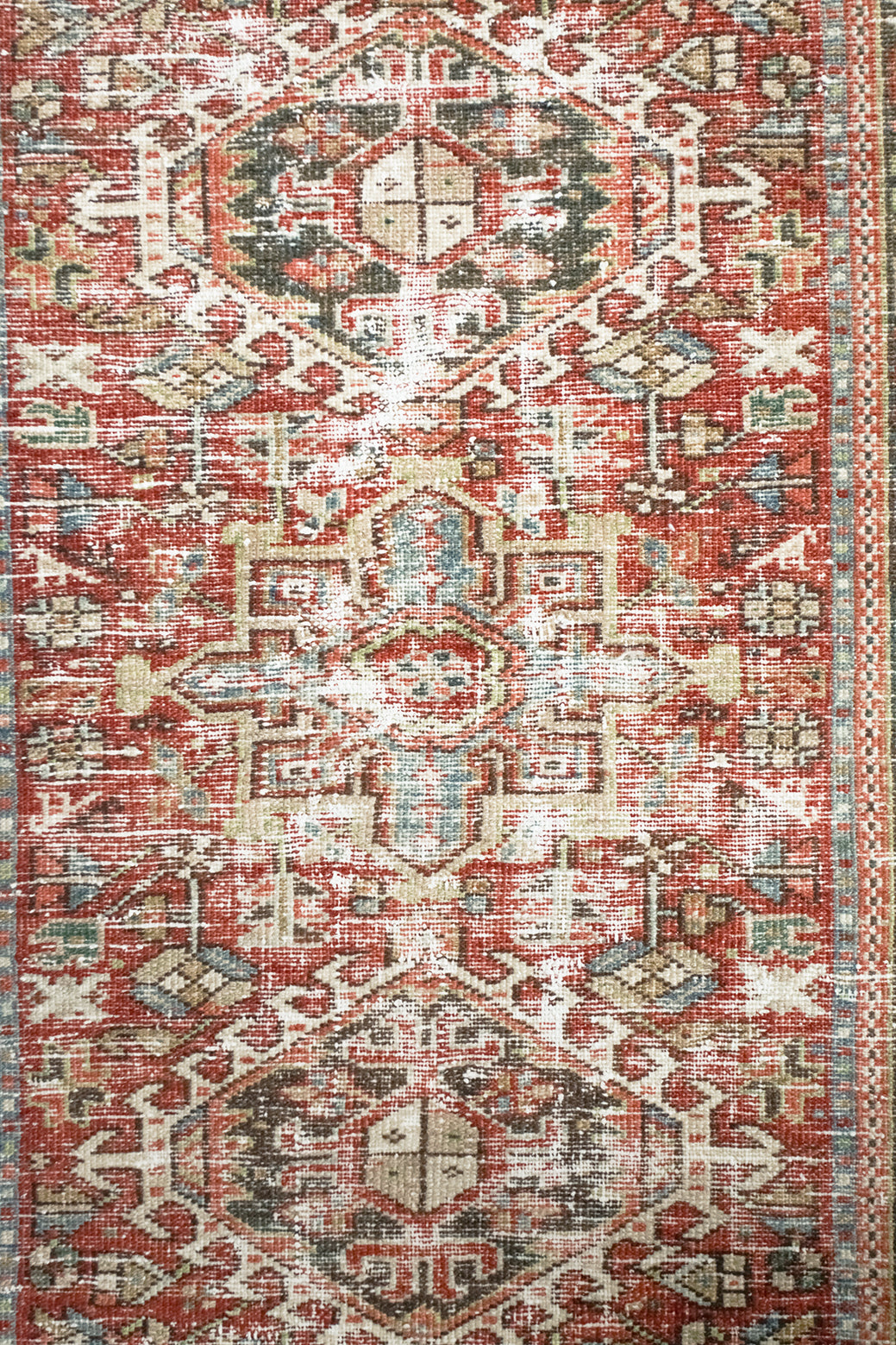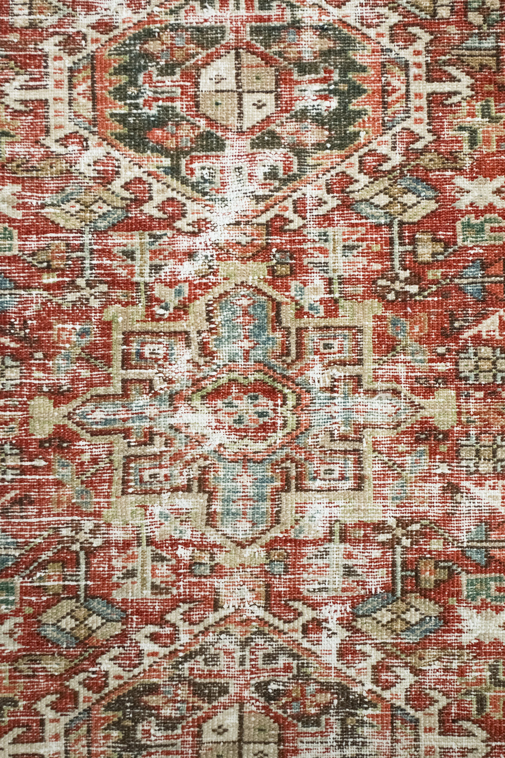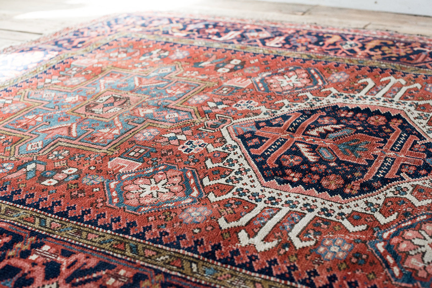 Karajah is a village just outside of Heriz, hence the visual similarities. It's said to be the oldest of all rug-weaving regions and is known for its hardwearing, all-wool carpets. Typically, the pattern comprises a coral-colored palette with three geometric medallions; two eight-pointed stars and a central medallion with latch-hooked contours (the white hooks surrounding navy blue in this case).