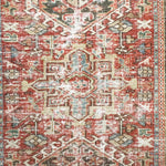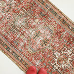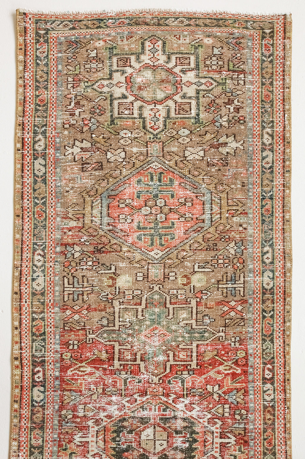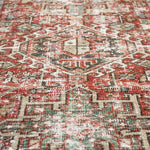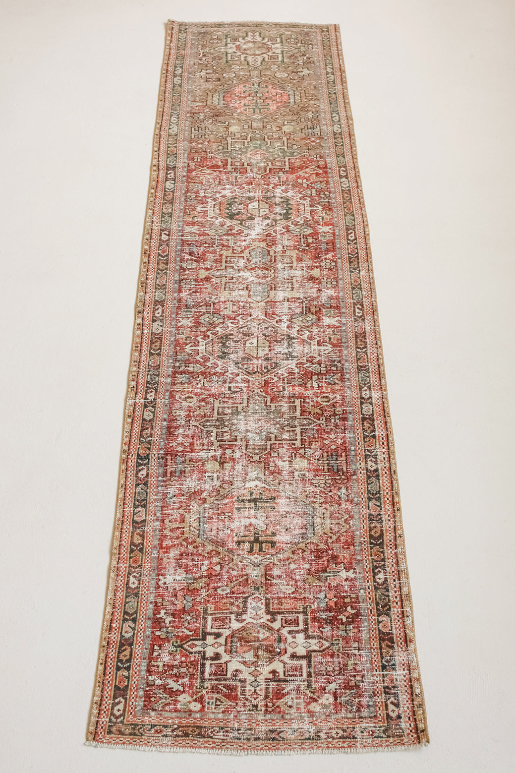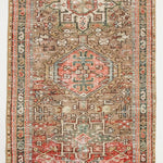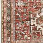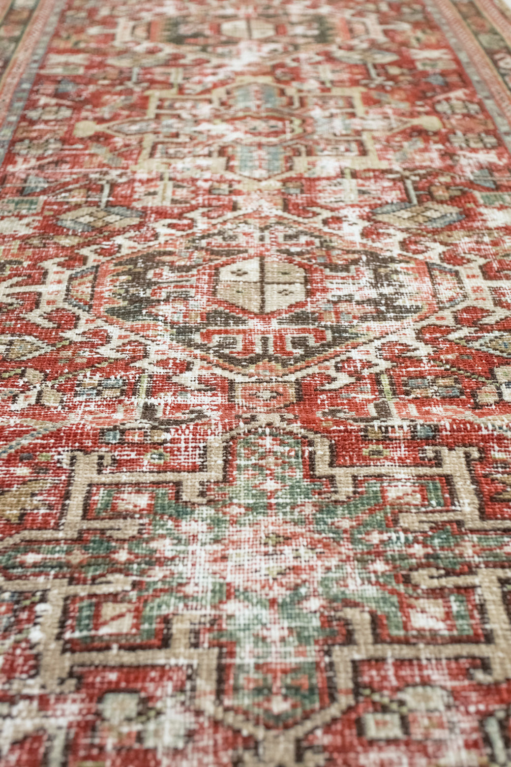 Karajah is a village just outside of Heriz, hence the visual similarities. It's said to be the oldest of all rug-weaving regions and is known for its hardwearing, all-wool carpets. Typically, the pattern comprises a coral-colored palette with three geometric medallions; two eight-pointed stars and a central medallion with latch-hooked contours (the white hooks surrounding navy blue in this case).