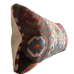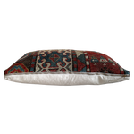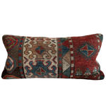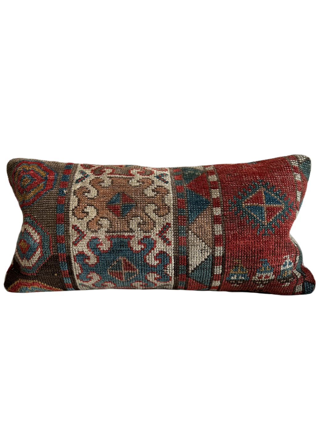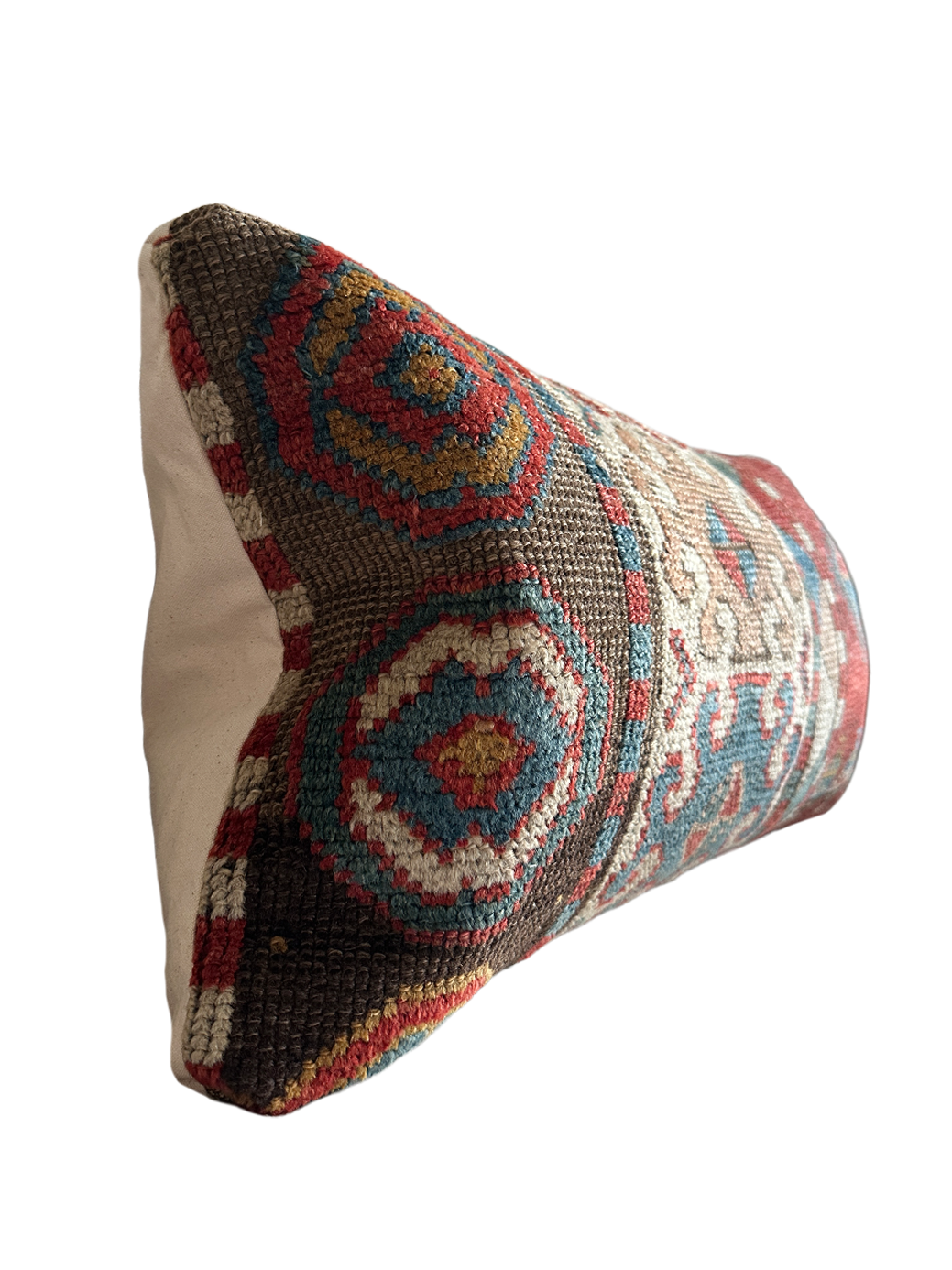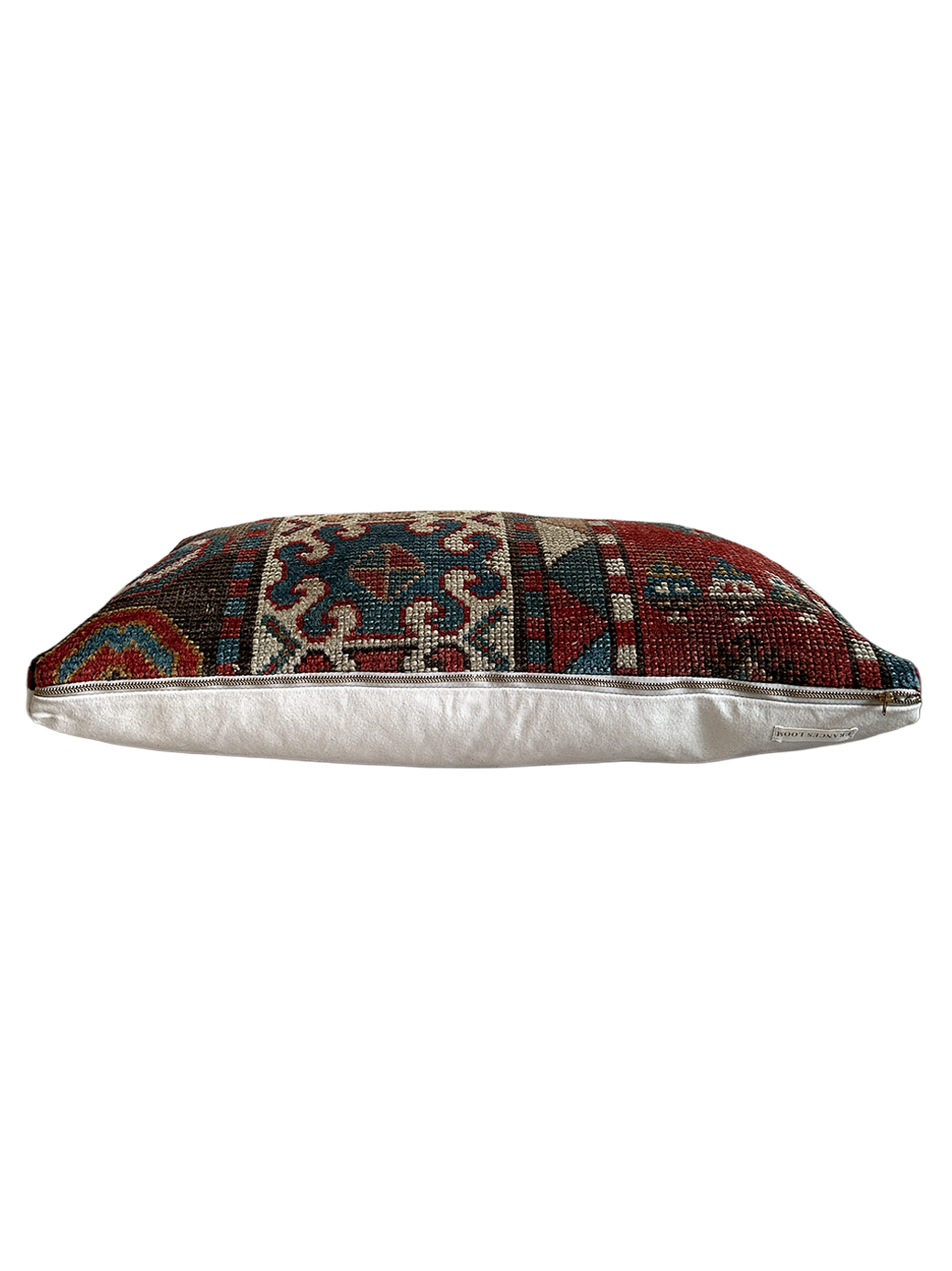 This pillow pairs a handwoven rug fragment with pure cotton canvas for a textured, timeless feel. It’s finished with a sturdy unlacquered brass zipper.