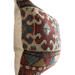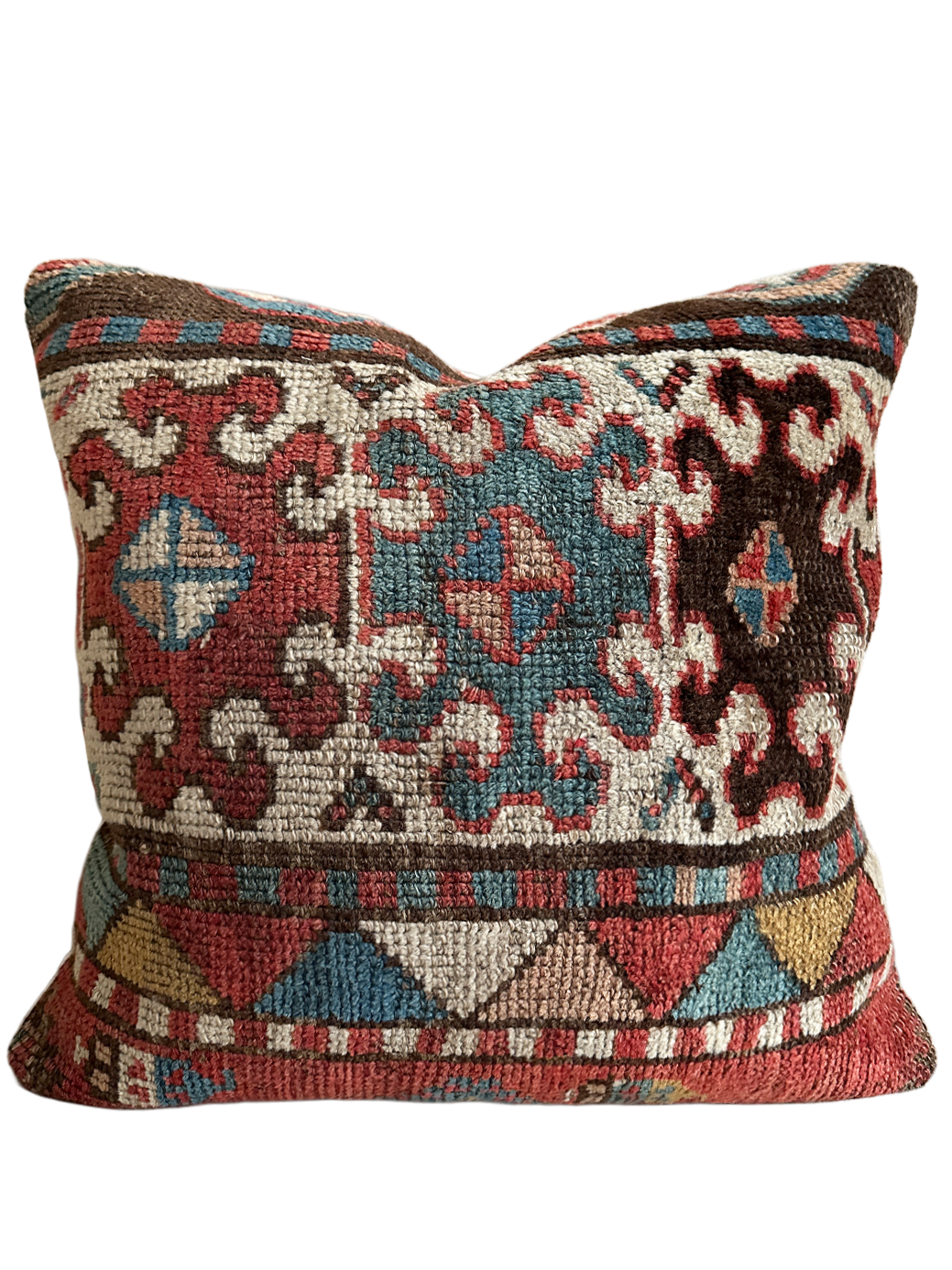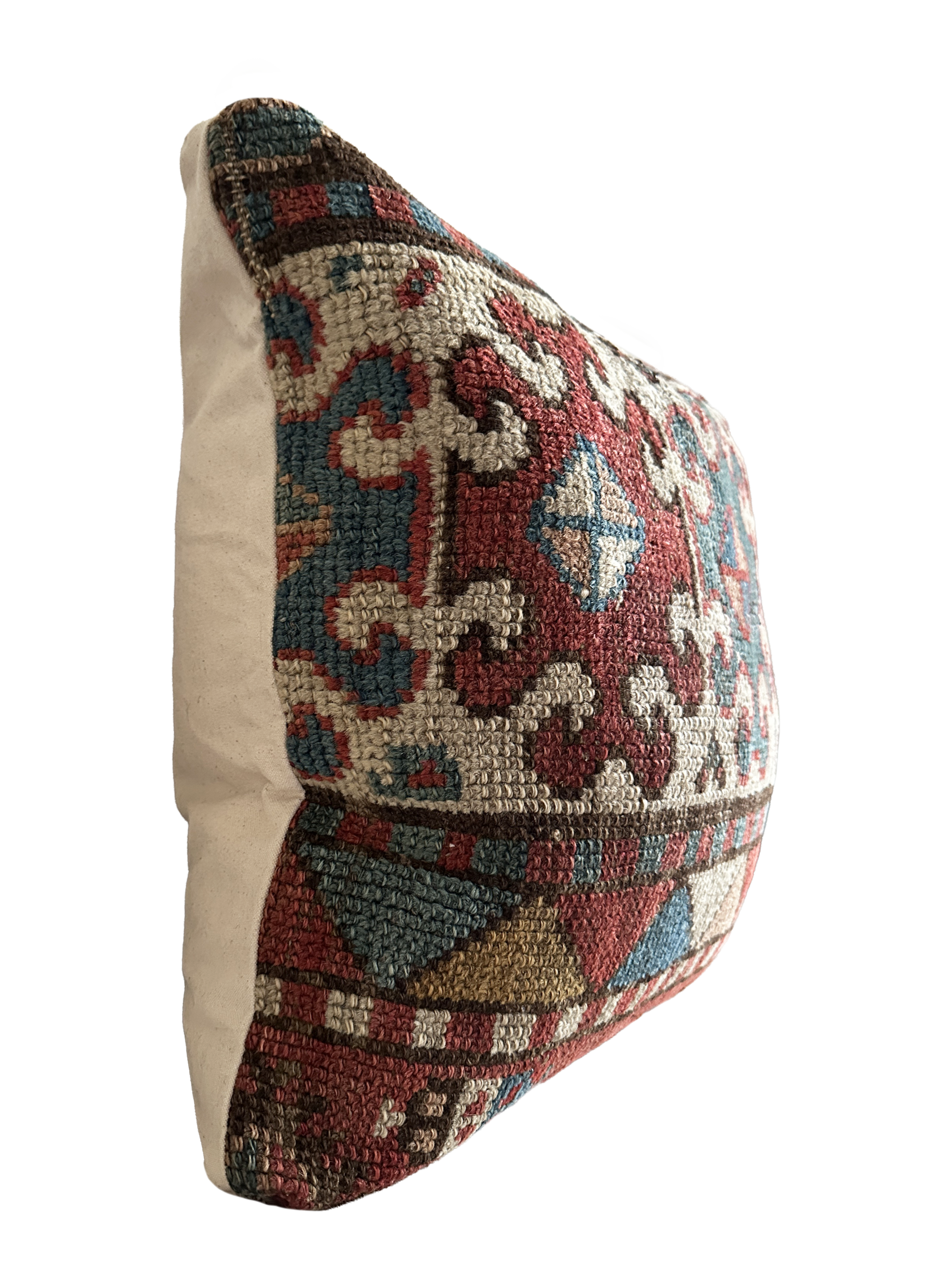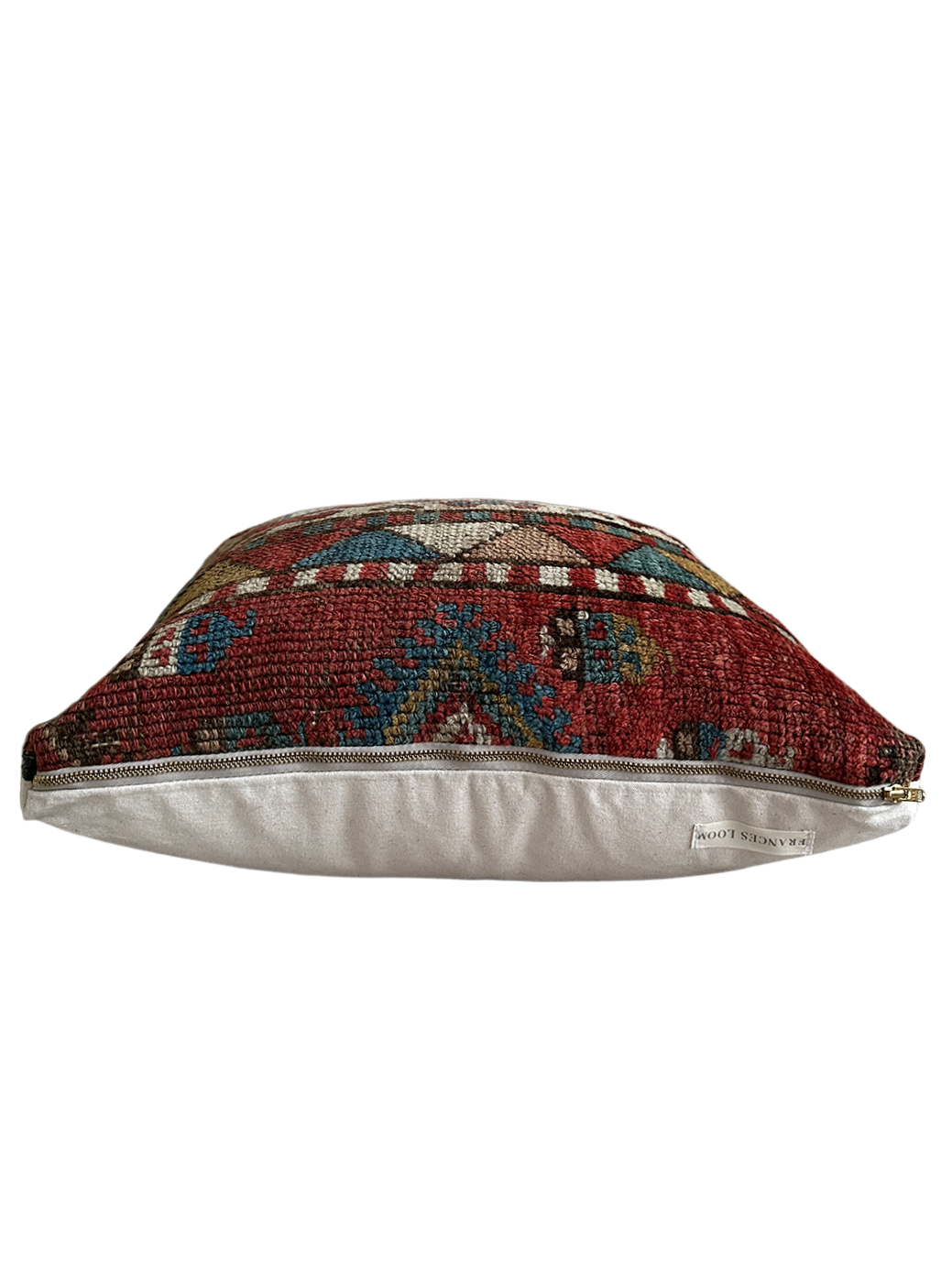 This pillow pairs a handwoven rug fragment with pure cotton canvas for a textured, timeless feel. It’s finished with a sturdy unlacquered brass zipper.