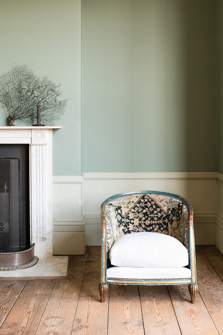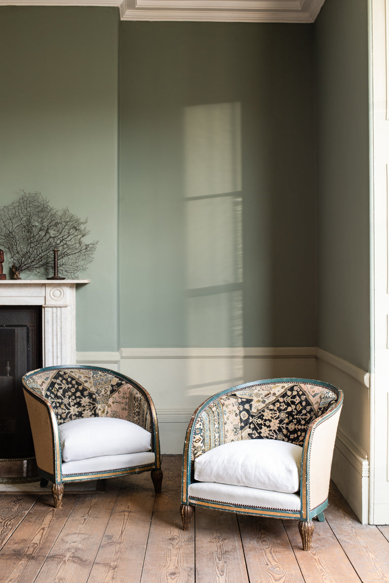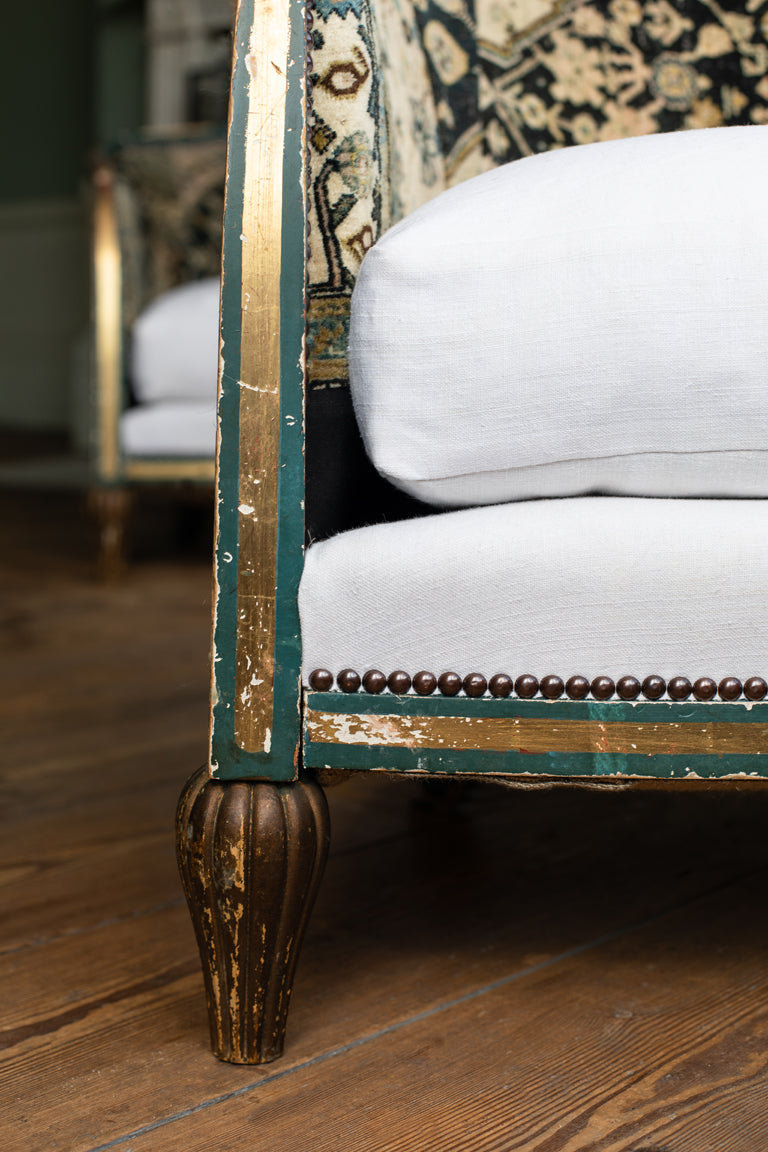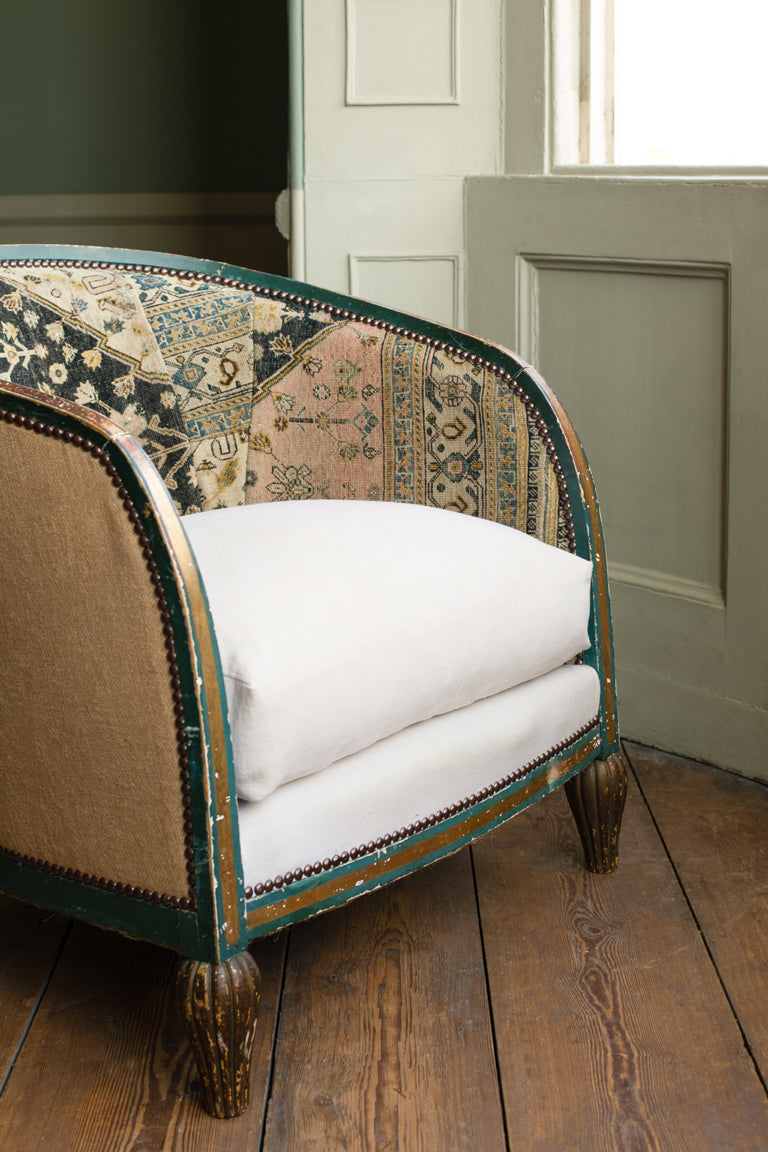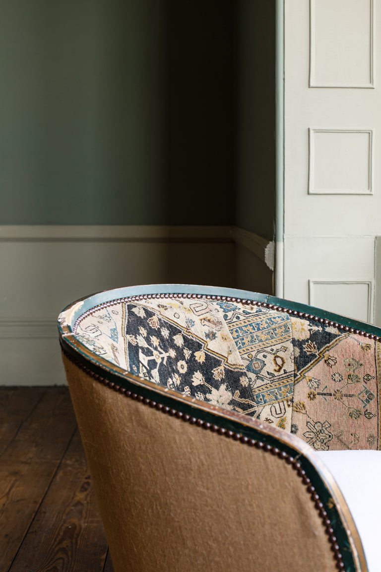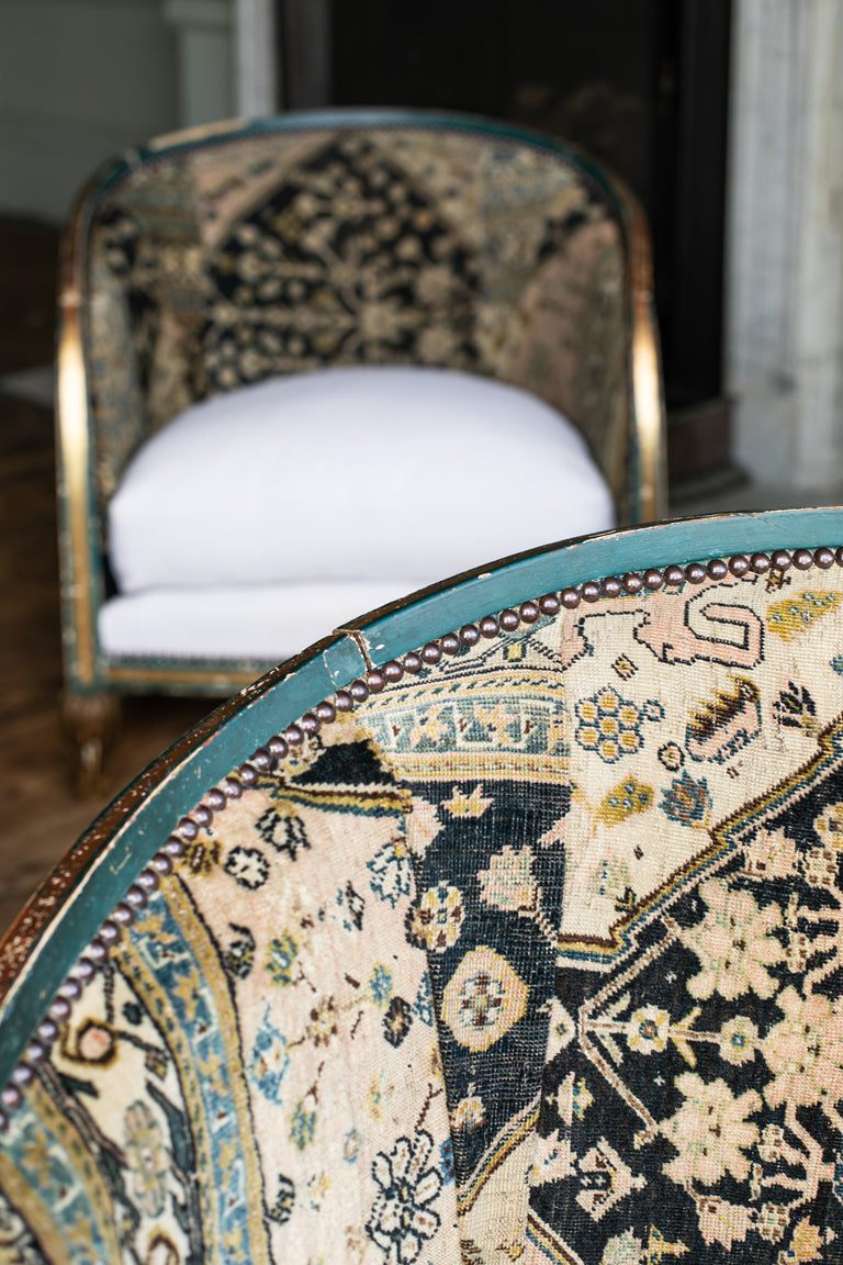Origin: An 1880 Qashqai rug paired with 1900's French chairs, and an antique French linen upholstered seat.