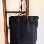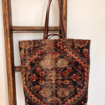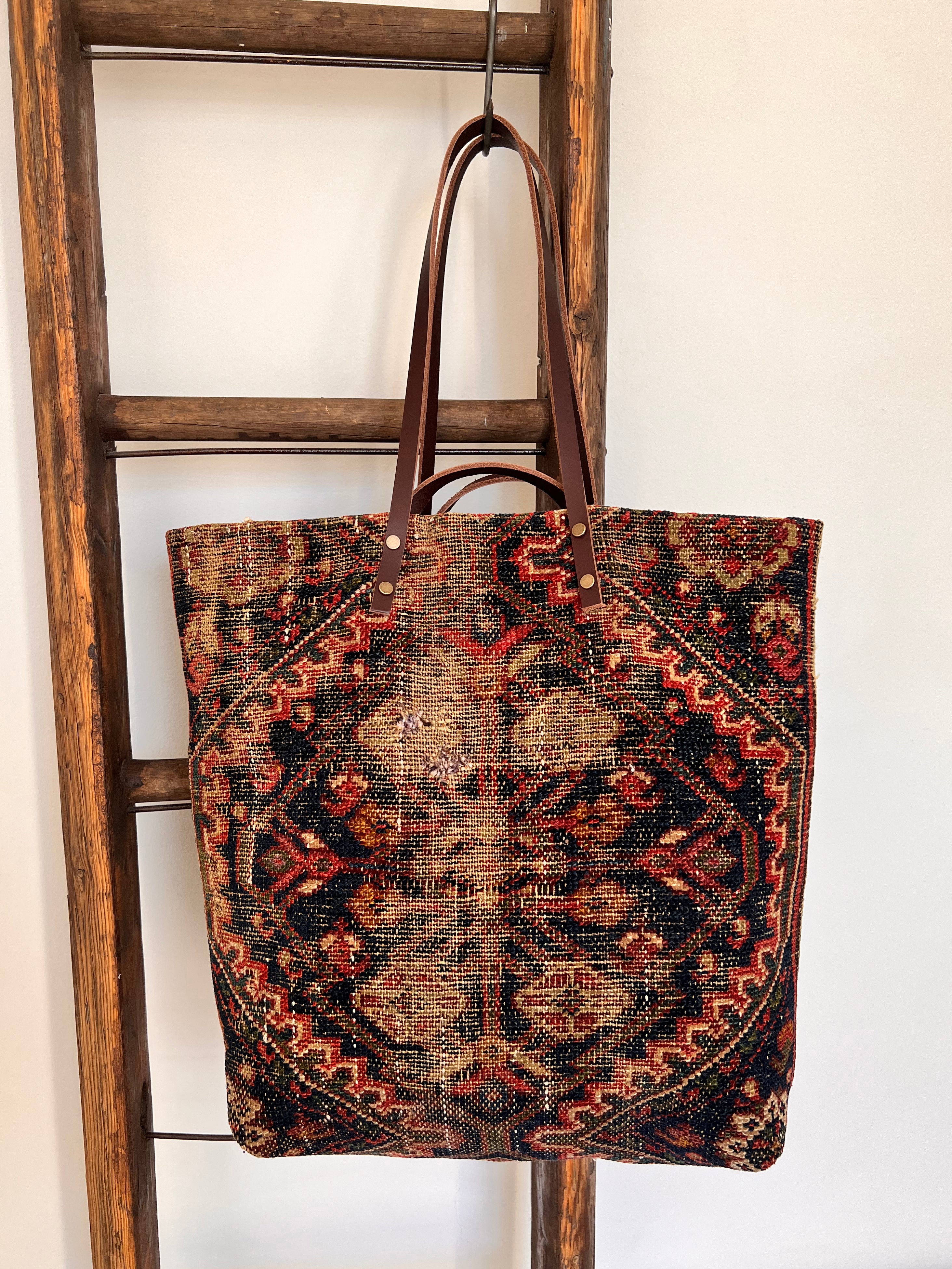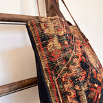 The front is a Malayer rug circa 1900, the back is navy suede leather. Each bag is fully lined in cotton and comes in a bespoke linen bag (we love using ours for laundry).