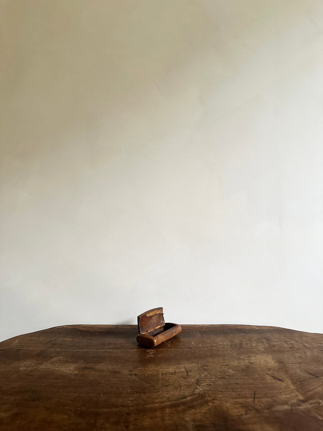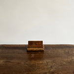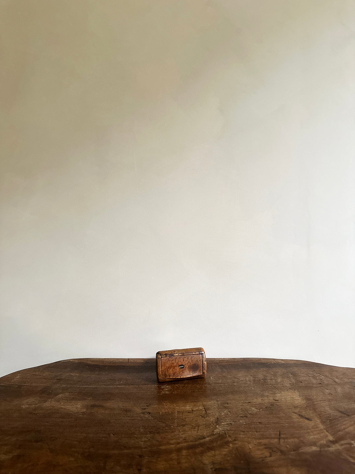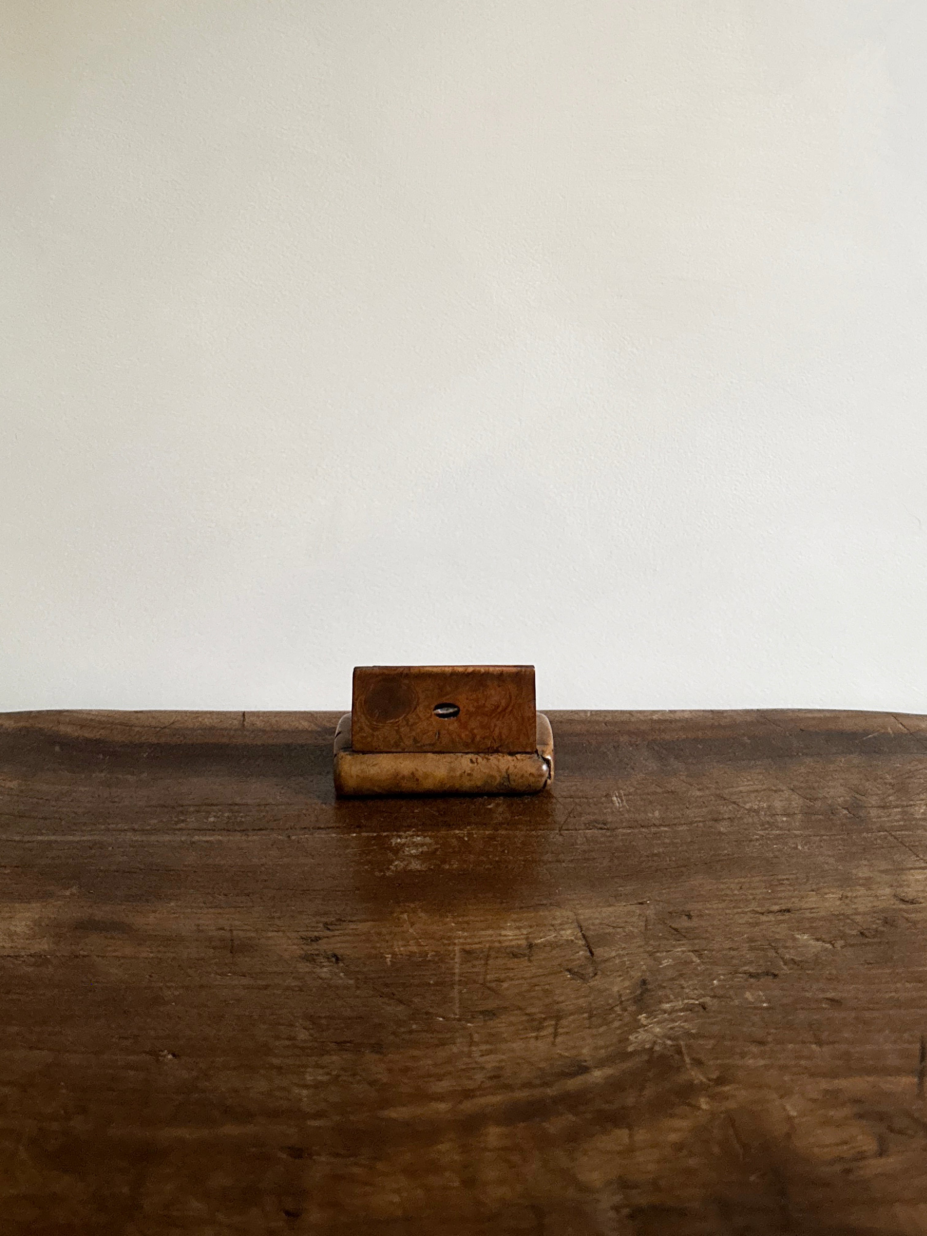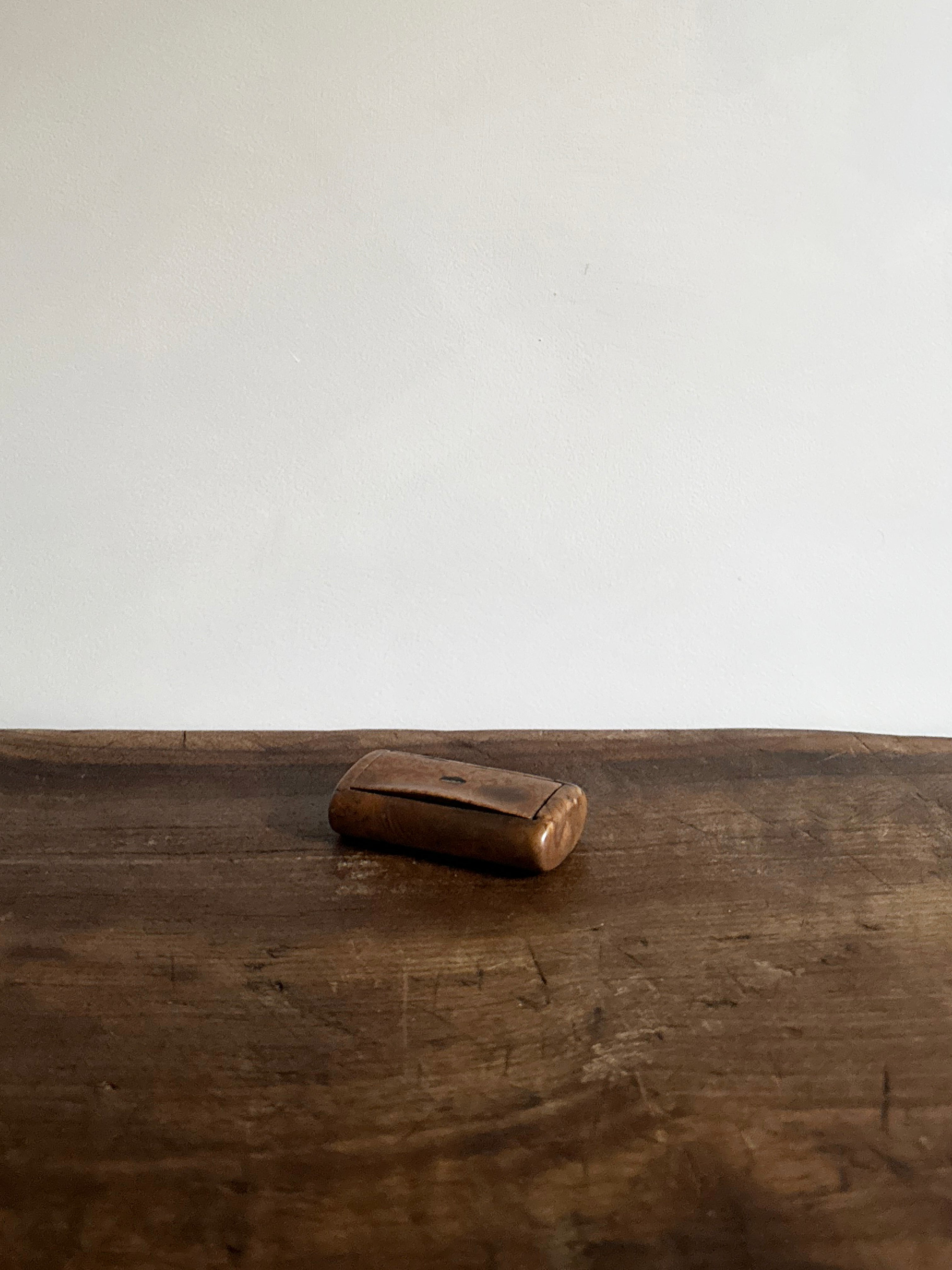Origin: an antique burl wood snuff box with decorative mother-of-pearl inlay. Size: 3.25" wide x 2" deep x 0.75" deep