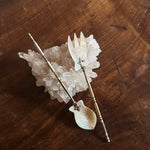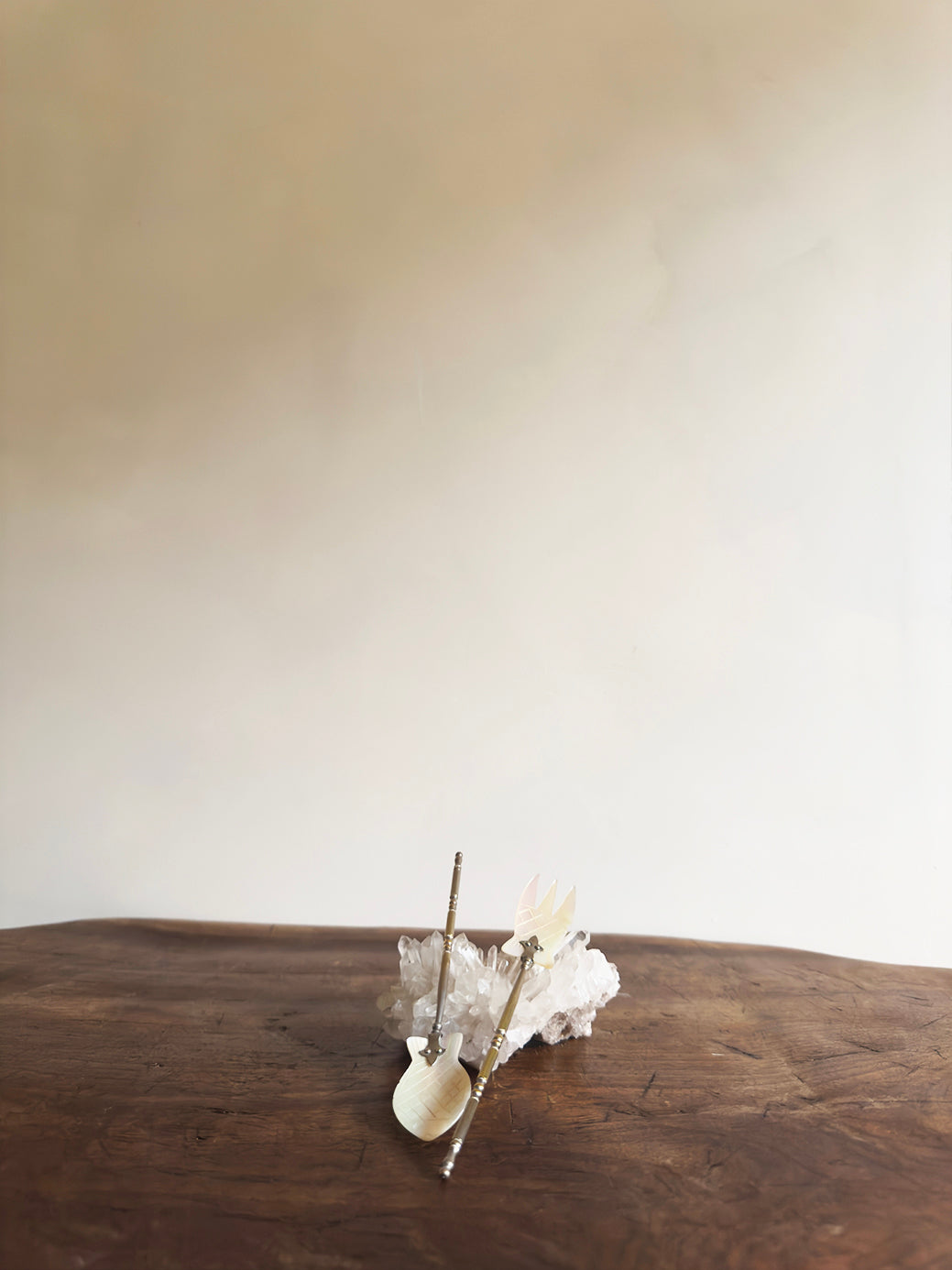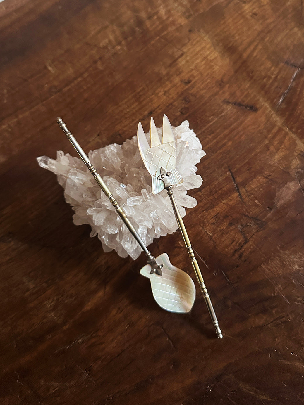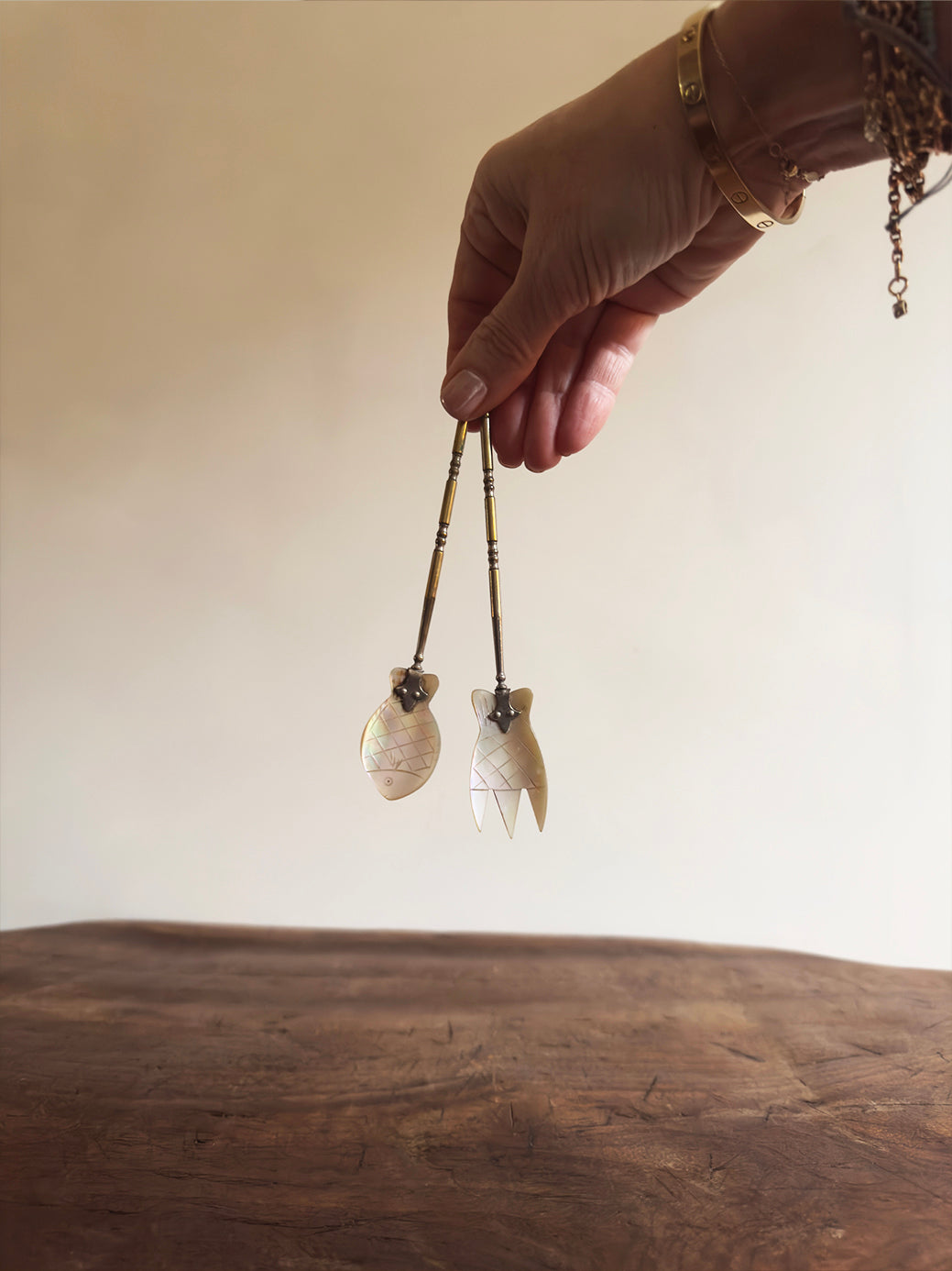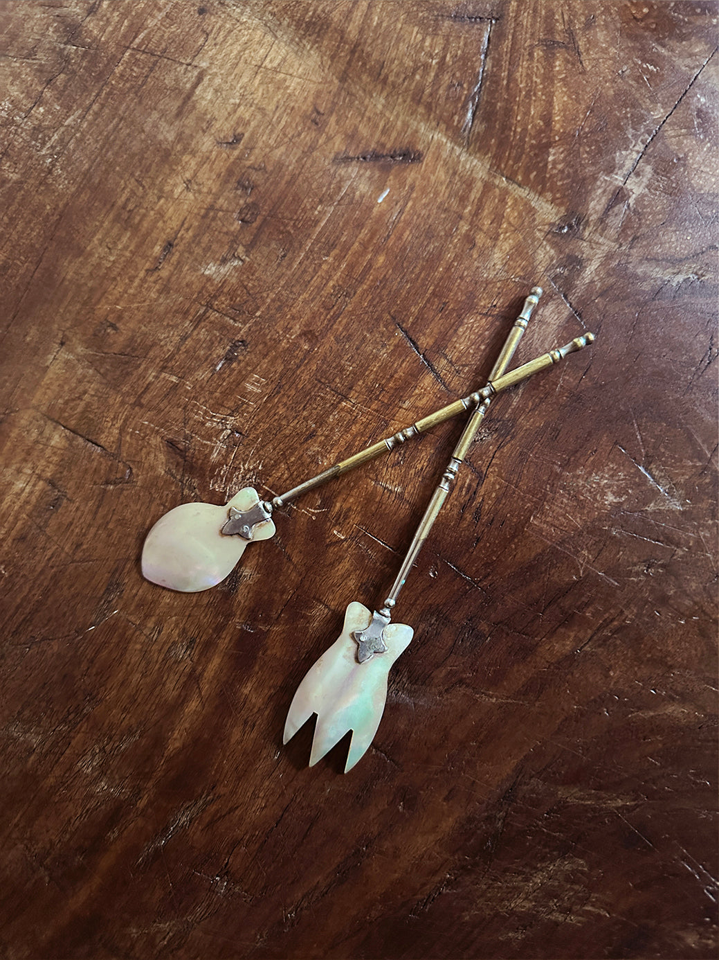 Origin: a set of antique Victorian caviar servers with silver-plated stems and engraved mother of pearl heads Size: 6" x 1" wide