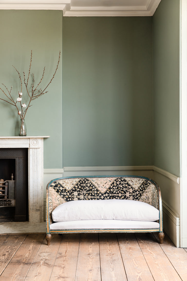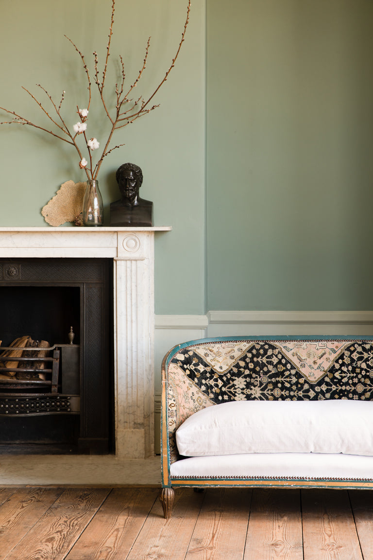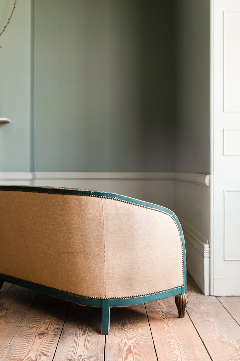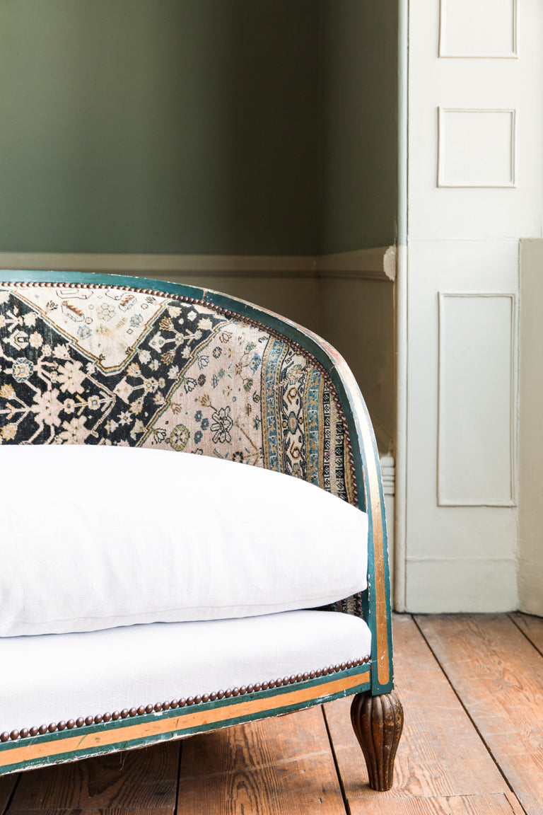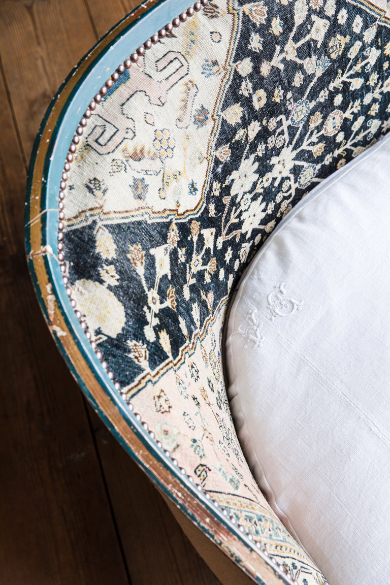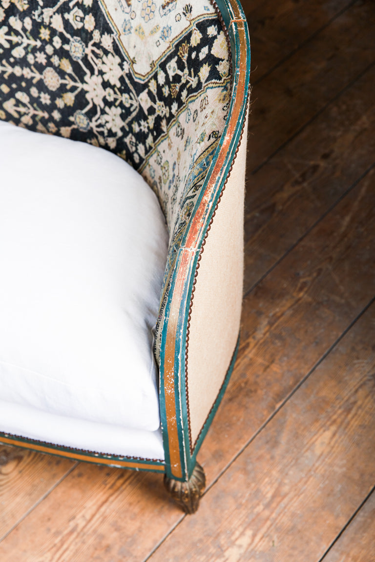 1880 Qashqai rug paired with a 1900's French sofa, and an antique French linen upholstered seat.